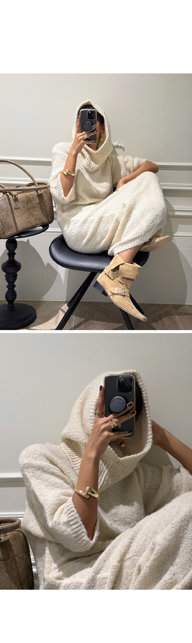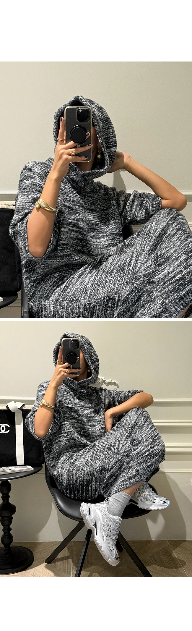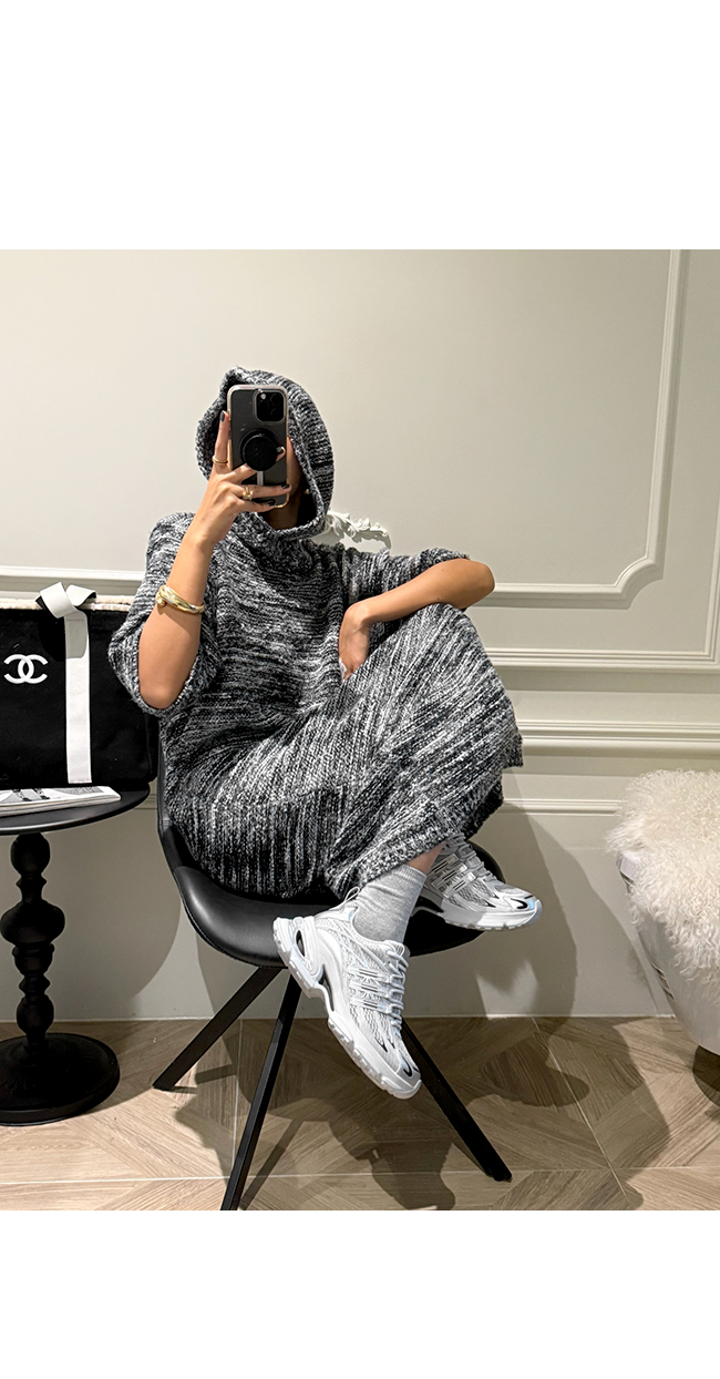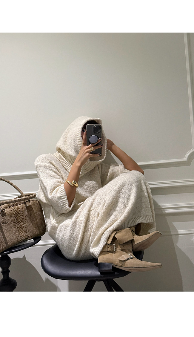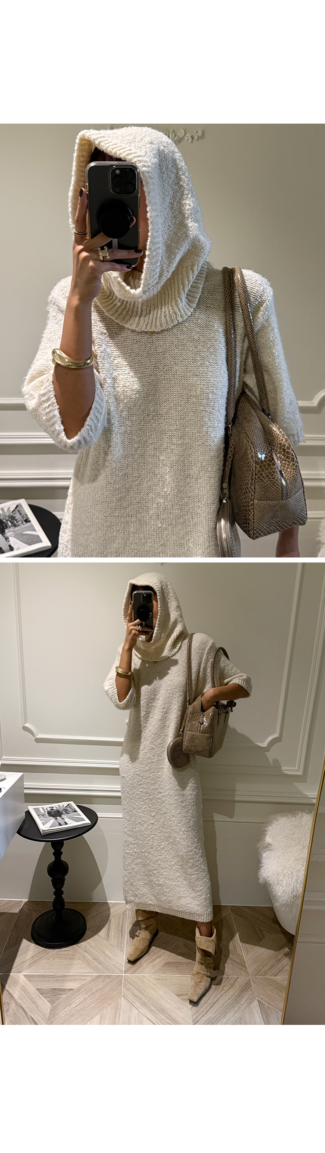 후드 형태의 바라클라바와 롱 니트 원피스가 세트로 구성되어