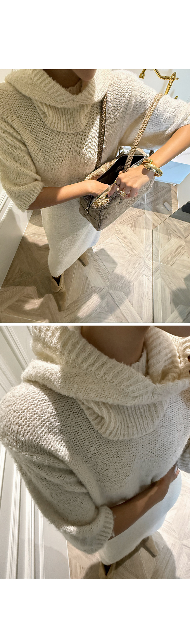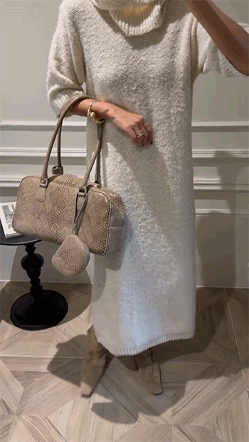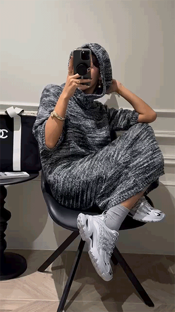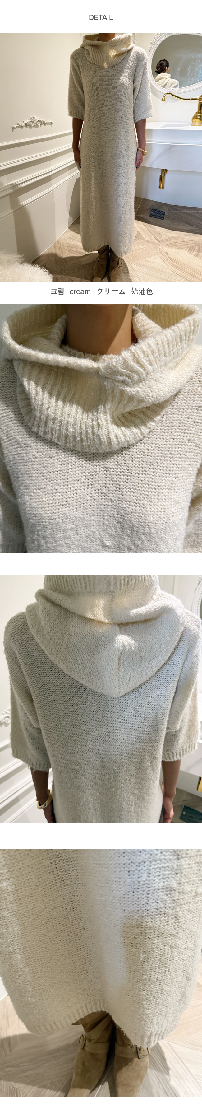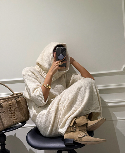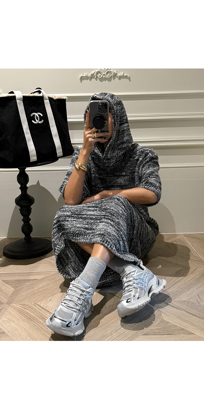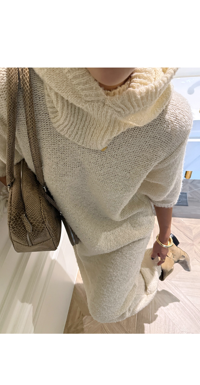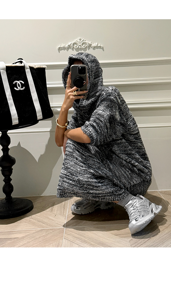 후드 형태의 바라클라바와 롱 니트 원피스가 세트로 구성되어