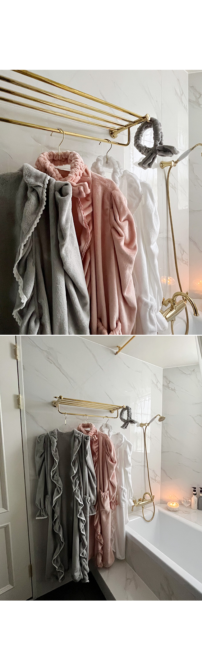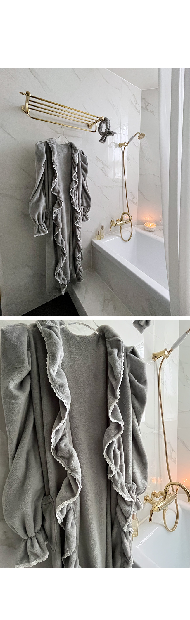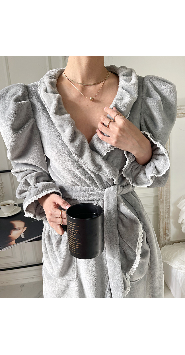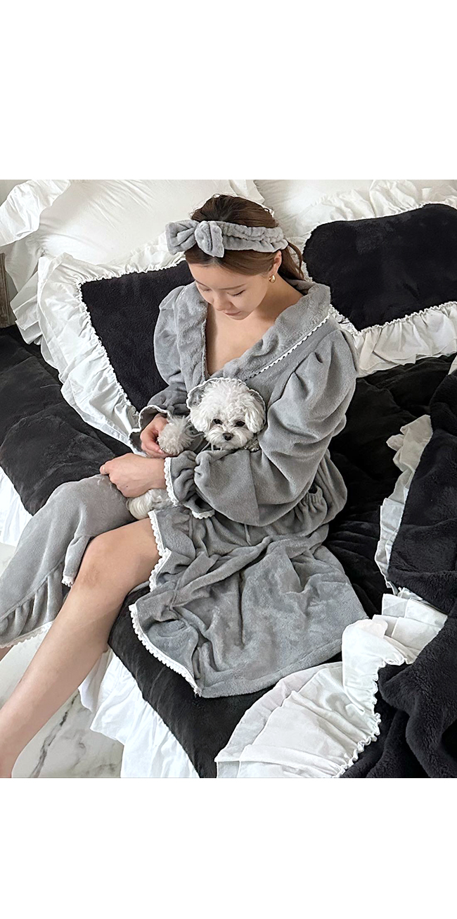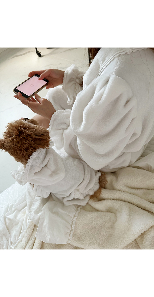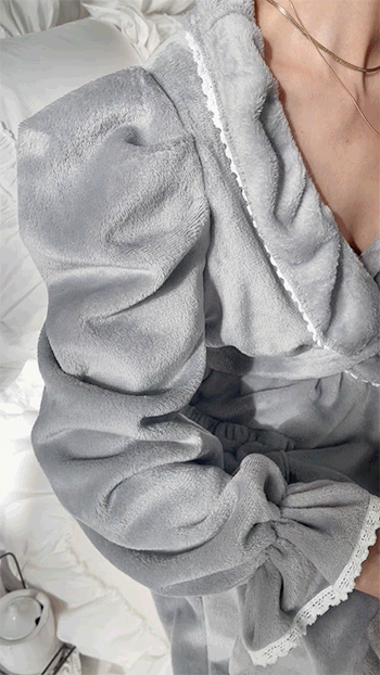 러블리한 디자인에 제가 너무너무 좋아하는 밍크 느낌의 수면잠옷 소재여서 보온성까지 갖춘 제품이예요. 수면잠옷도 소재마다 퀄리티가 있는거 아시쥬? 다 같은 수면잠옷이 아니더라구요. ㅎ 이 가운에 사용된 소재는 퀄리티가 높은 수면잠옷 소재로 약간의 광택감과 함께 부드럽고 포근한 촉감이 뽀인트인 제품으로 툭 걸쳐만 주어도 사르르르 녹아버리는 듯한 부드러움과 따뜻함이 기분전환 하기에 너무 좋아요! 요즘 아무리 난방이 잘된다 하더라고 쌀쌀할때 있잖아요- 그럴때 툭 걸쳐주기만 해도 난방 온도를 더 내릴정도로 따뜻해서 겨울에 보일러값 절감에도 도움이 될거같은거 있죠?ㅎㅎ 가운도 그냥 가운이 아닌 네프호텔의 러블리함과 줄로그의 빈티지한 느낌이 더해져 흔하지 않은 유니크함까지 더해주어 연말 친구들과 호텔 놀러갈때 하나씩 다른칼라로 챙겨가서 예쁜 추억을 만들어 보셔도 좋을거같아요! 머리띠는 필수인거 아시쥬?ㅎ 볼륨감이 느껴지는 퍼프 소매는 물론이고 손목, 넥라인을 따라 러블리하게 달려있는 프릴디테일이 러블리한 여자로 변신시켜주는데요, 프릴 끝단에도 레이스 리본 원단으로 덧데어주어 일반 홈웨어와는 또 다른 느낌으로 기분 전환 하기에도 좋아요. 디자인도, 소재도 너무 만족스러웠던 제품으로 나 자신을 위한 선물로도 좋구요, 사랑하는 지인들을 위한 선물로도 추천드려요.