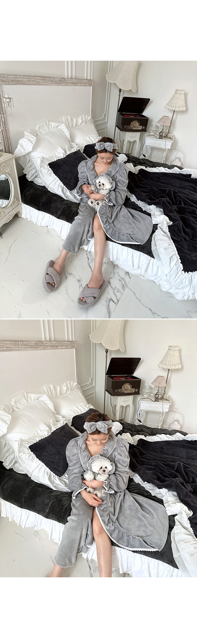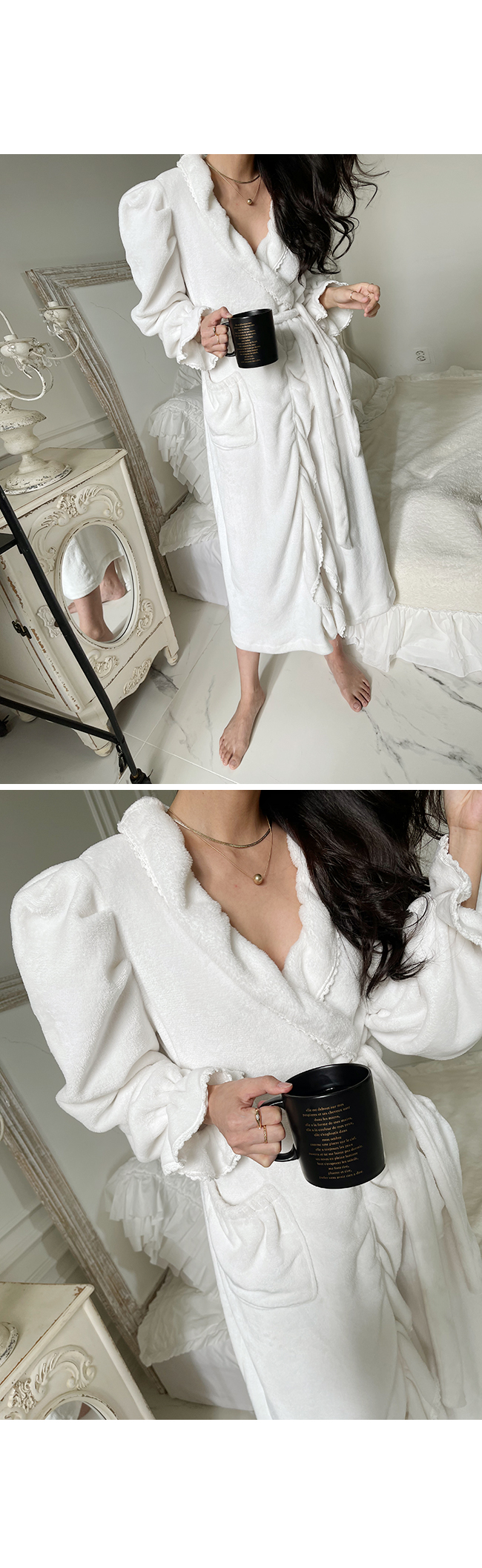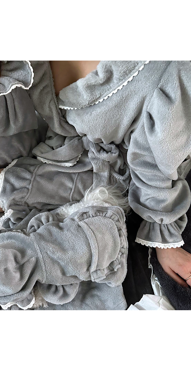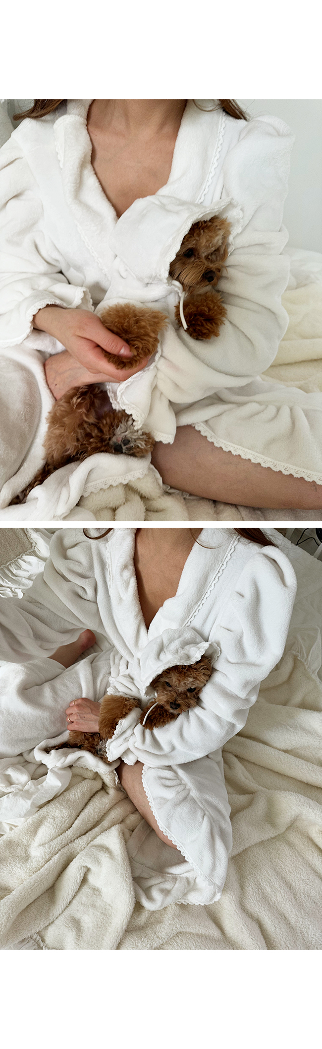 러블리한 디자인에 제가 너무너무 좋아하는 밍크 느낌의 수면잠옷 소재여서 보온성까지 갖춘 제품이예요. 수면잠옷도 소재마다 퀄리티가 있는거 아시쥬? 다 같은 수면잠옷이 아니더라구요. ㅎ 이 가운에 사용된 소재는 퀄리티가 높은 수면잠옷 소재로 약간의 광택감과 함께 부드럽고 포근한 촉감이 뽀인트인 제품으로 툭 걸쳐만 주어도 사르르르 녹아버리는 듯한 부드러움과 따뜻함이 기분전환 하기에 너무 좋아요! 요즘 아무리 난방이 잘된다 하더라고 쌀쌀할때 있잖아요- 그럴때 툭 걸쳐주기만 해도 난방 온도를 더 내릴정도로 따뜻해서 겨울에 보일러값 절감에도 도움이 될거같은거 있죠?ㅎㅎ 가운도 그냥 가운이 아닌 네프호텔의 러블리함과 줄로그의 빈티지한 느낌이 더해져 흔하지 않은 유니크함까지 더해주어 연말 친구들과 호텔 놀러갈때 하나씩 다른칼라로 챙겨가서 예쁜 추억을 만들어 보셔도 좋을거같아요! 머리띠는 필수인거 아시쥬?ㅎ 볼륨감이 느껴지는 퍼프 소매는 물론이고 손목, 넥라인을 따라 러블리하게 달려있는 프릴디테일이 러블리한 여자로 변신시켜주는데요, 프릴 끝단에도 레이스 리본 원단으로 덧데어주어 일반 홈웨어와는 또 다른 느낌으로 기분 전환 하기에도 좋아요. 디자인도, 소재도 너무 만족스러웠던 제품으로 나 자신을 위한 선물로도 좋구요, 사랑하는 지인들을 위한 선물로도 추천드려요.