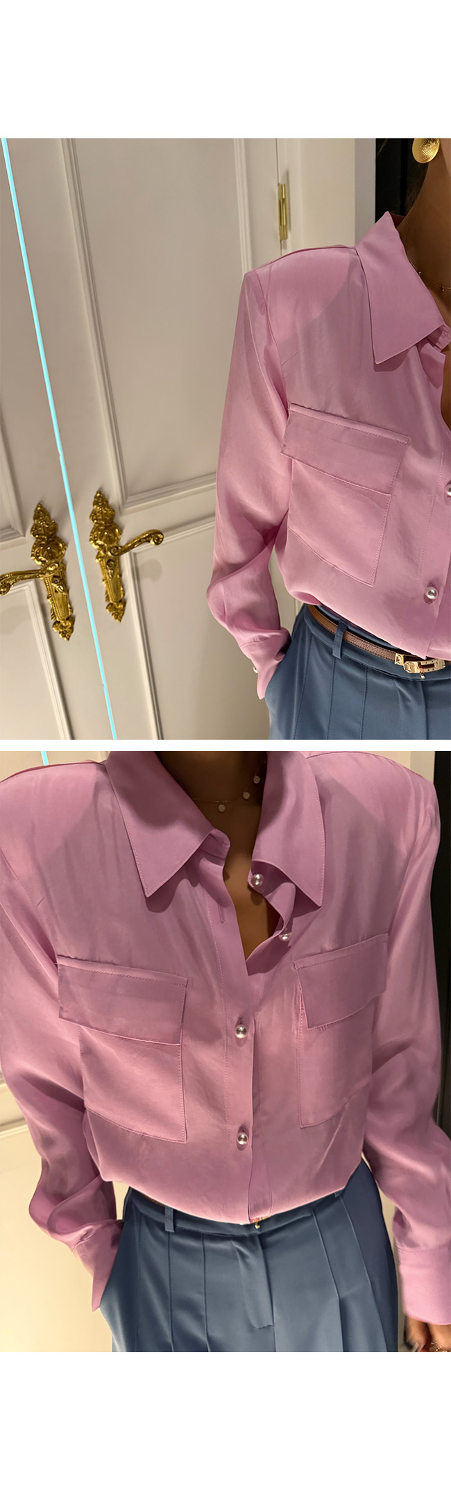 어깨 패드로 세련된 엣지포인트가 되어 예쁜핏이 연출되며