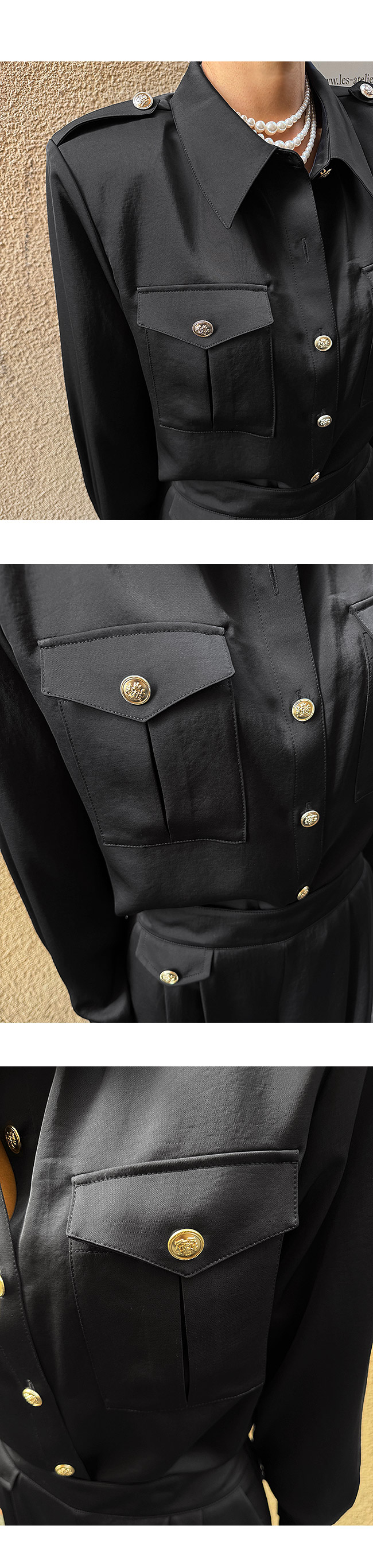 소매는 버튼 여밈으로 안정감 있게 마무리되며,