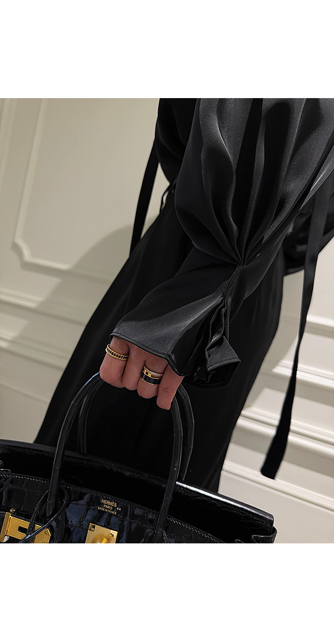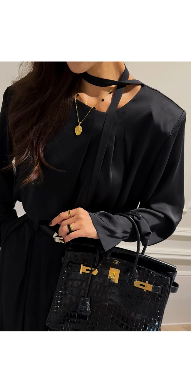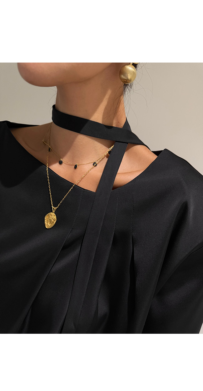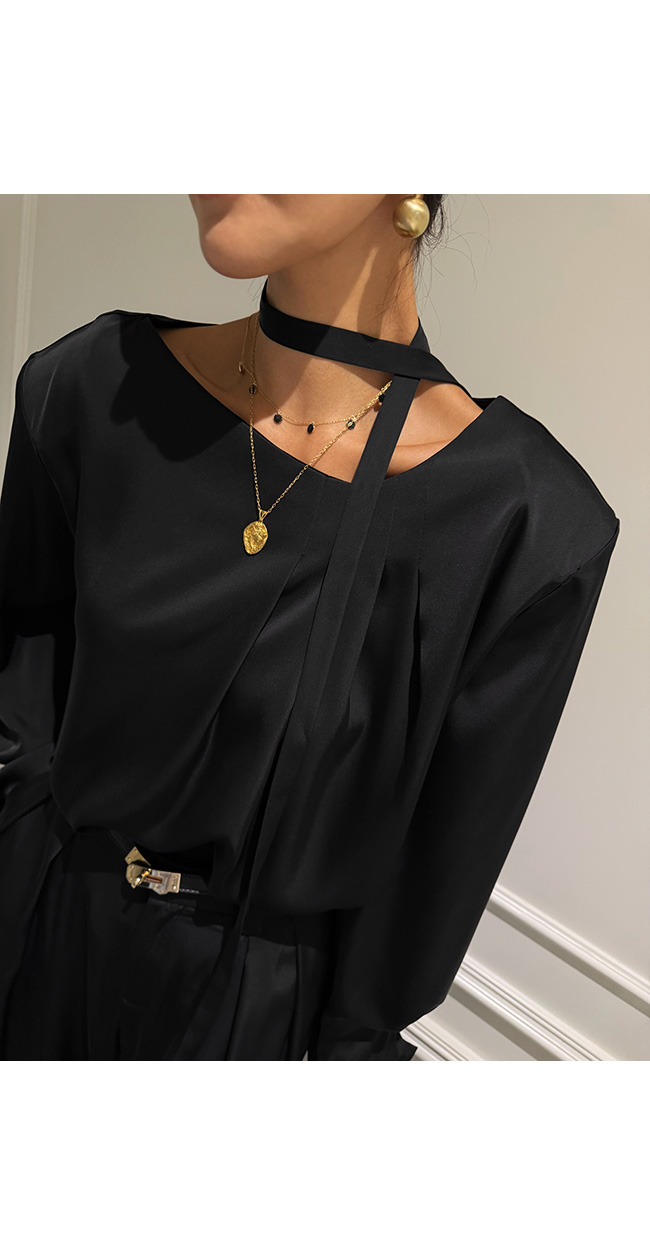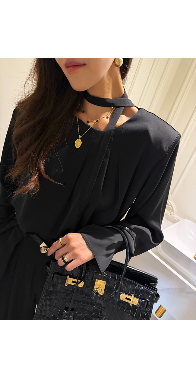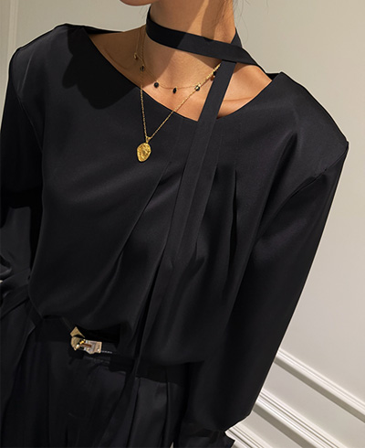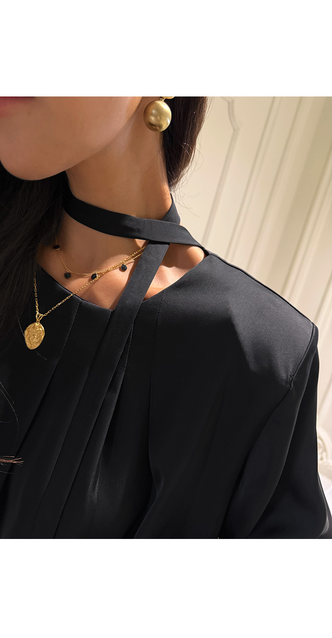 네크라인에서 자연스럽게 이어지는 스트랩 디테일이 포인트로,