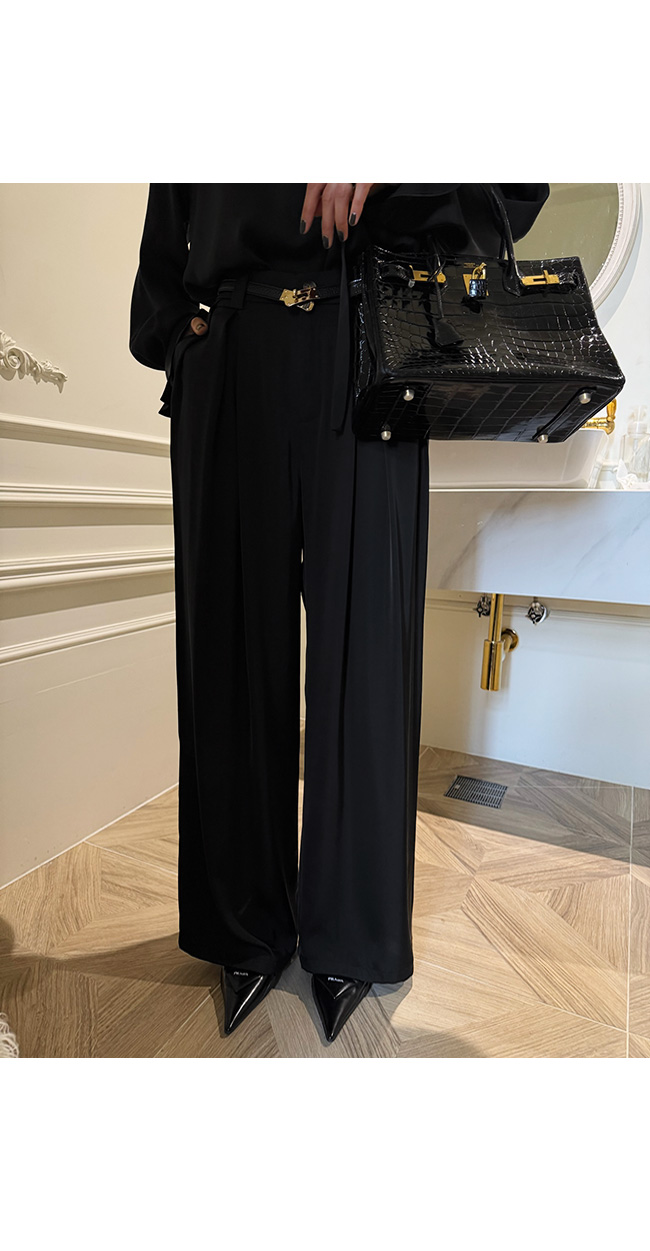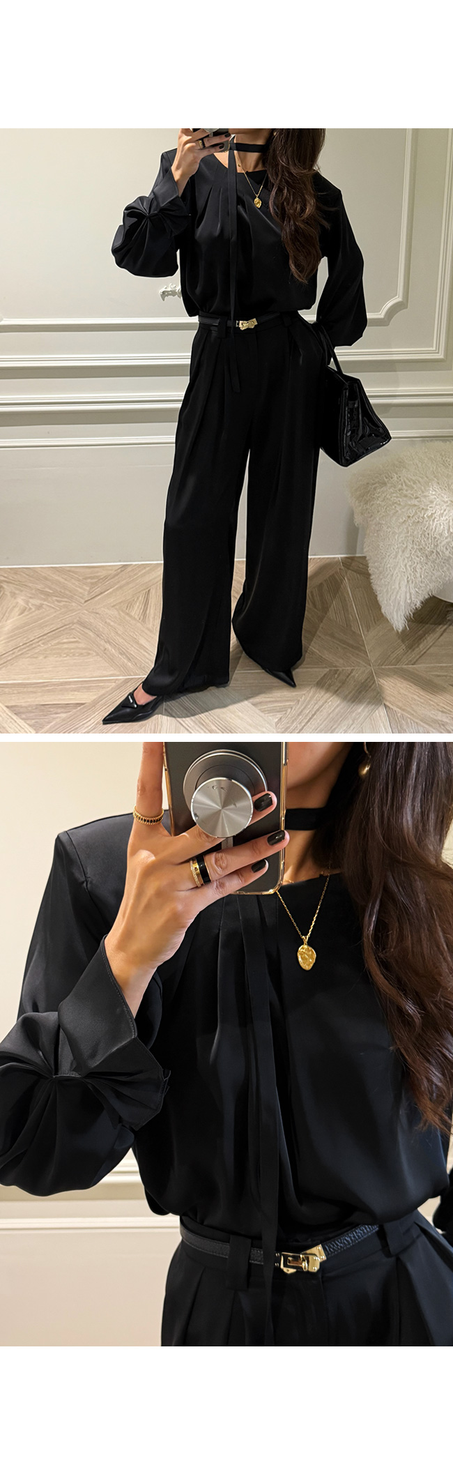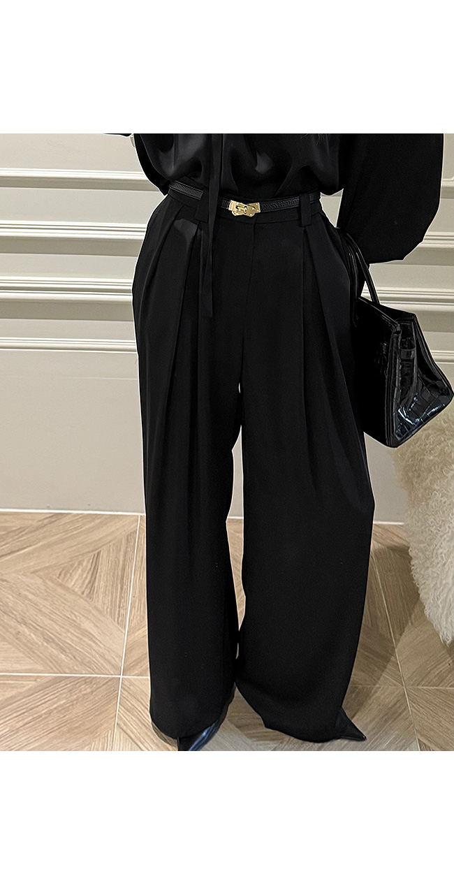 하의는 허리 라인을 안정감 있게 잡아주는 핀턱 와이드 팬츠로,