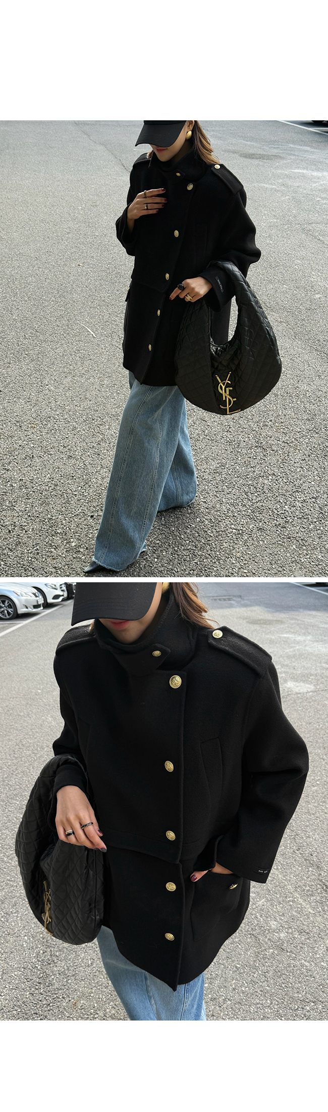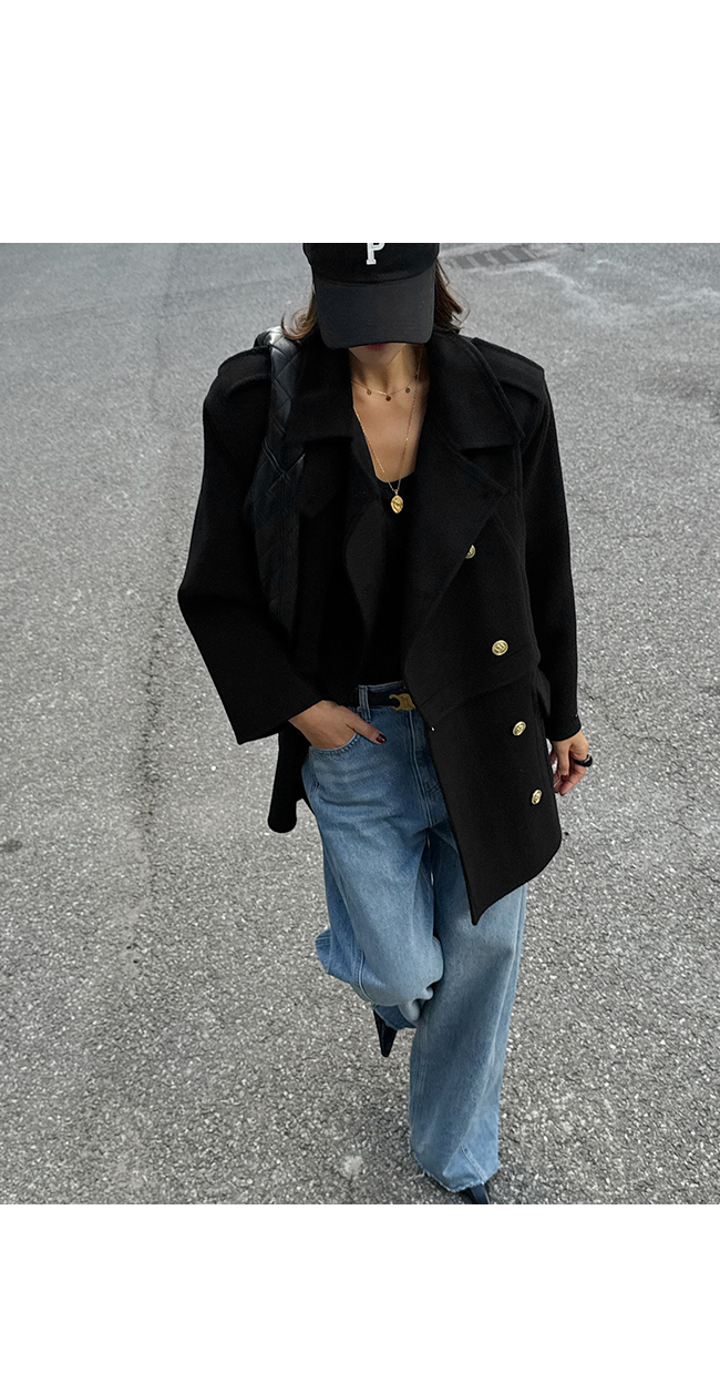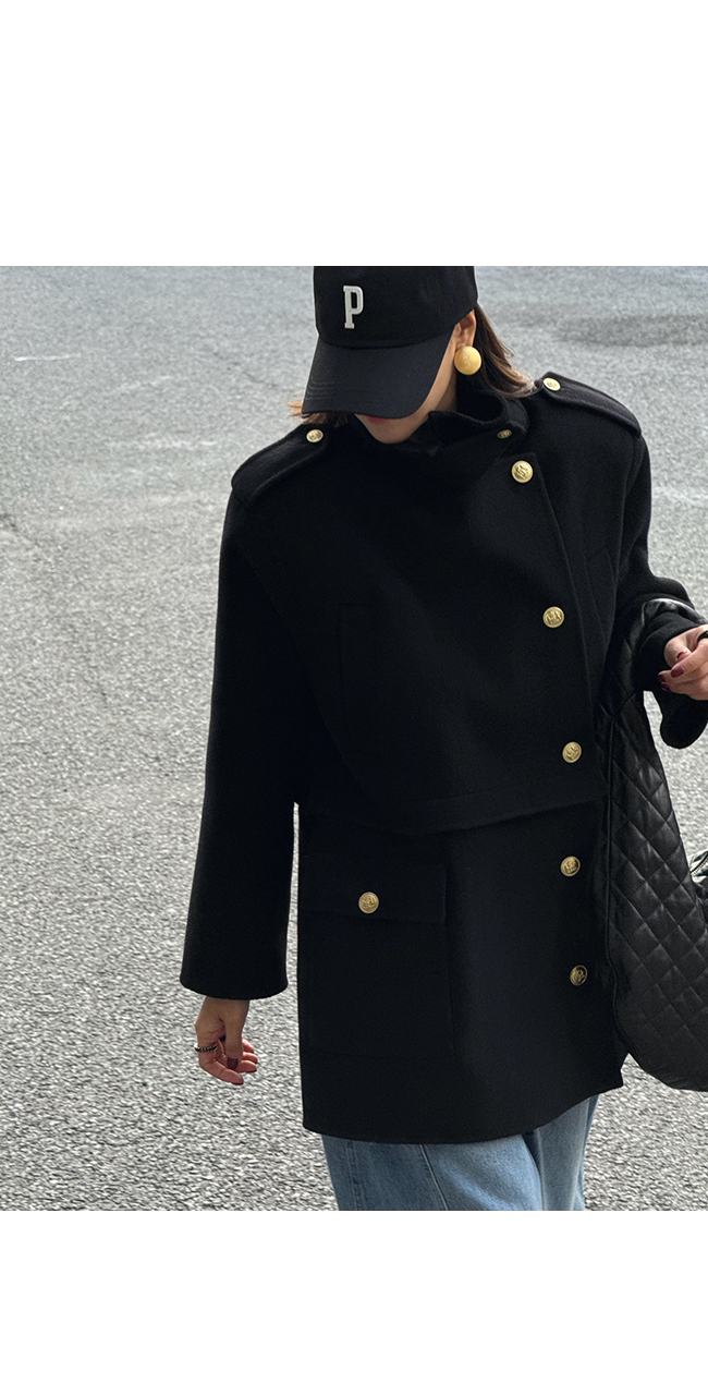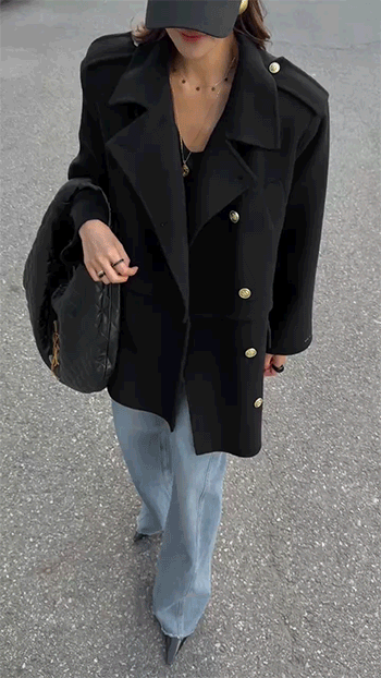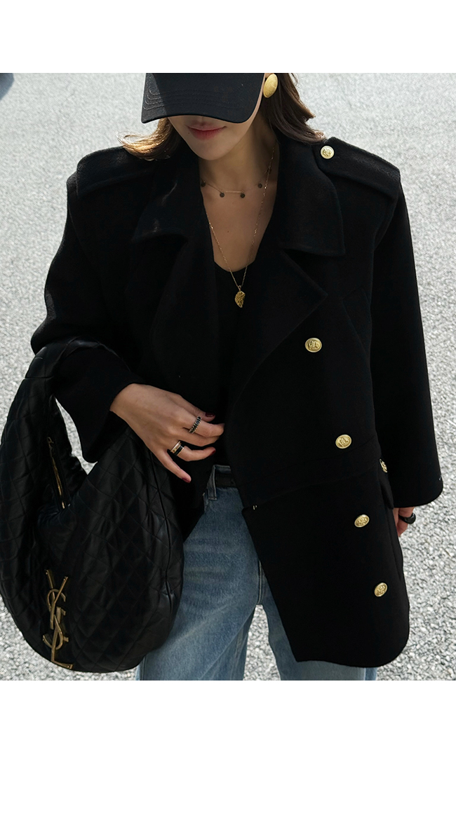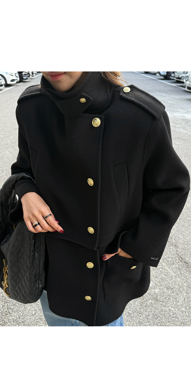 골드 버튼 디테일과 어깨 견장 장식이 더해져