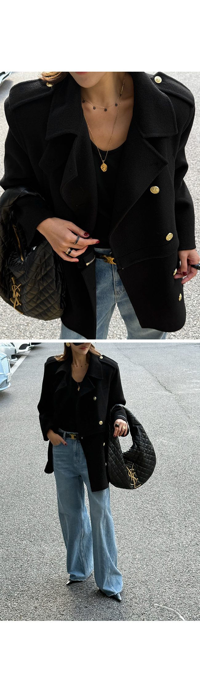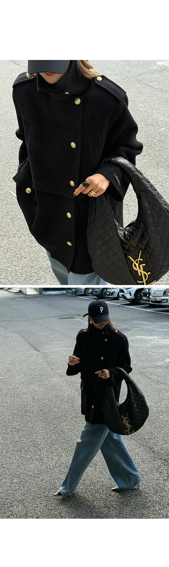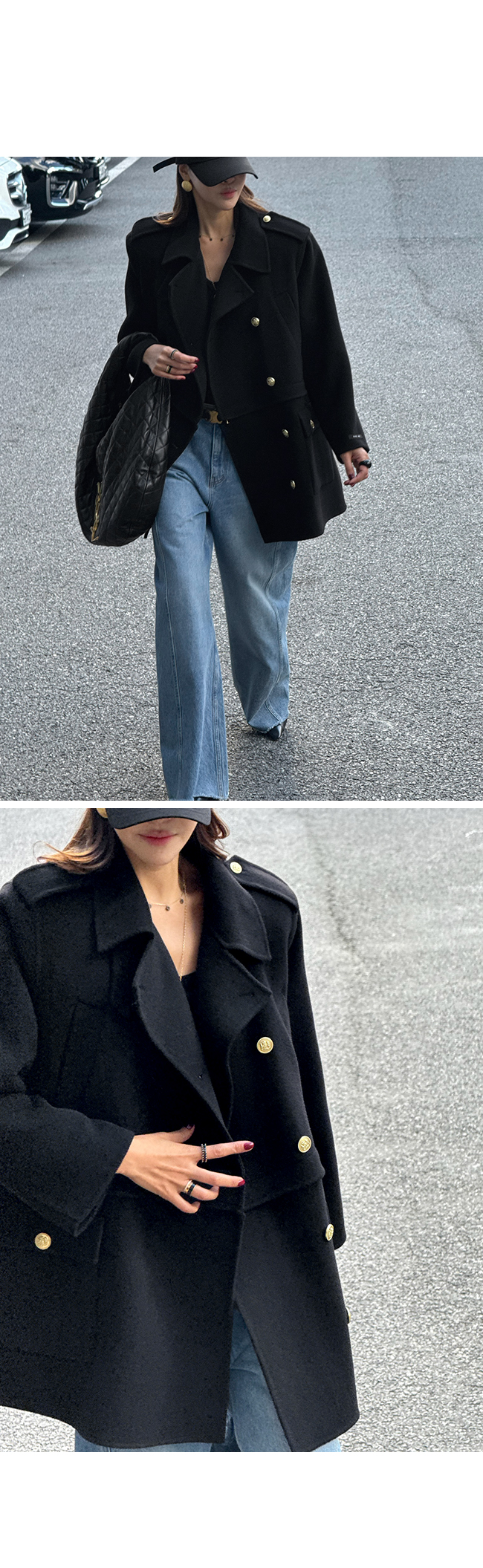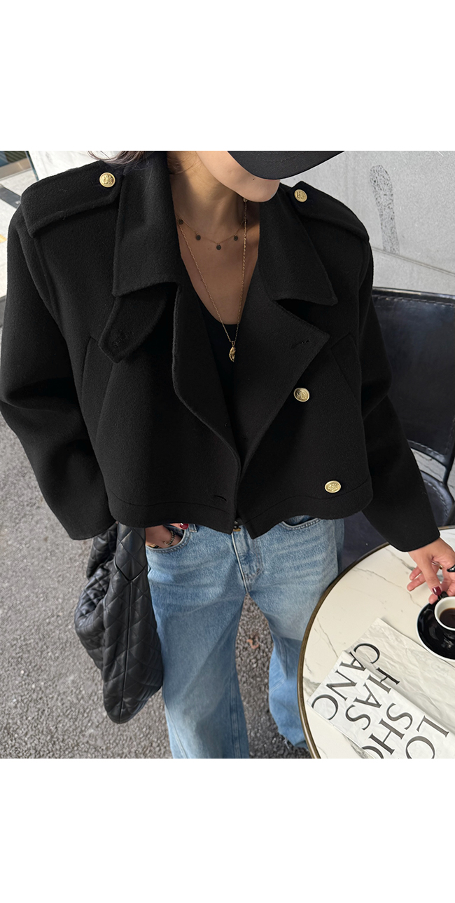 골드 버튼 디테일과 어깨 견장 장식이 더해져