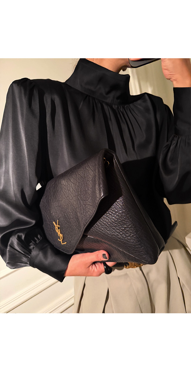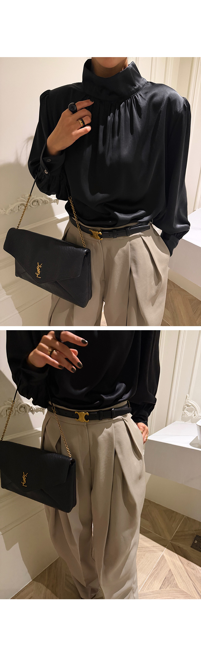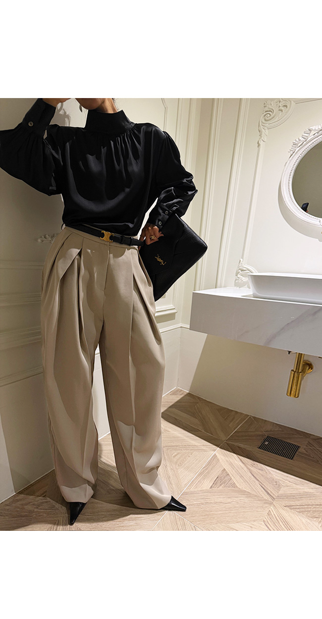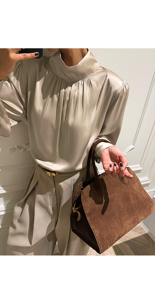 고급스럽고 세련된 무드의 새틴 하이넥 블라우스를 소개해드릴게요.