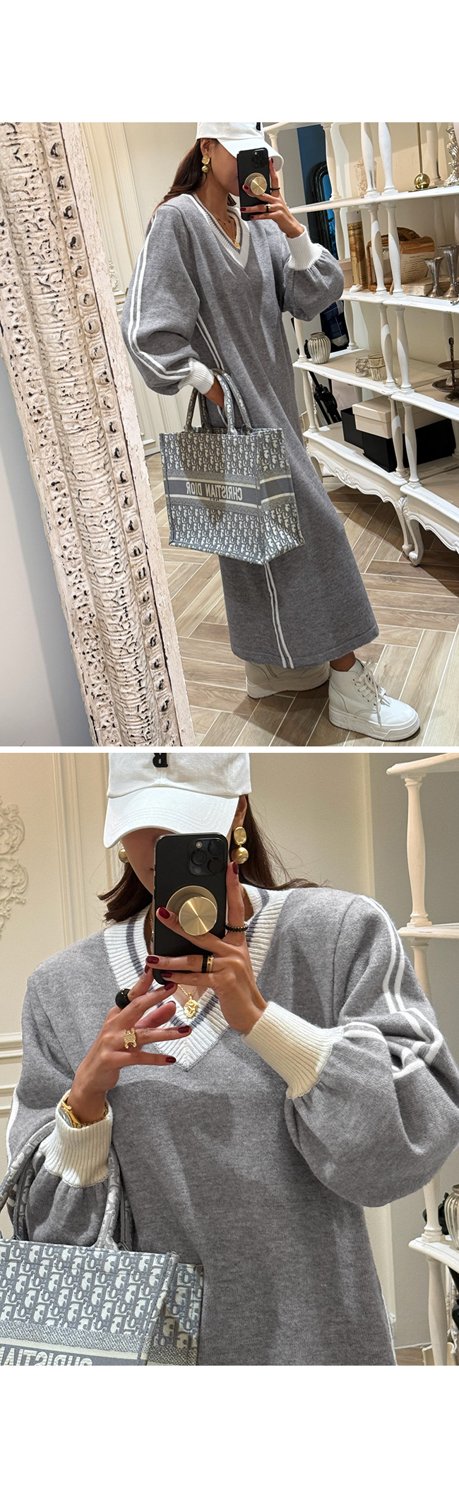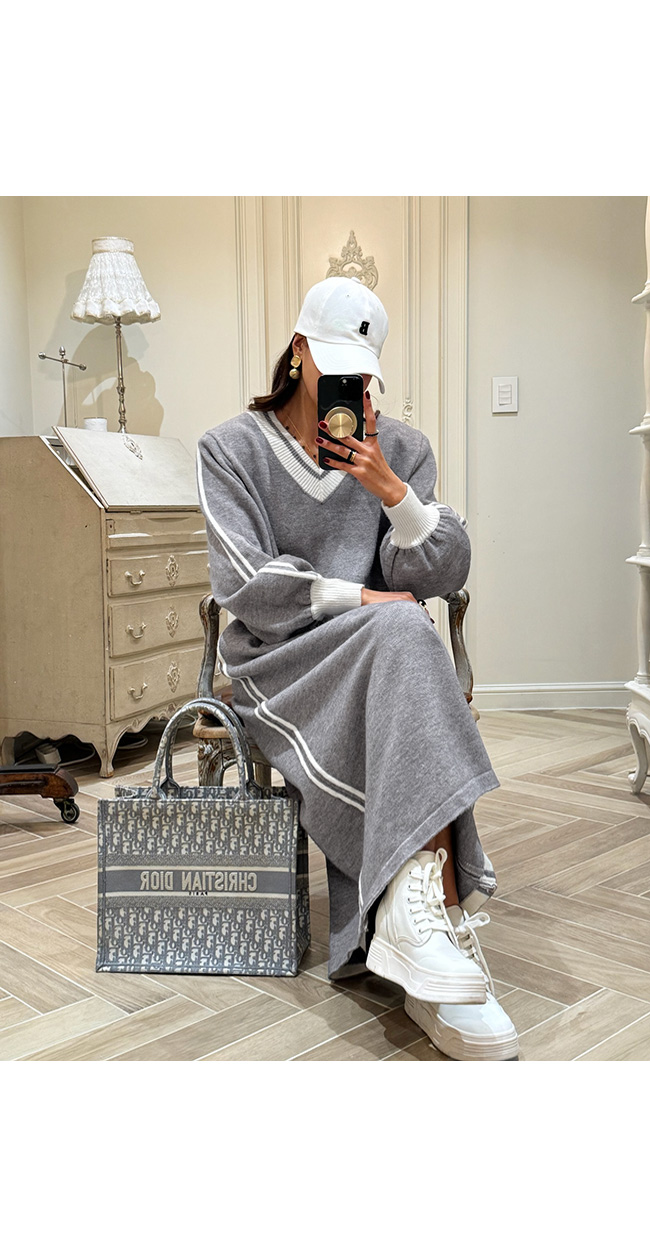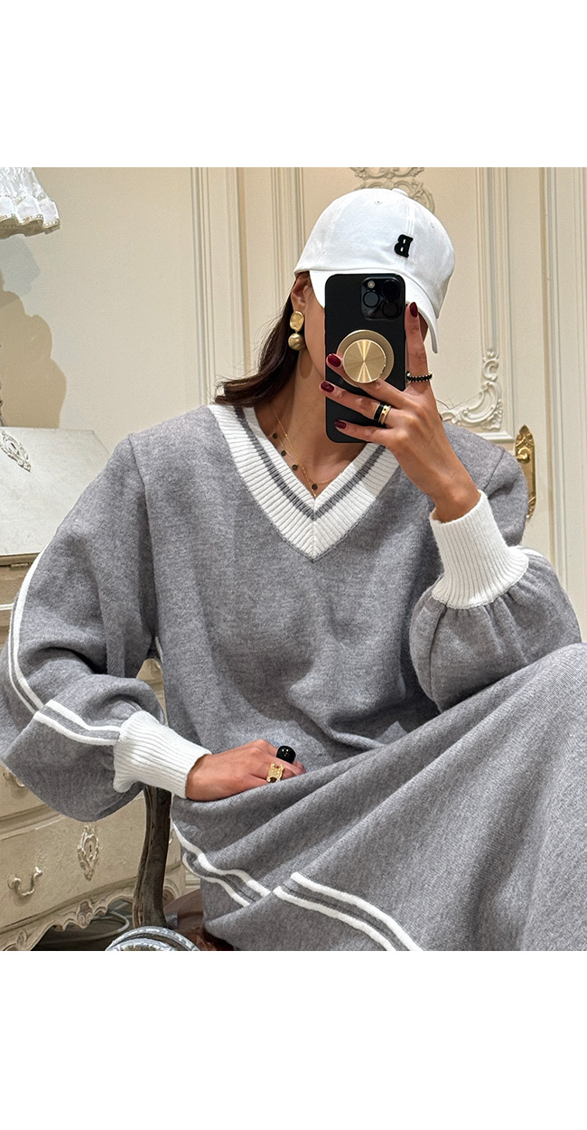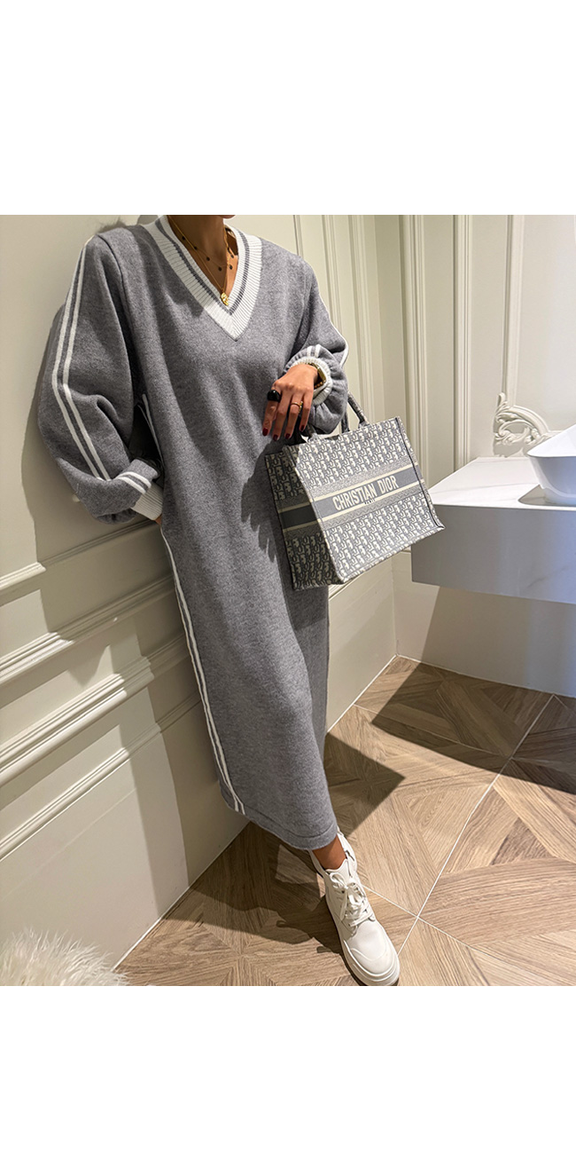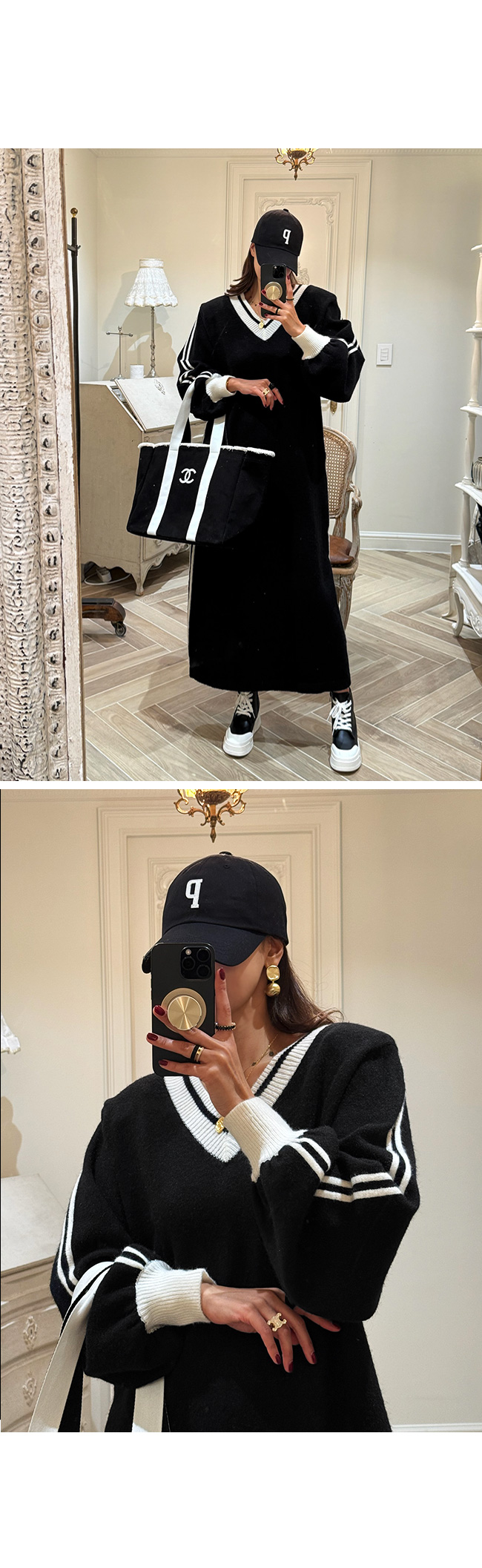 배색 브이넥 니트 롱 원피스를 소개해드릴게요.