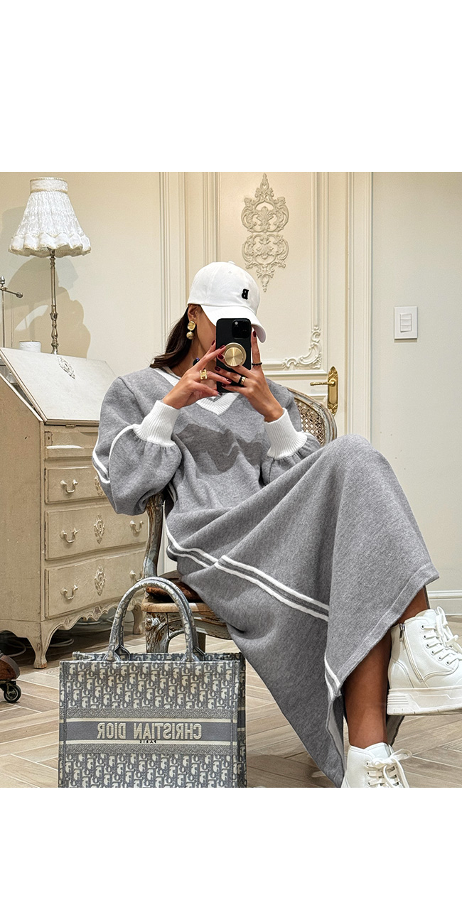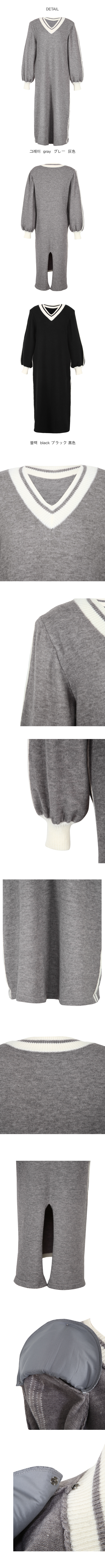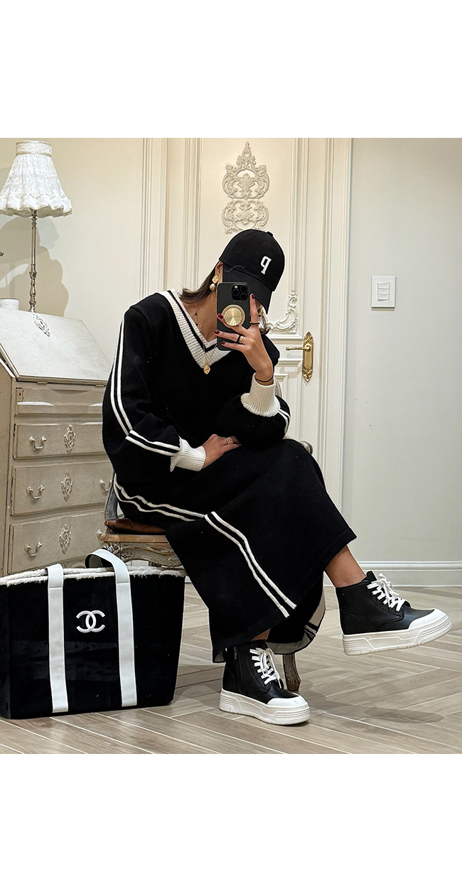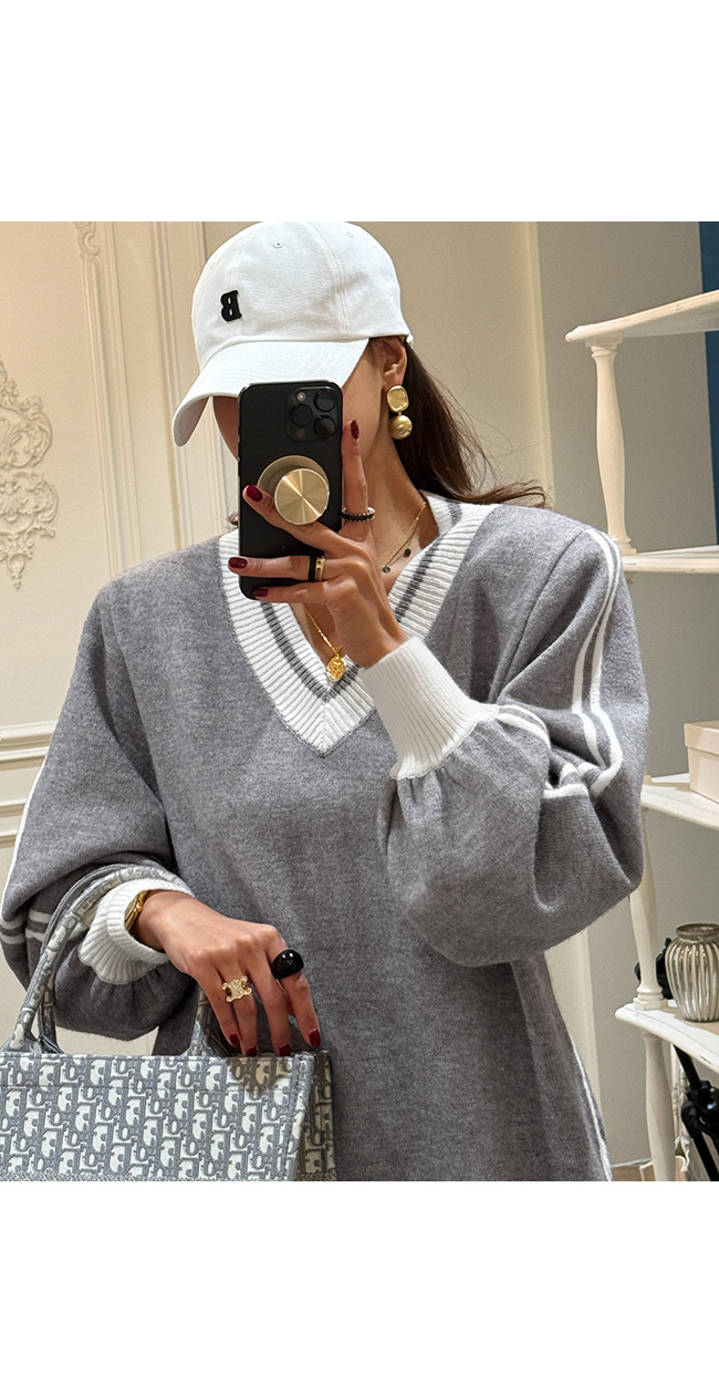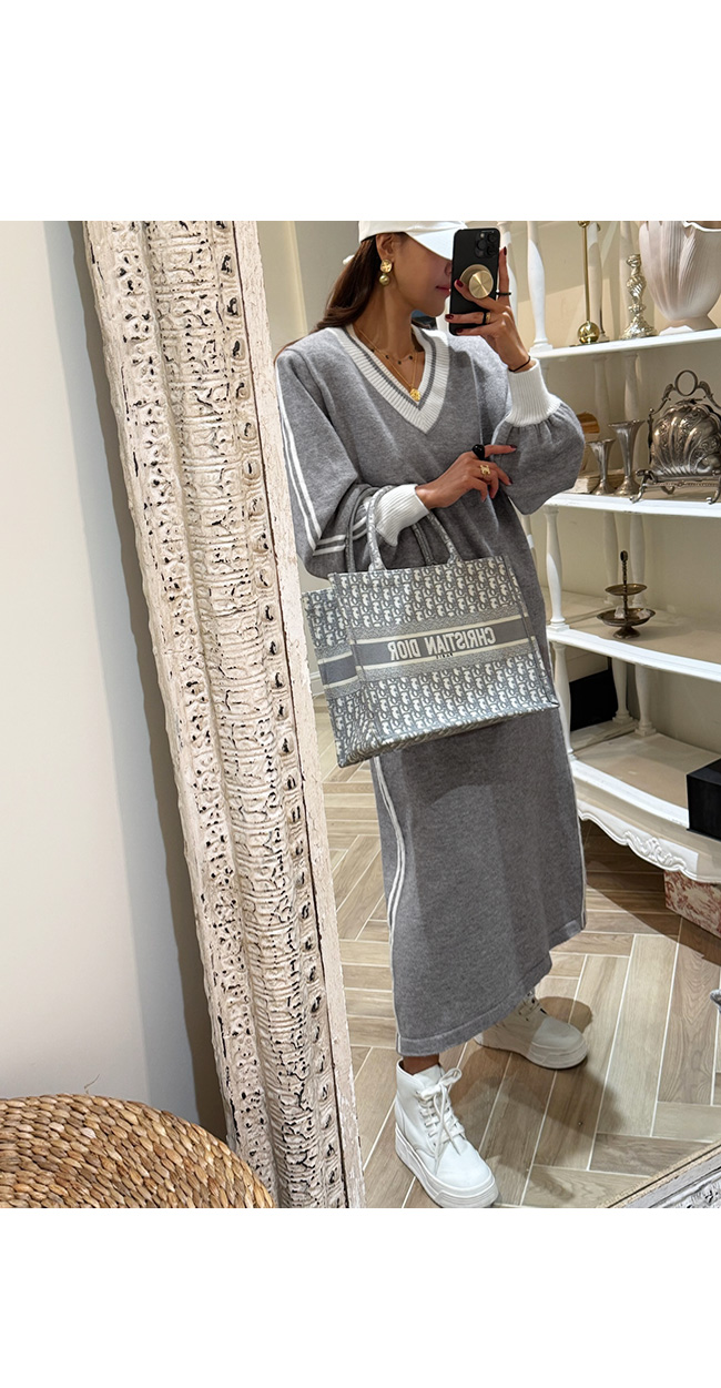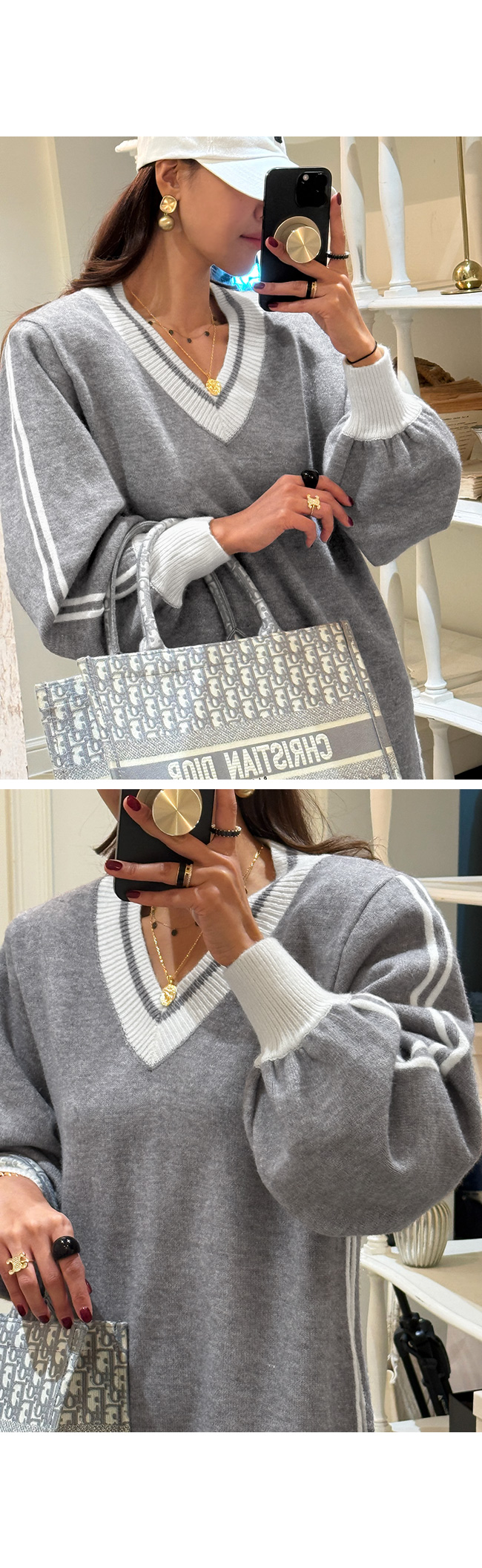 배색 브이넥 니트 롱 원피스를 소개해드릴게요.