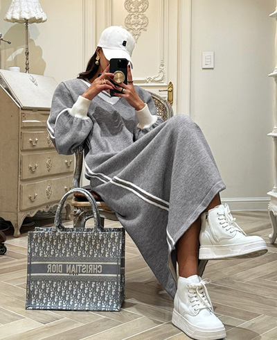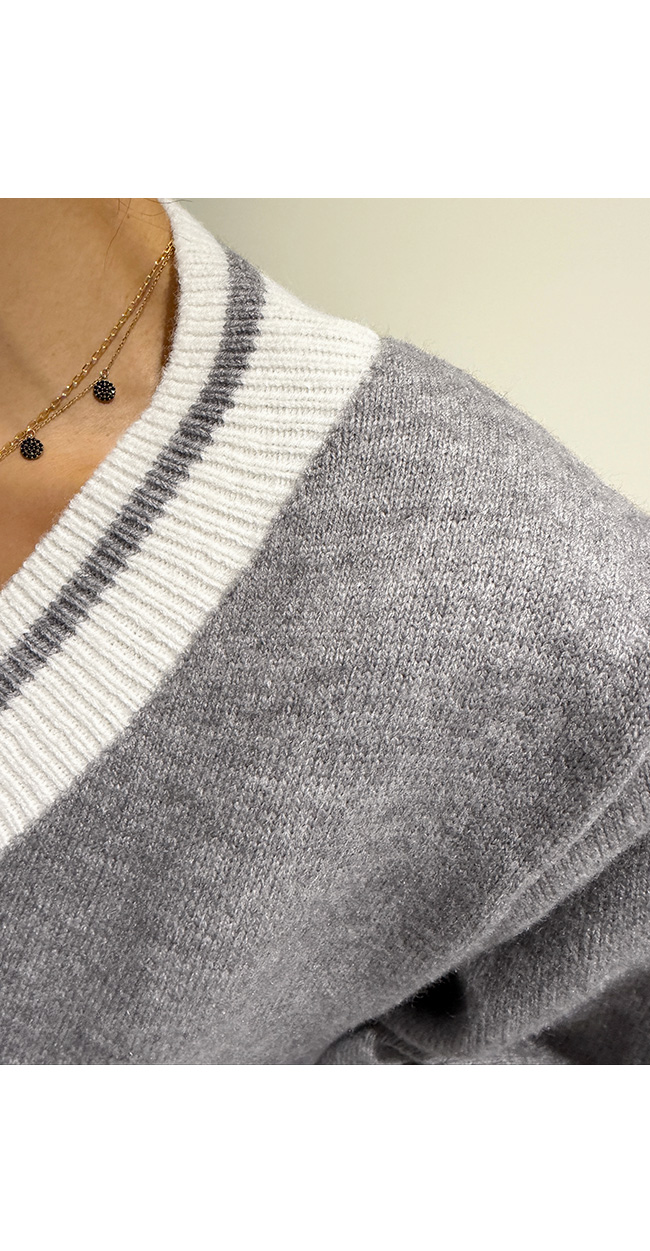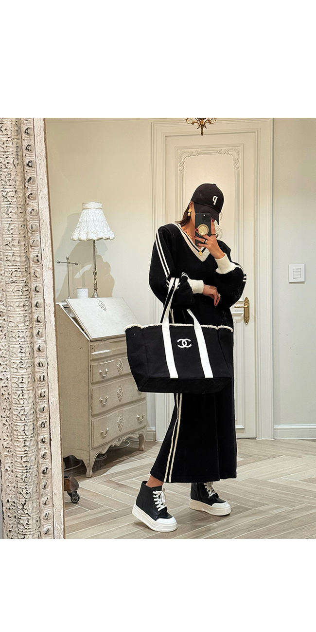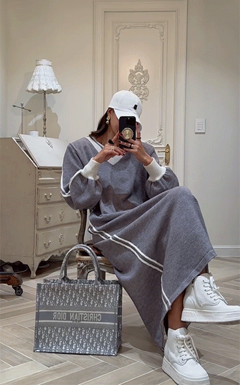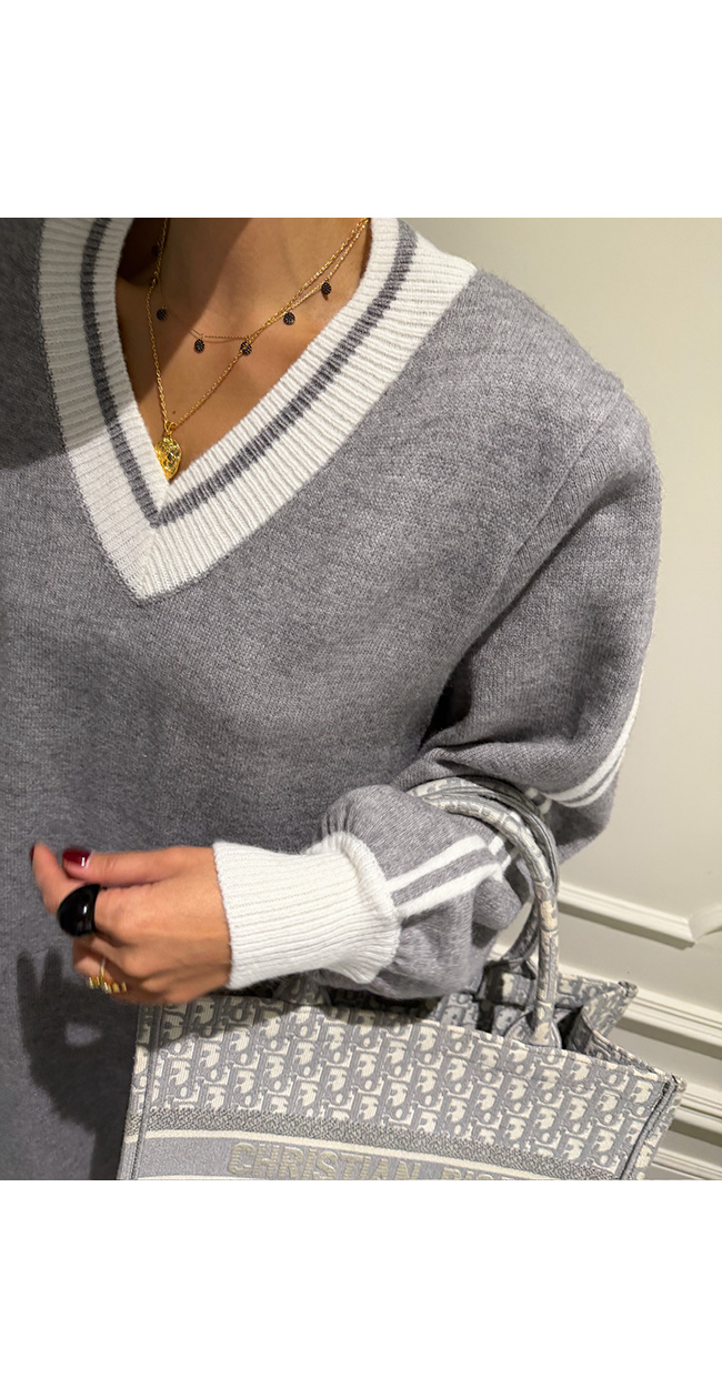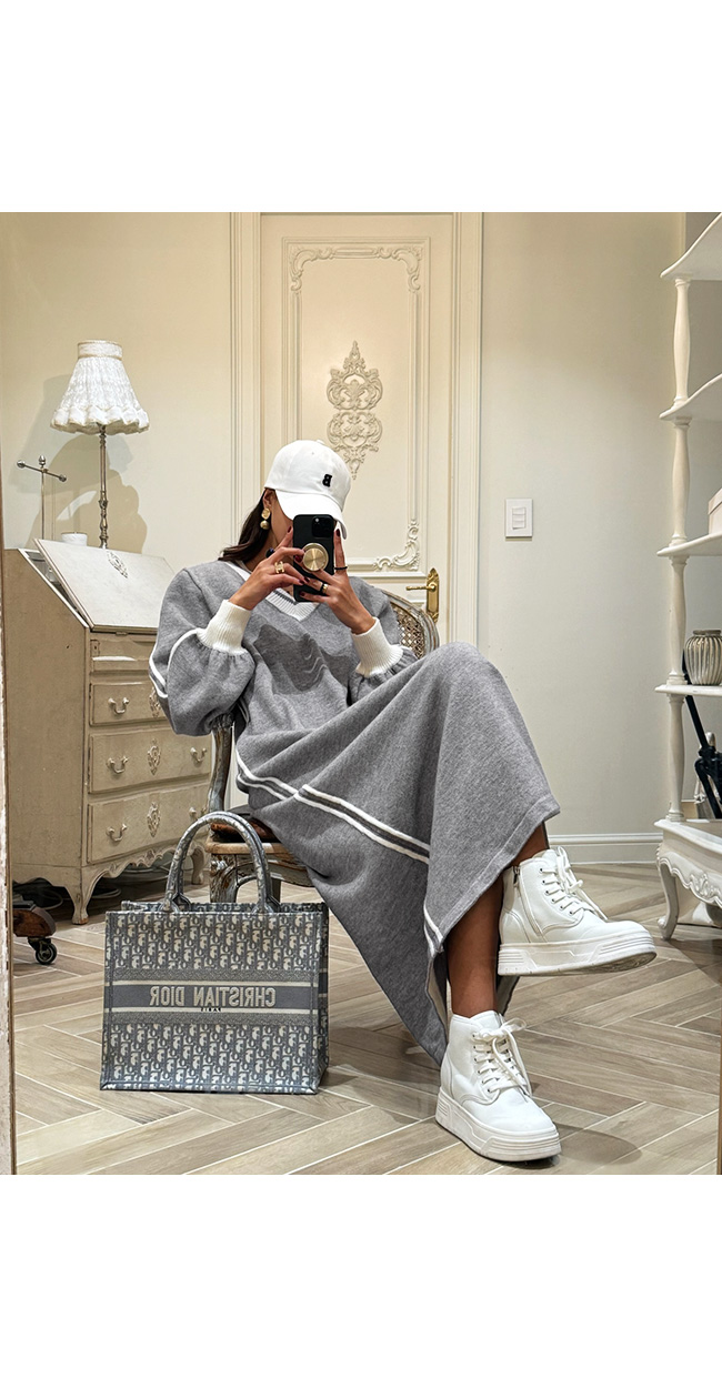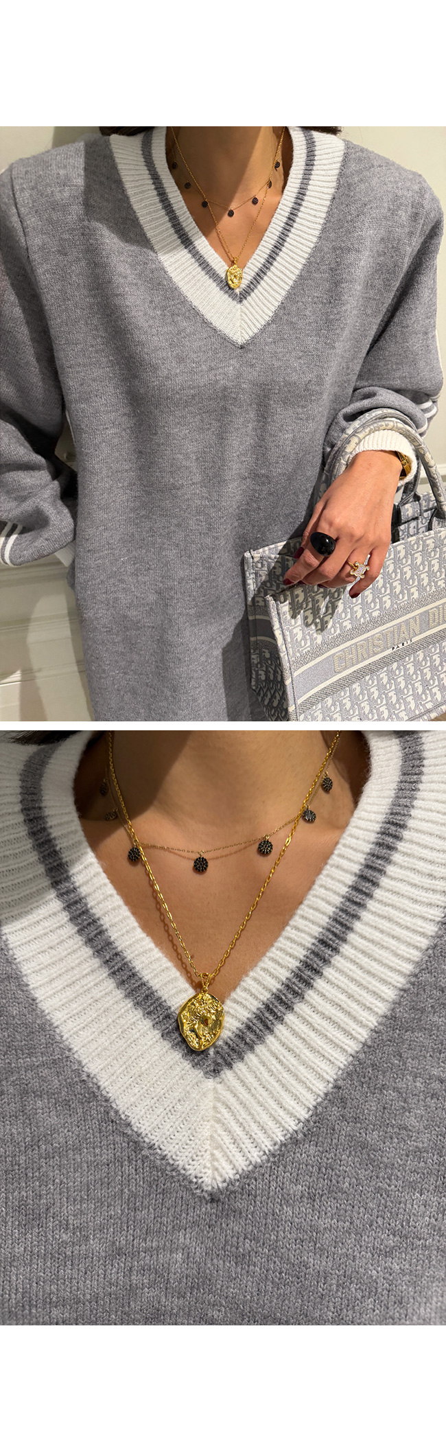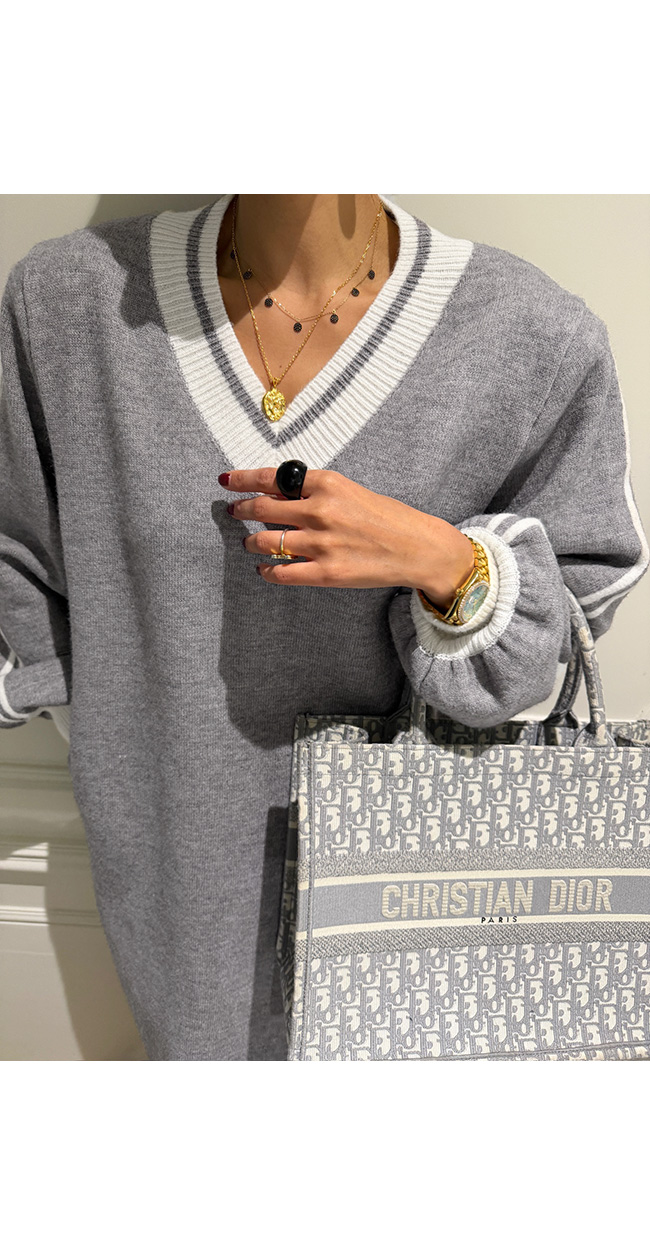 배색 브이넥 니트 롱 원피스를 소개해드릴게요.
