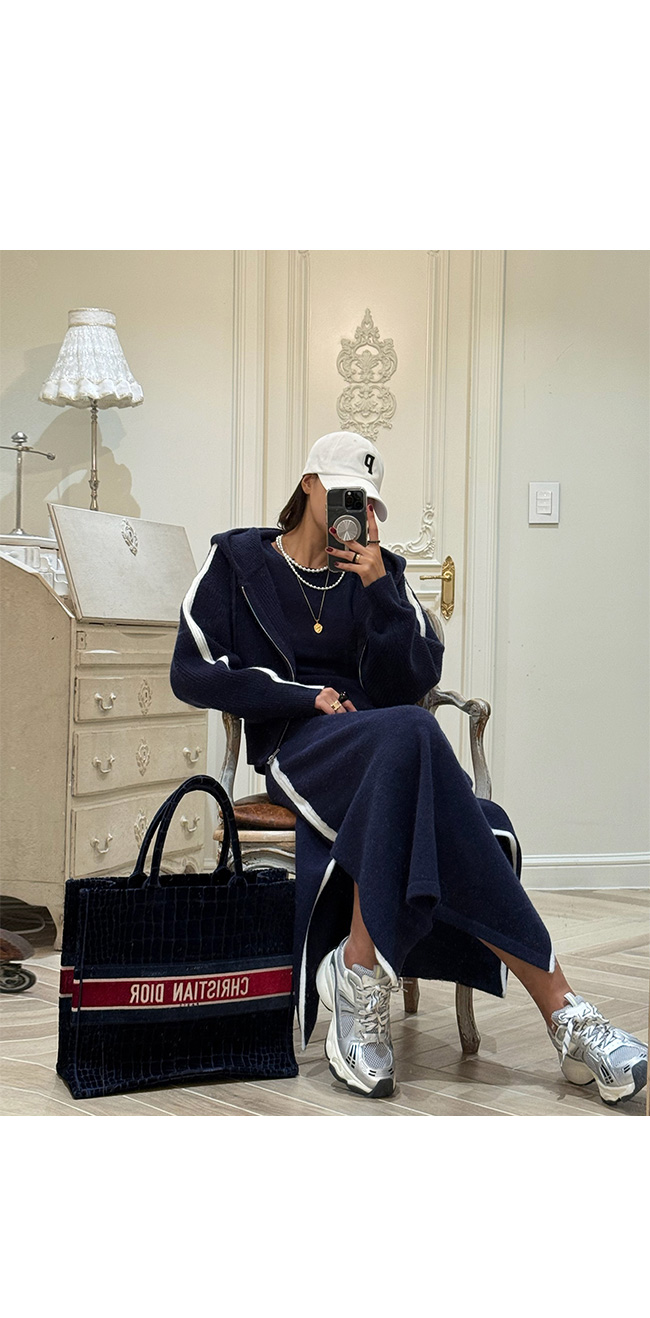 어깨 라인부터 이어지는 배색 스트라이프 디테일이