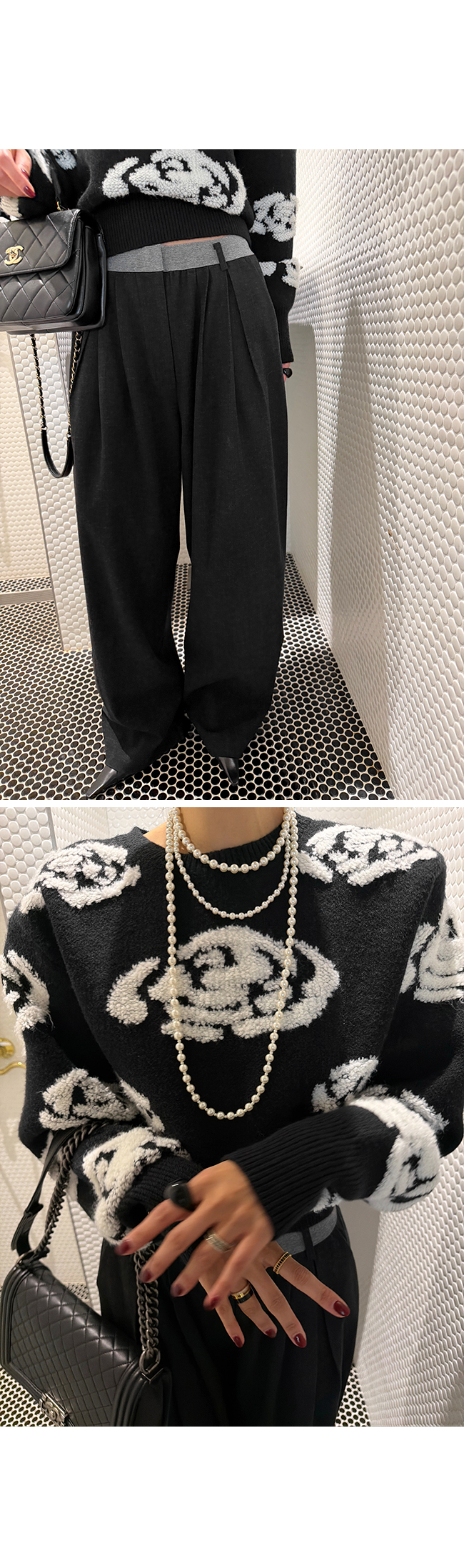 허리에는 톤 배색이 들어간 니트 밴딩을 사용해