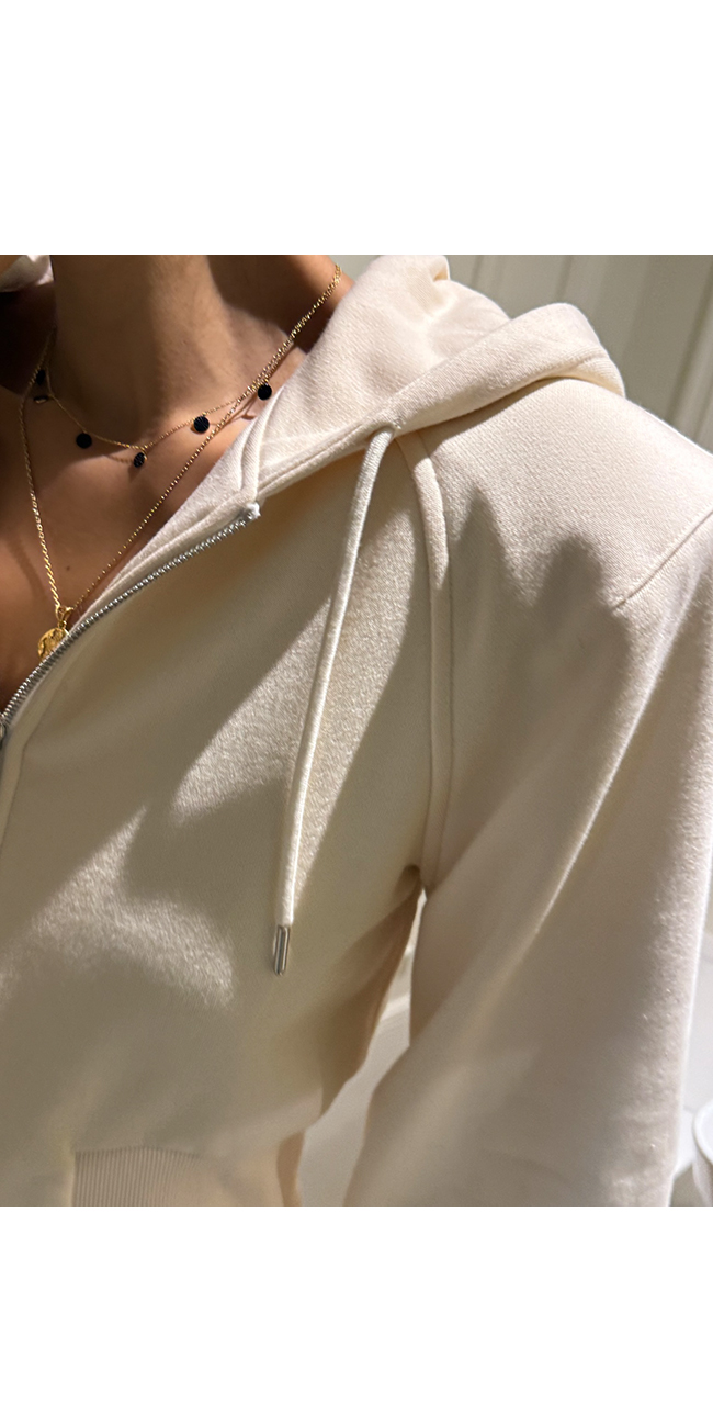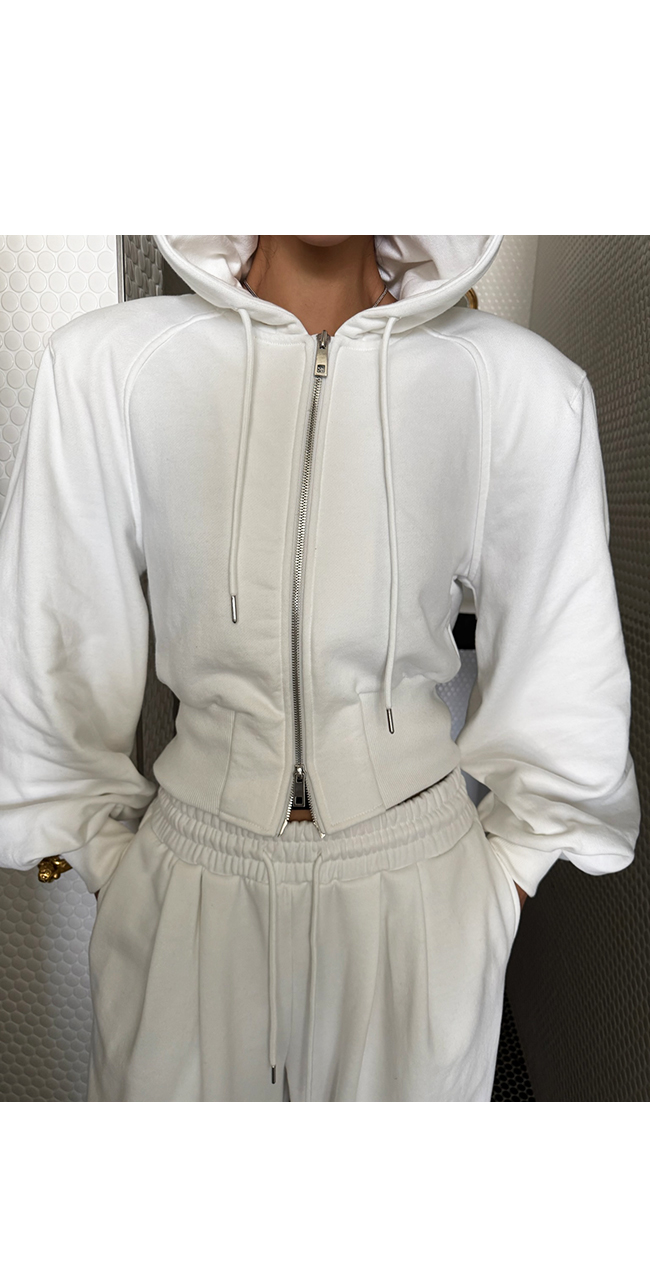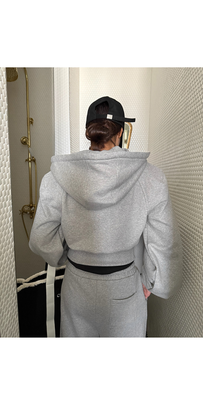 후드 집업은 허리선을 자연스럽게 잡아주는 크롭 디자인으로