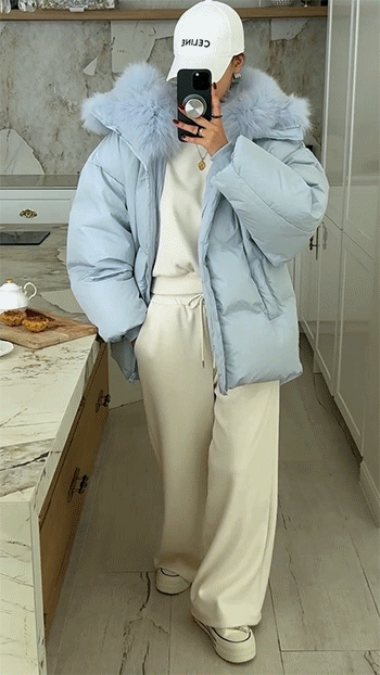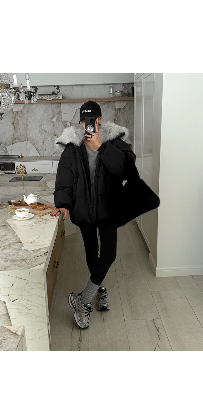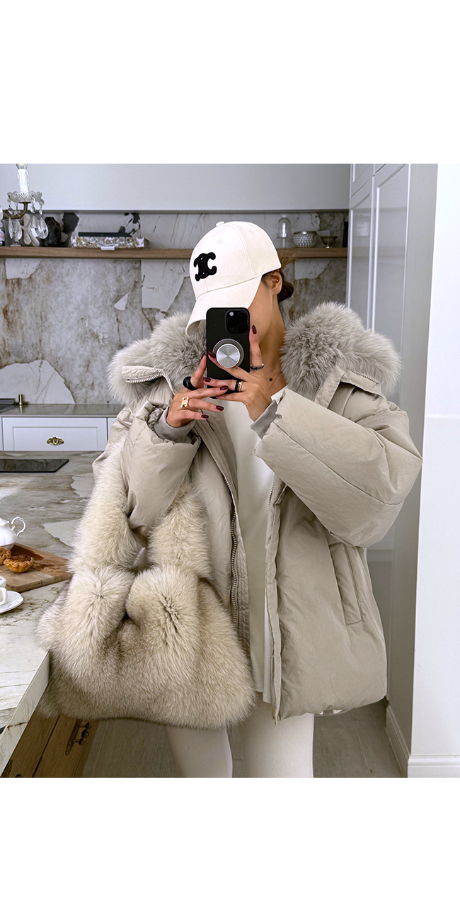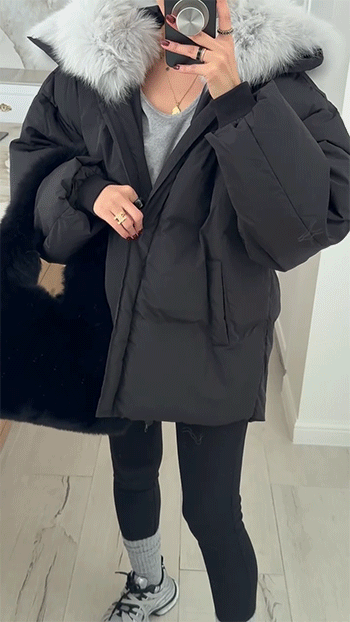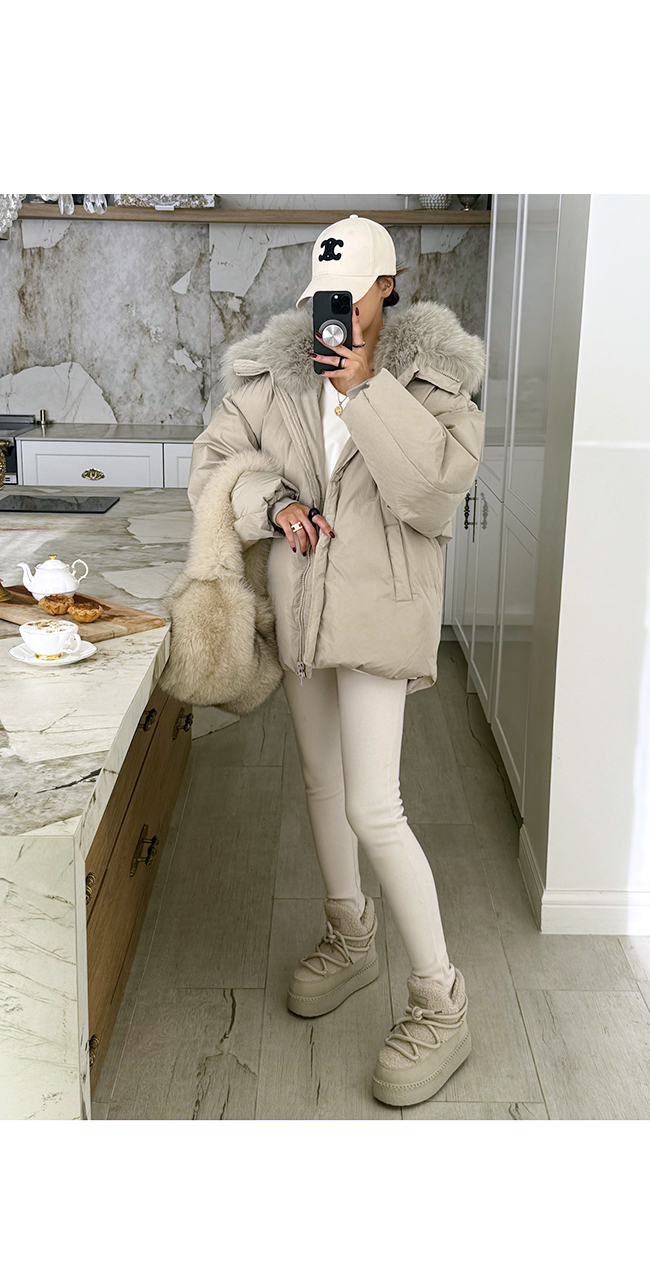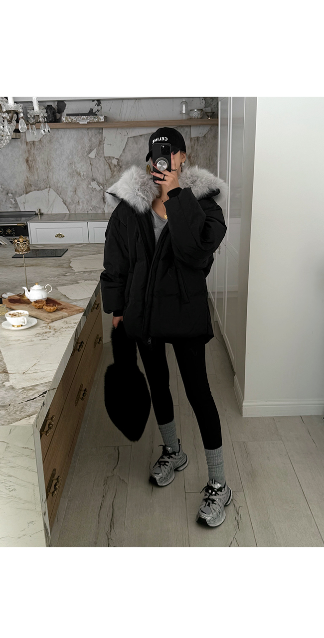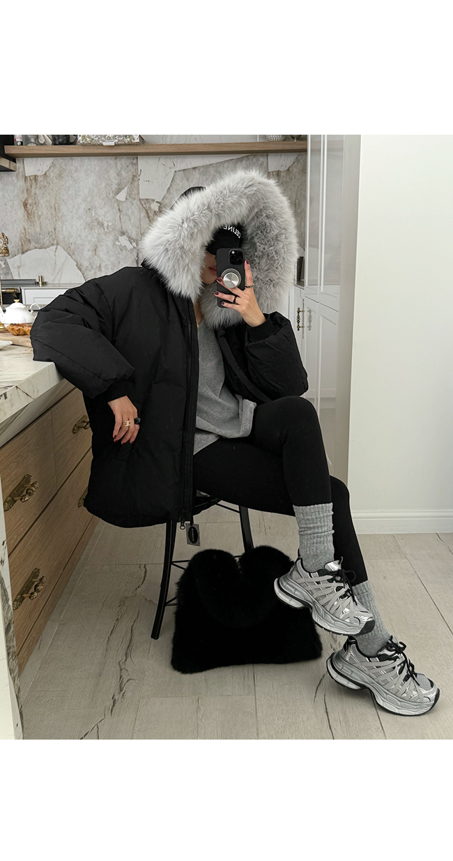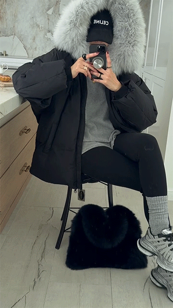 넥 라인을 풍성하게 감싸는 퍼 후드 디테일이