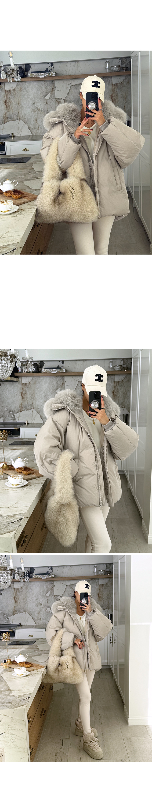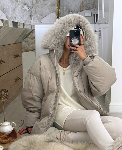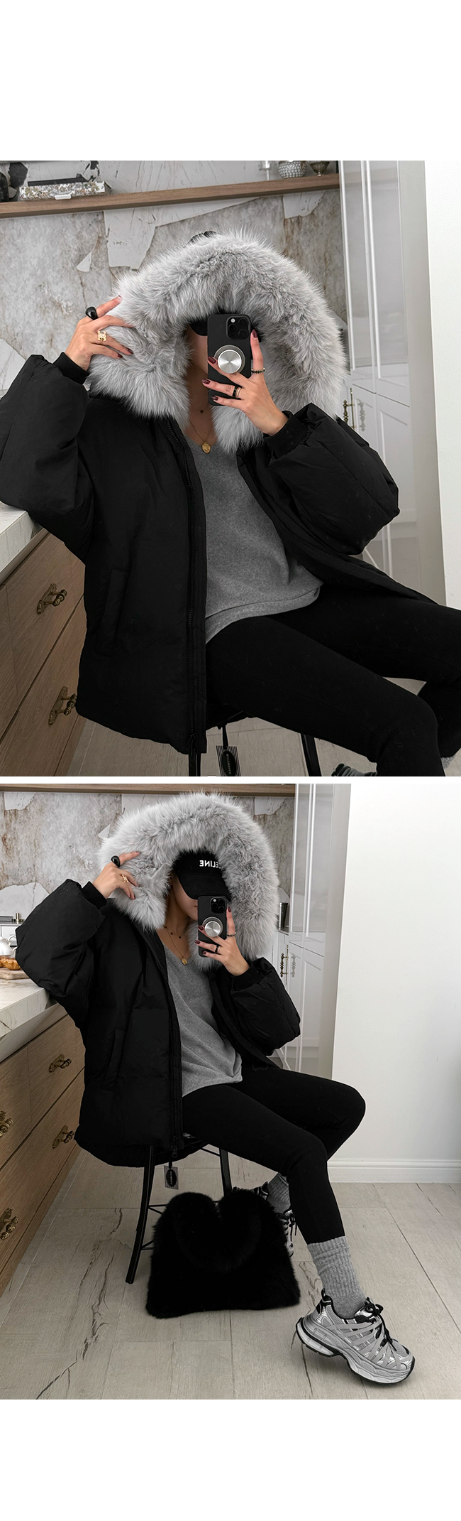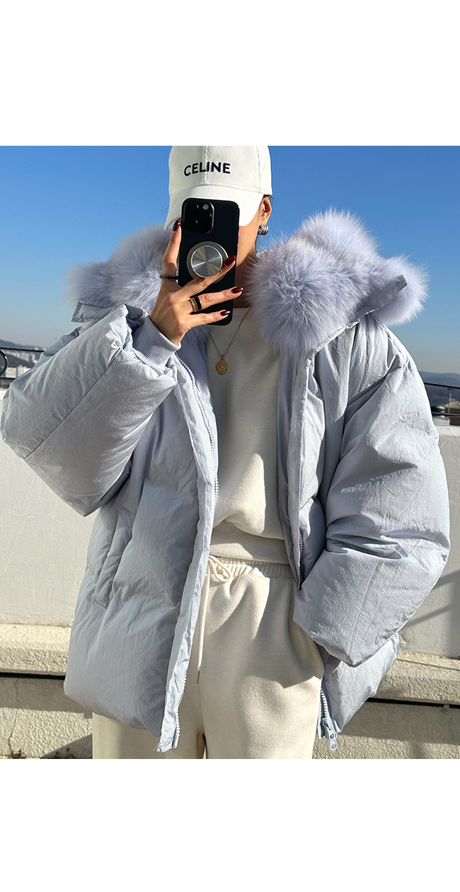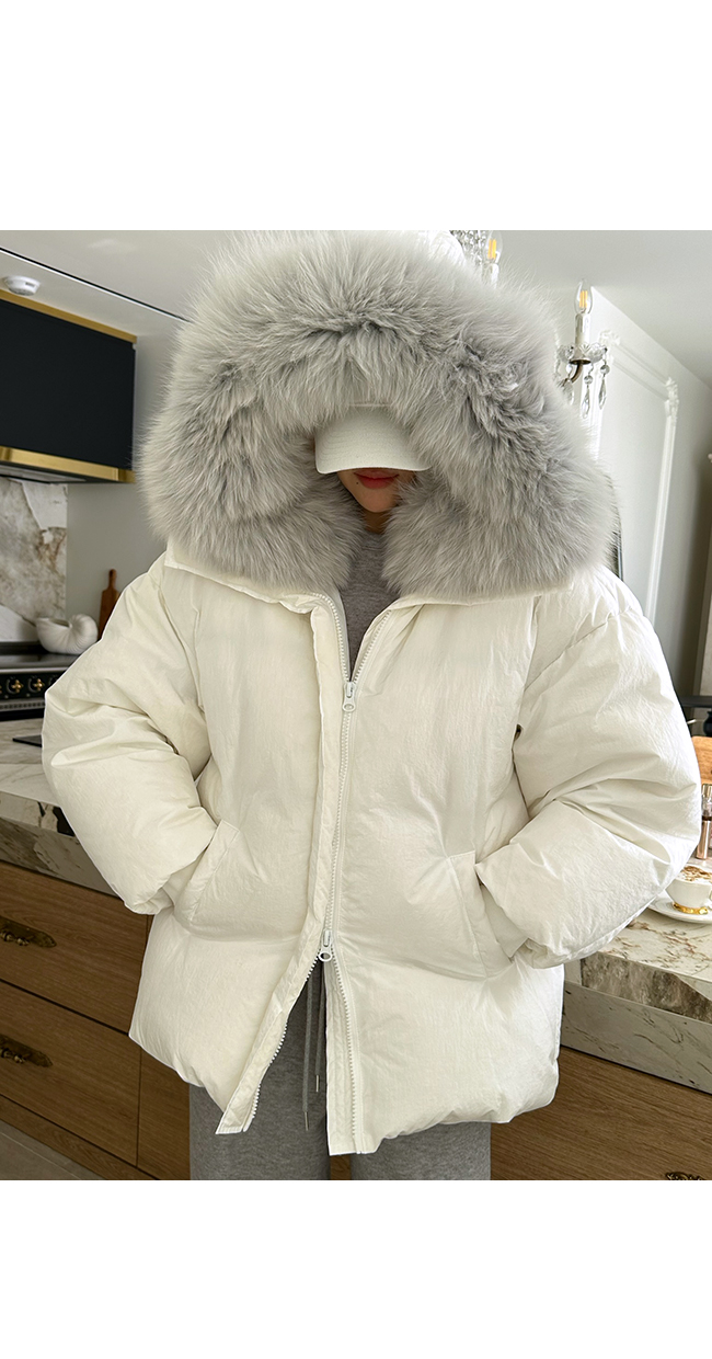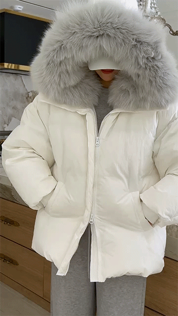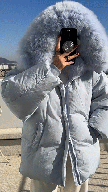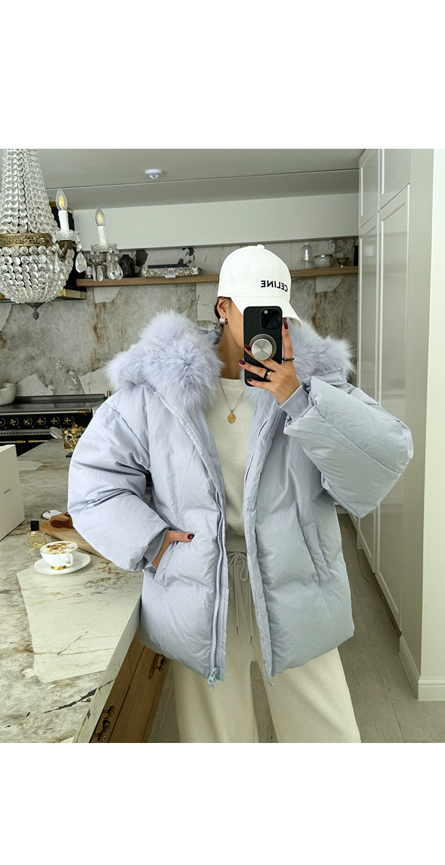넥 라인을 풍성하게 감싸는 퍼 후드 디테일이