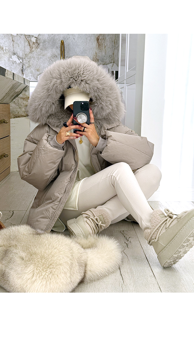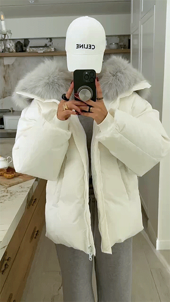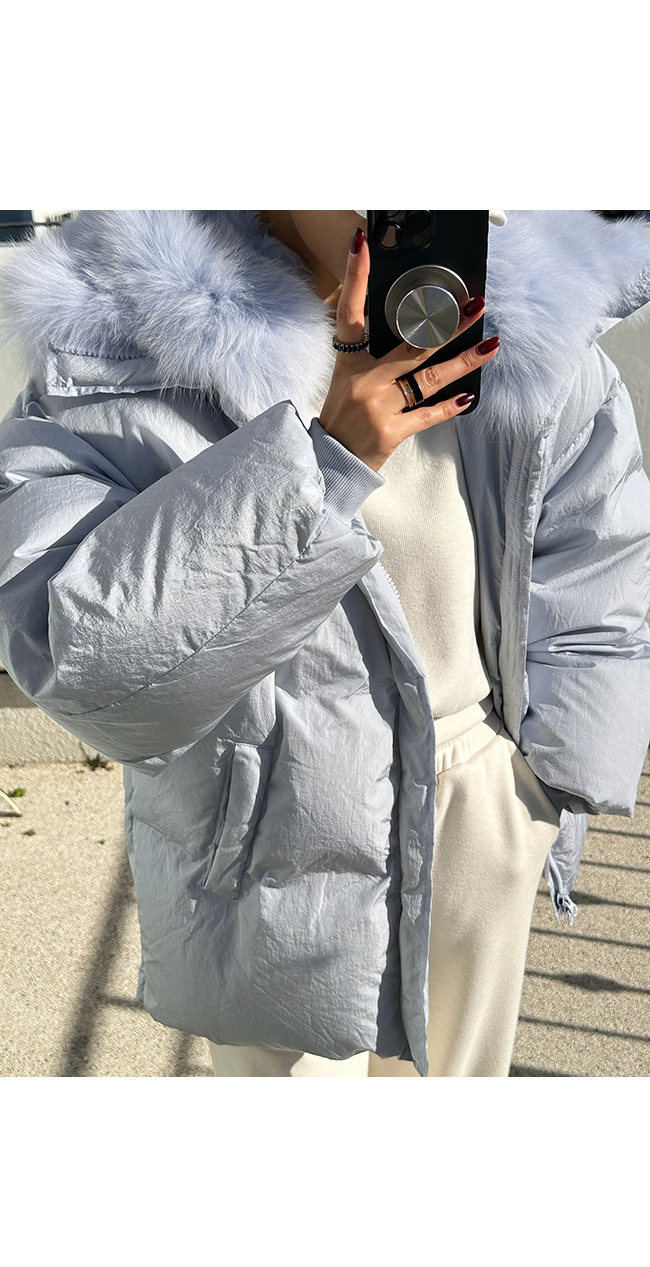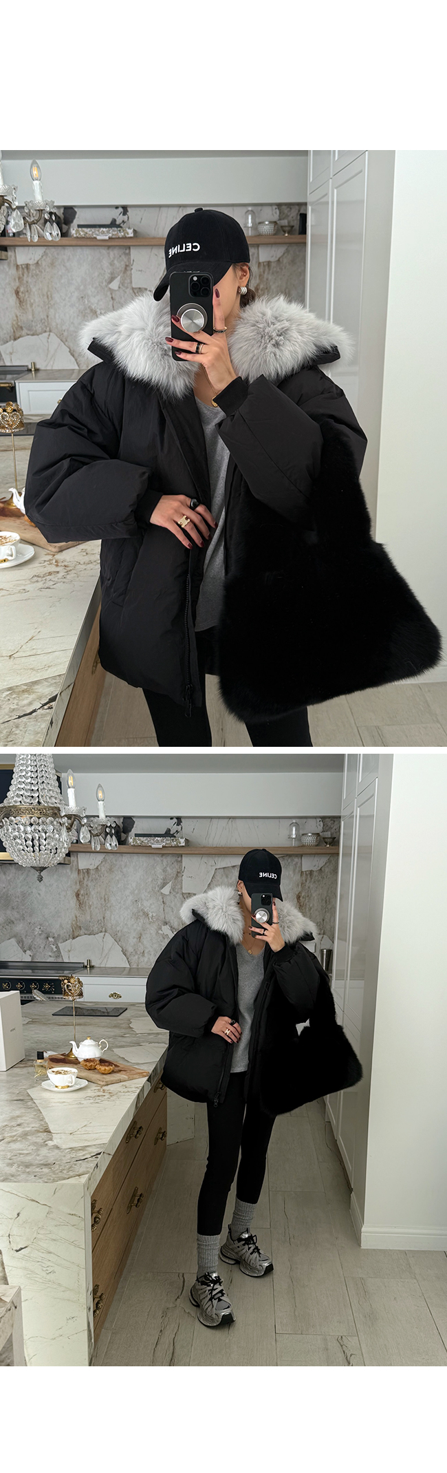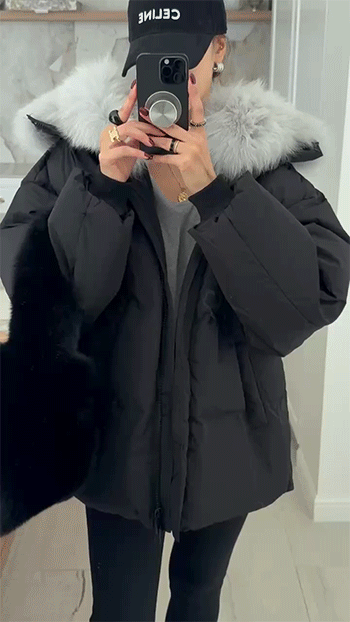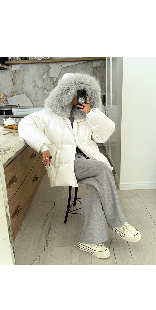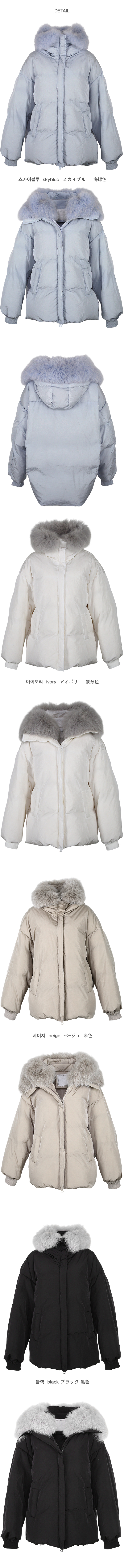 넥 라인을 풍성하게 감싸는 퍼 후드 디테일이