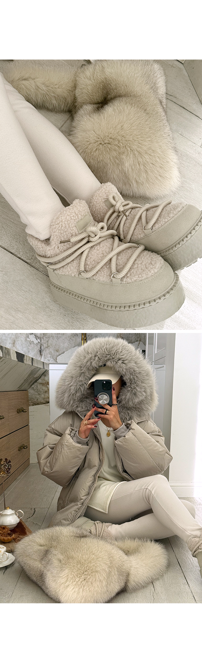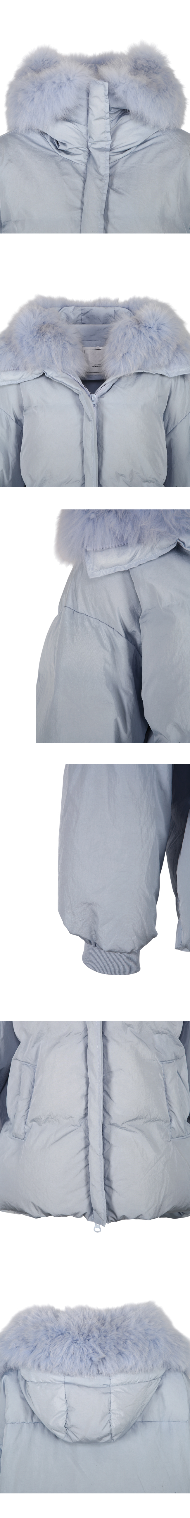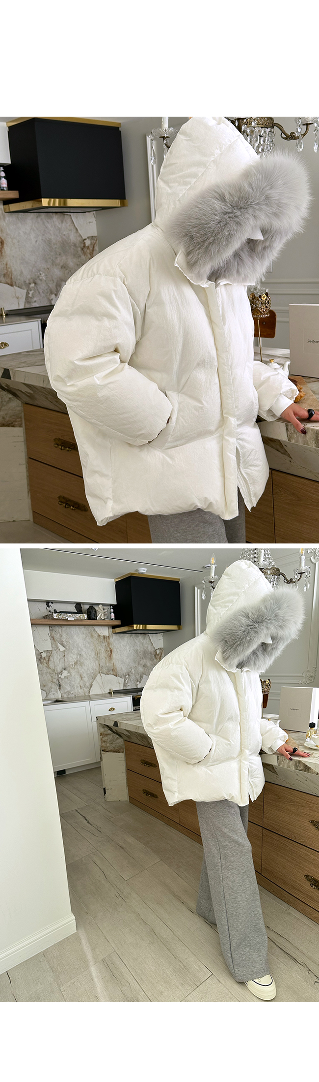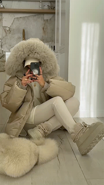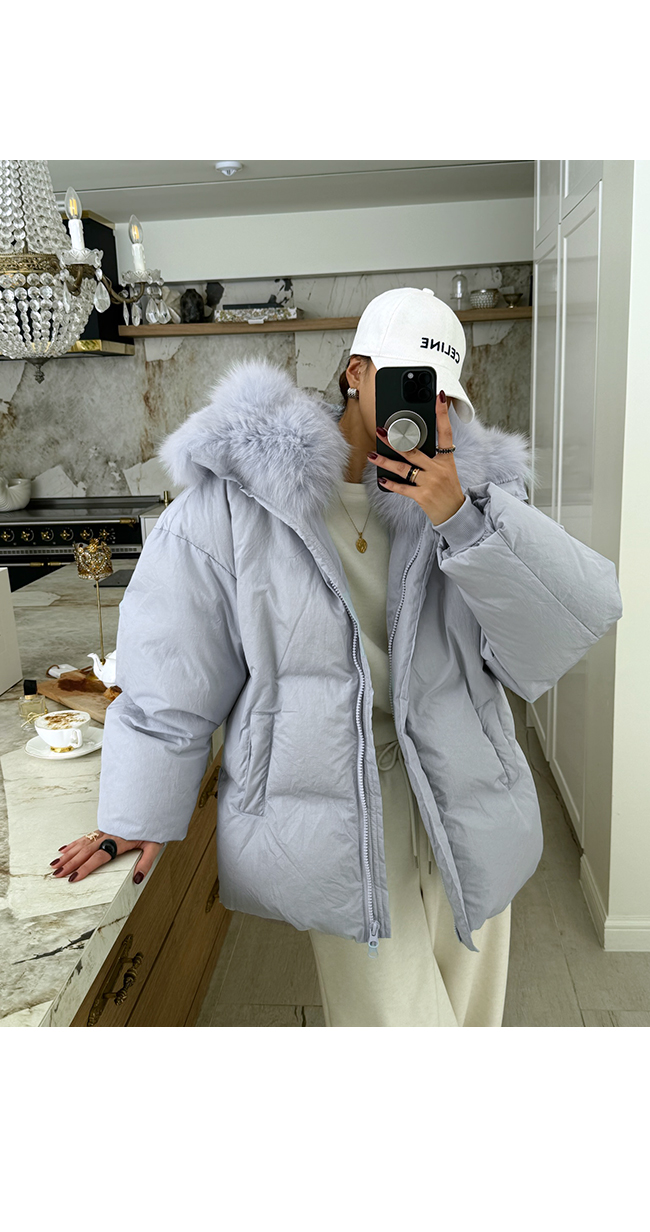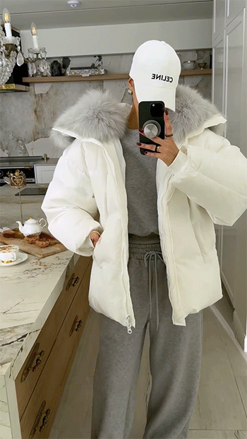 넥 라인을 풍성하게 감싸는 퍼 후드 디테일이