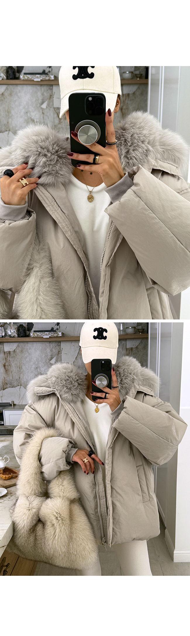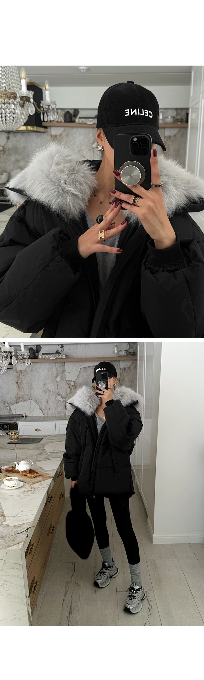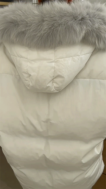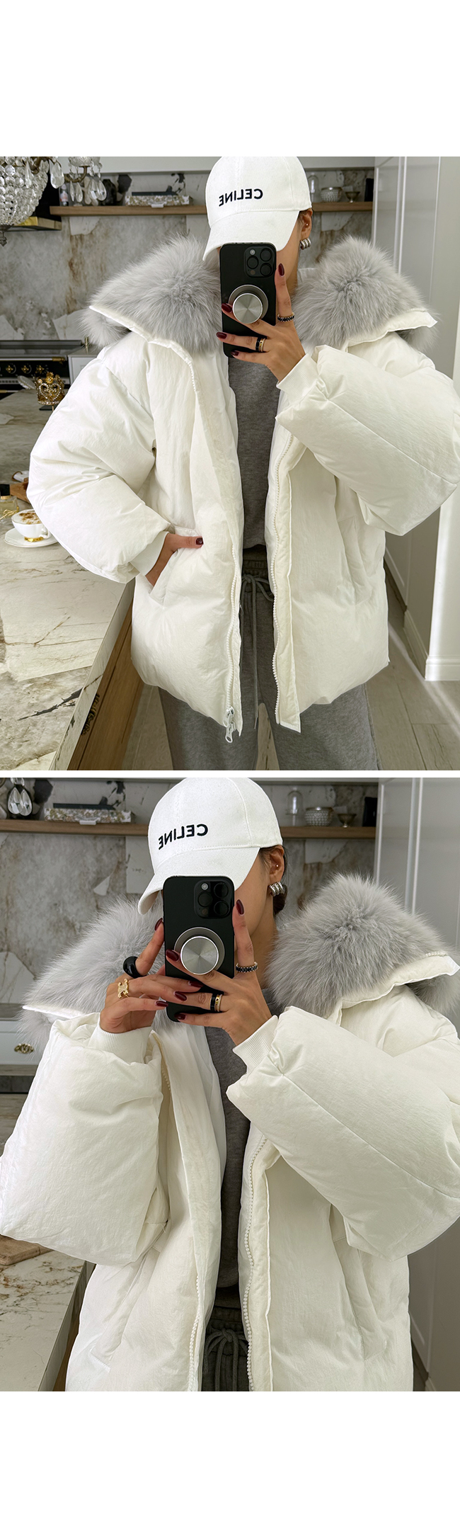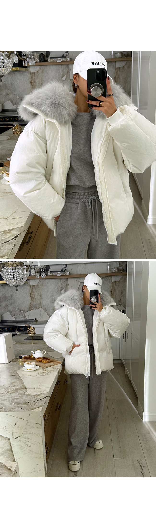 넥 라인을 풍성하게 감싸는 퍼 후드 디테일이