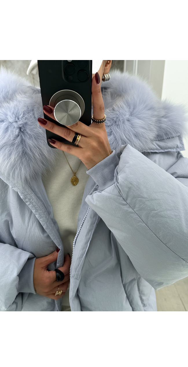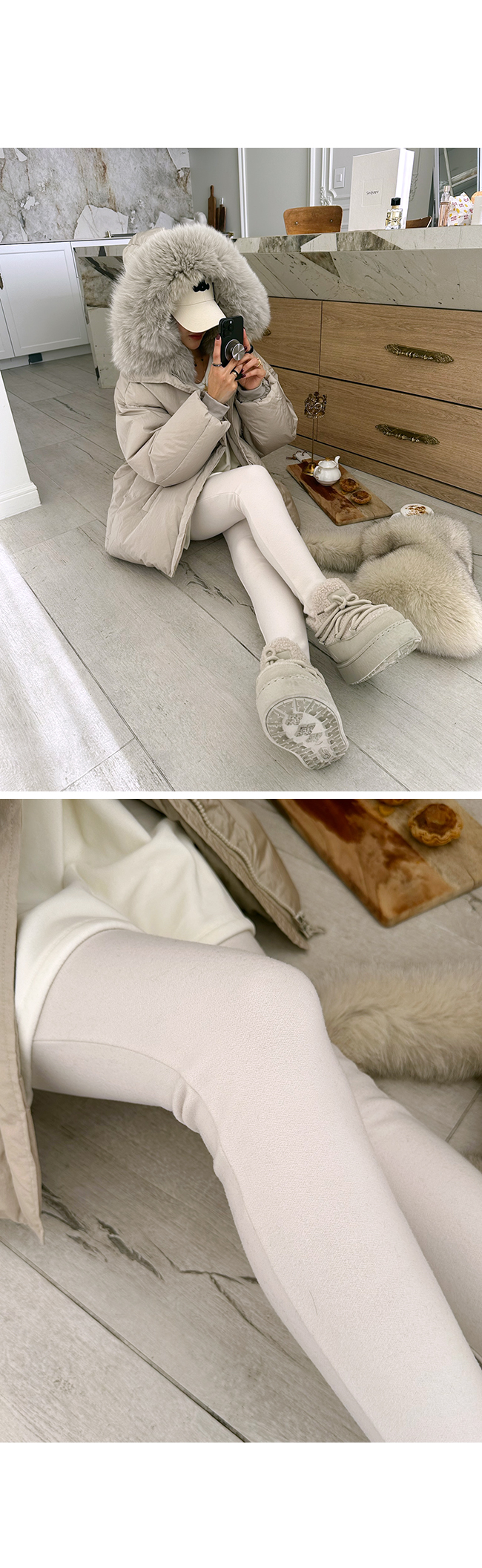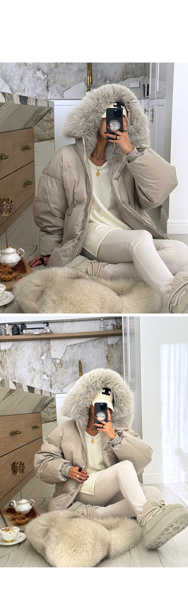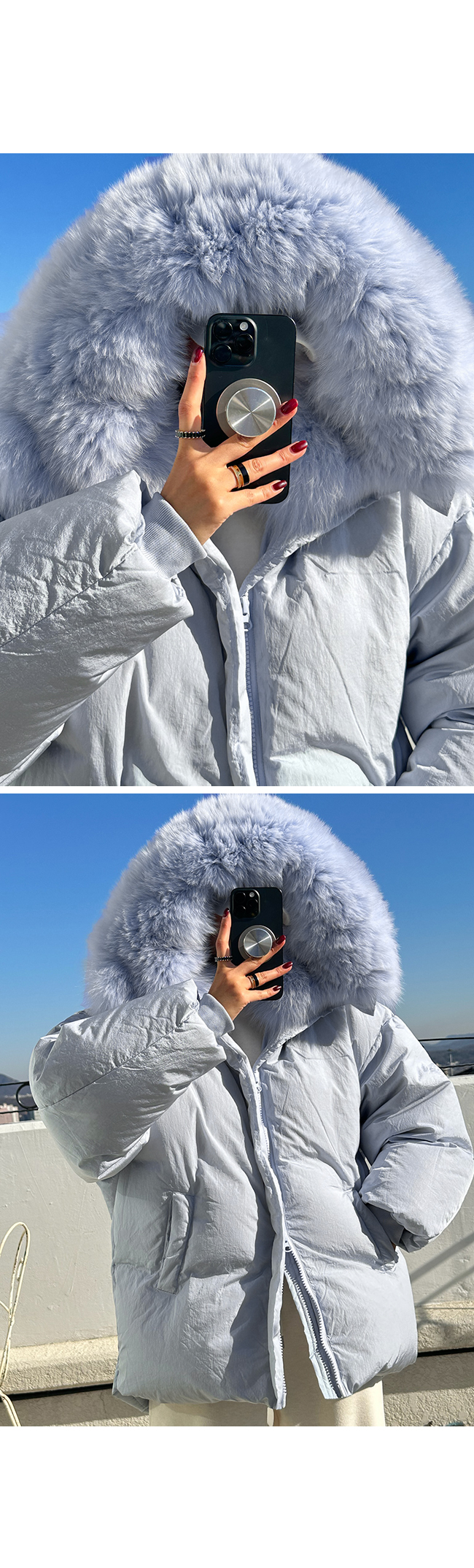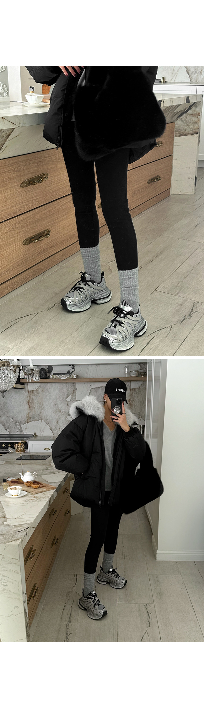 넥 라인을 풍성하게 감싸는 퍼 후드 디테일이