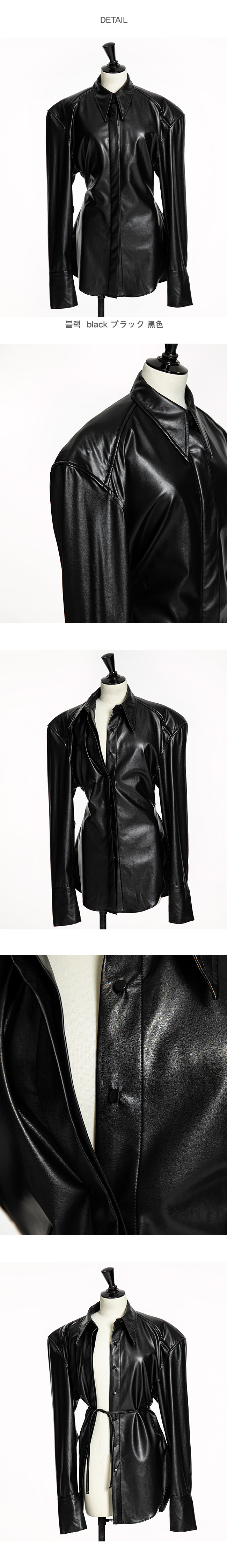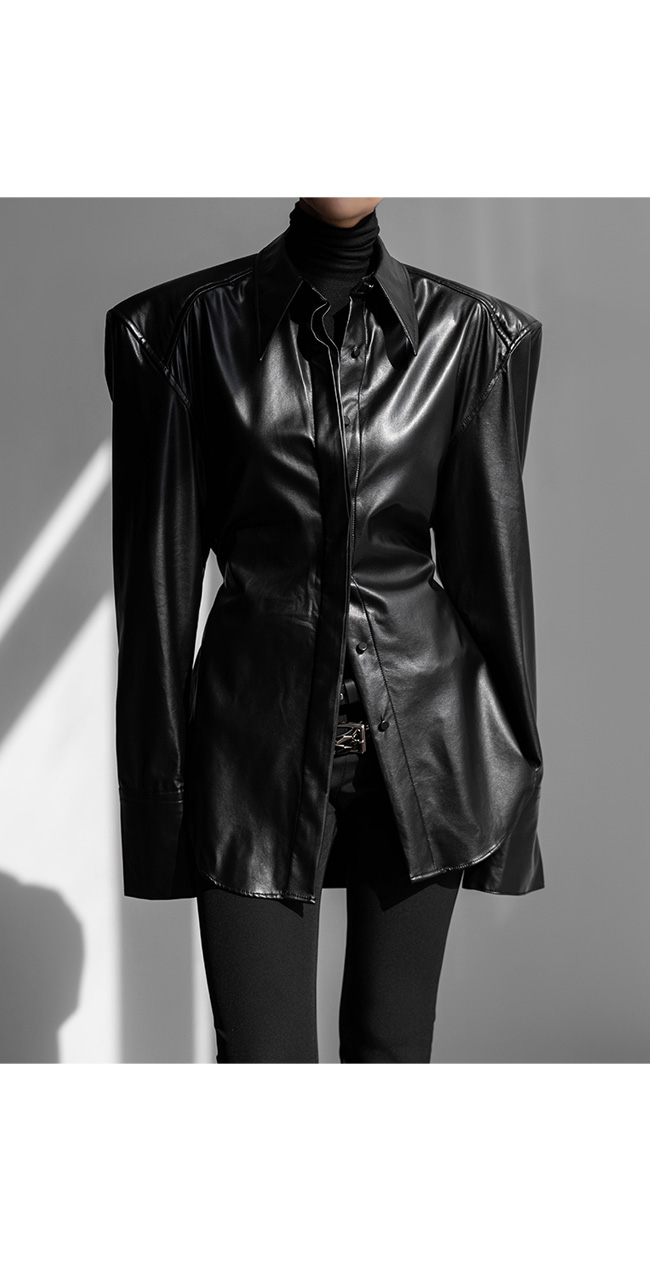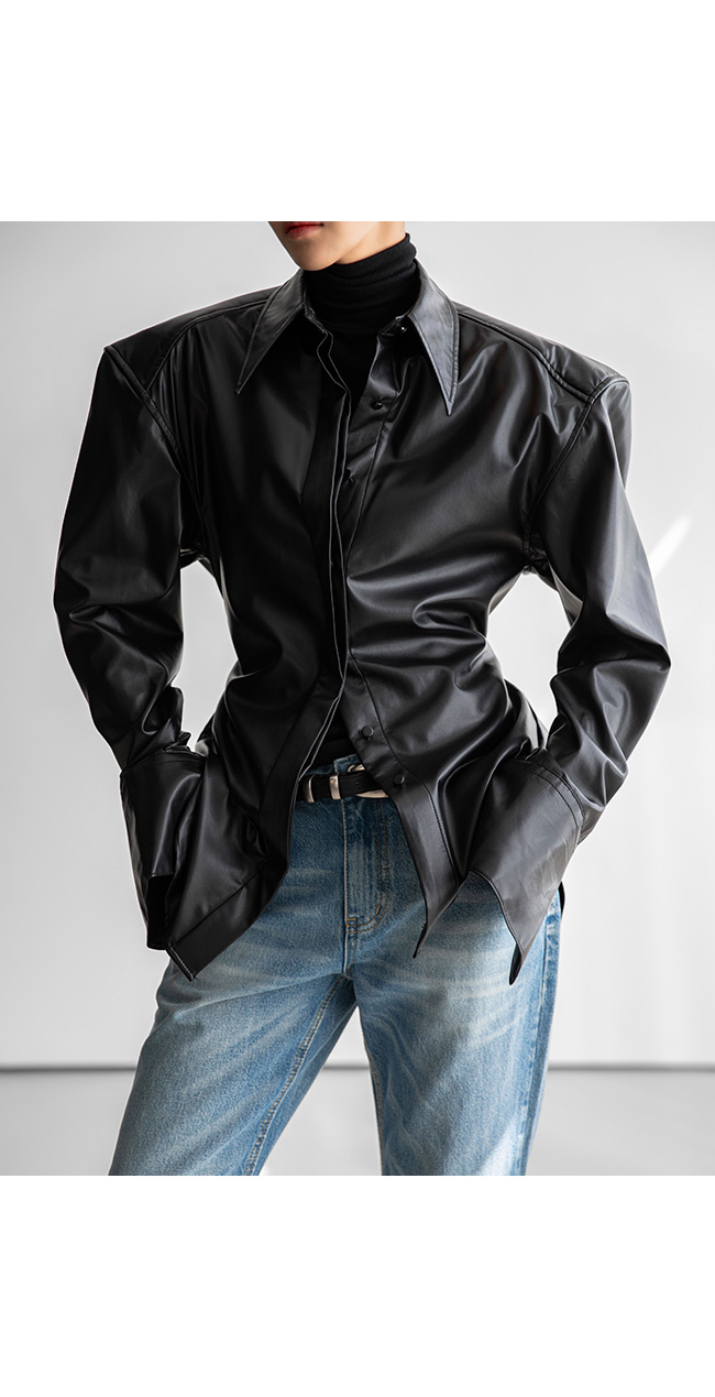 비건 레더 패디드 숄더 버튼 다운 셔츠를