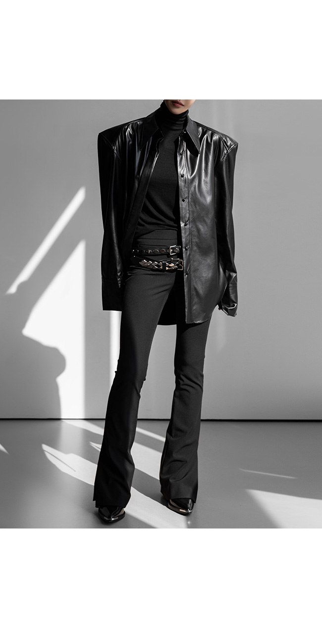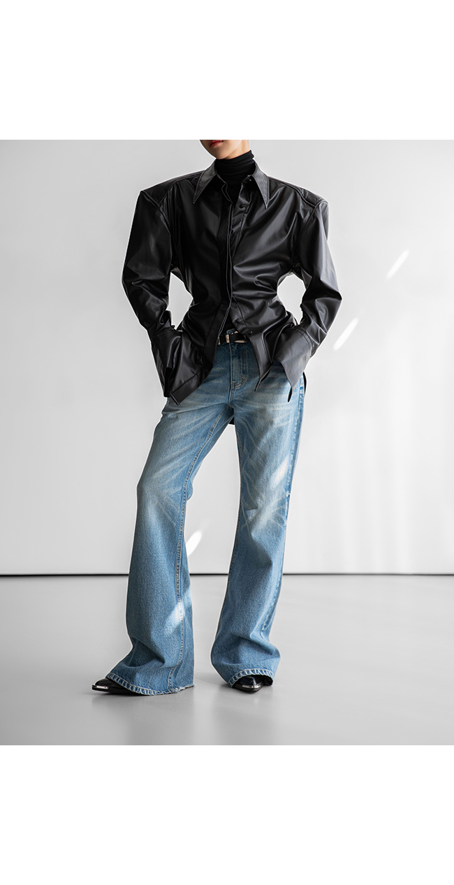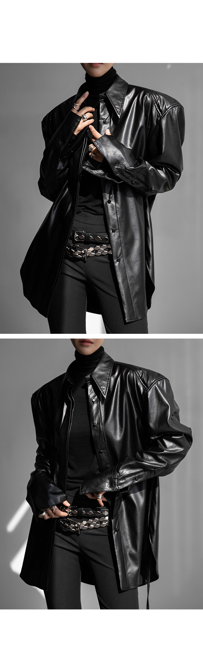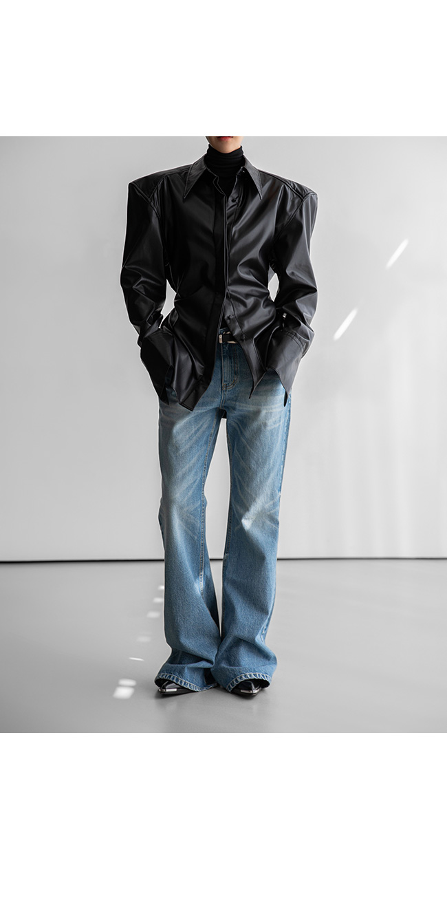 비건 레더 패디드 숄더 버튼 다운 셔츠를