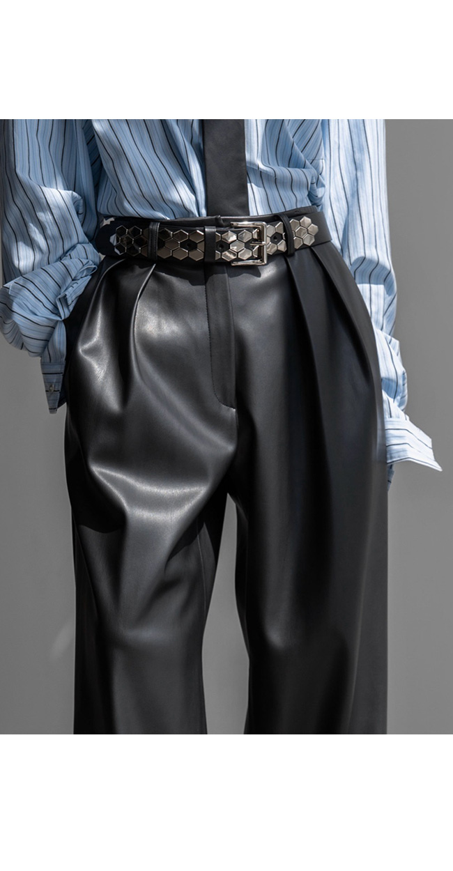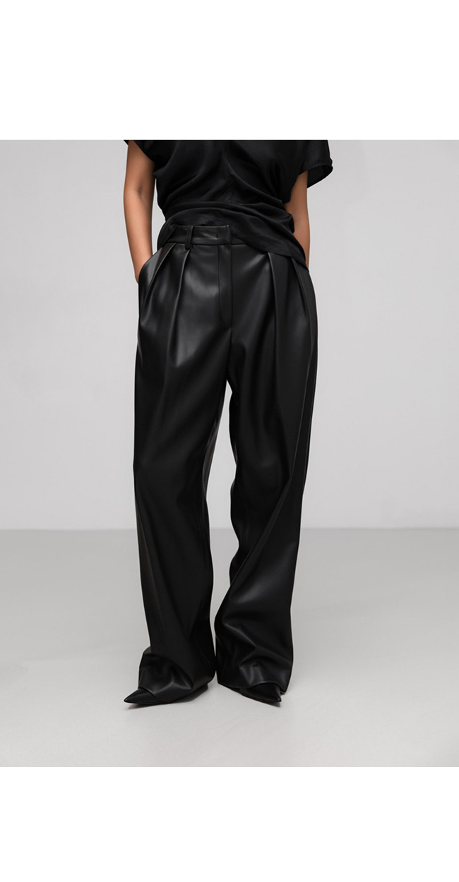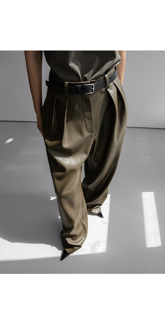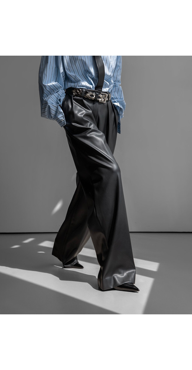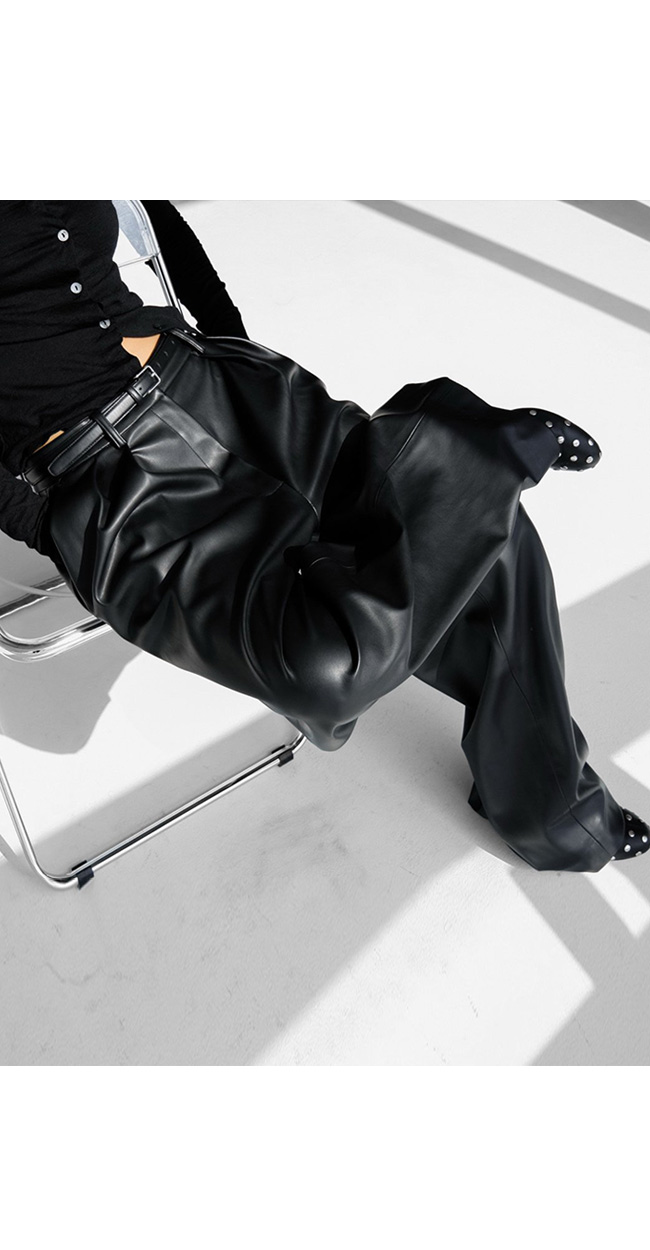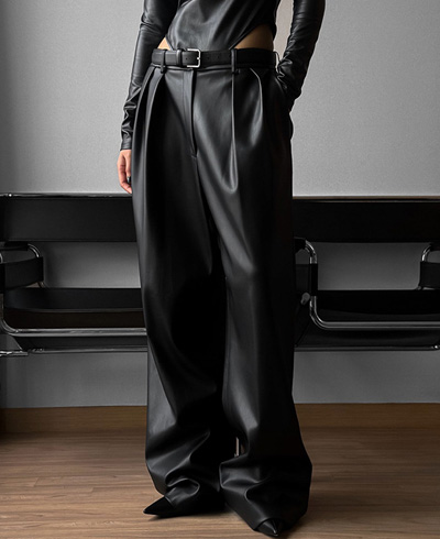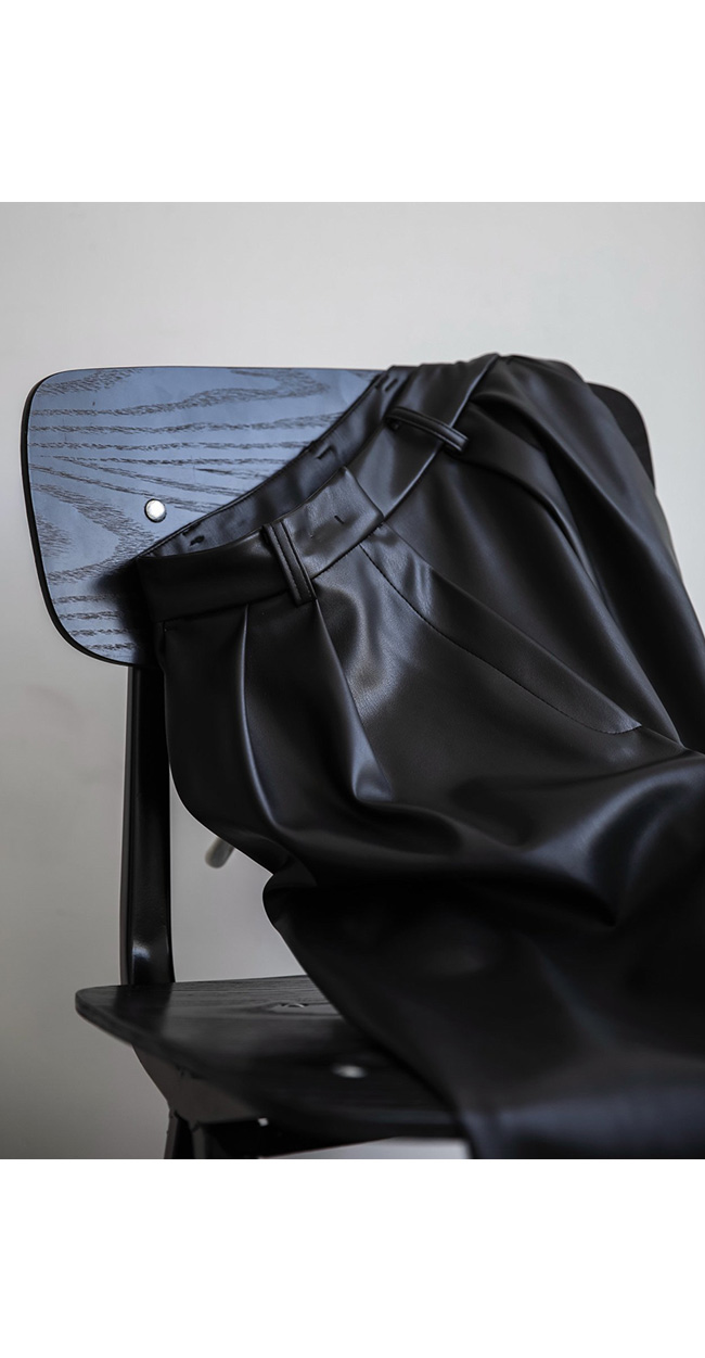 포멀한 테일러링 디테일의 트라우져를 레더 텍스쳐로 제작하여