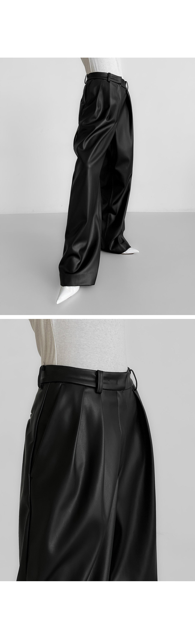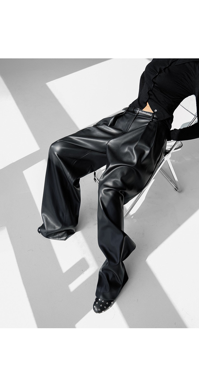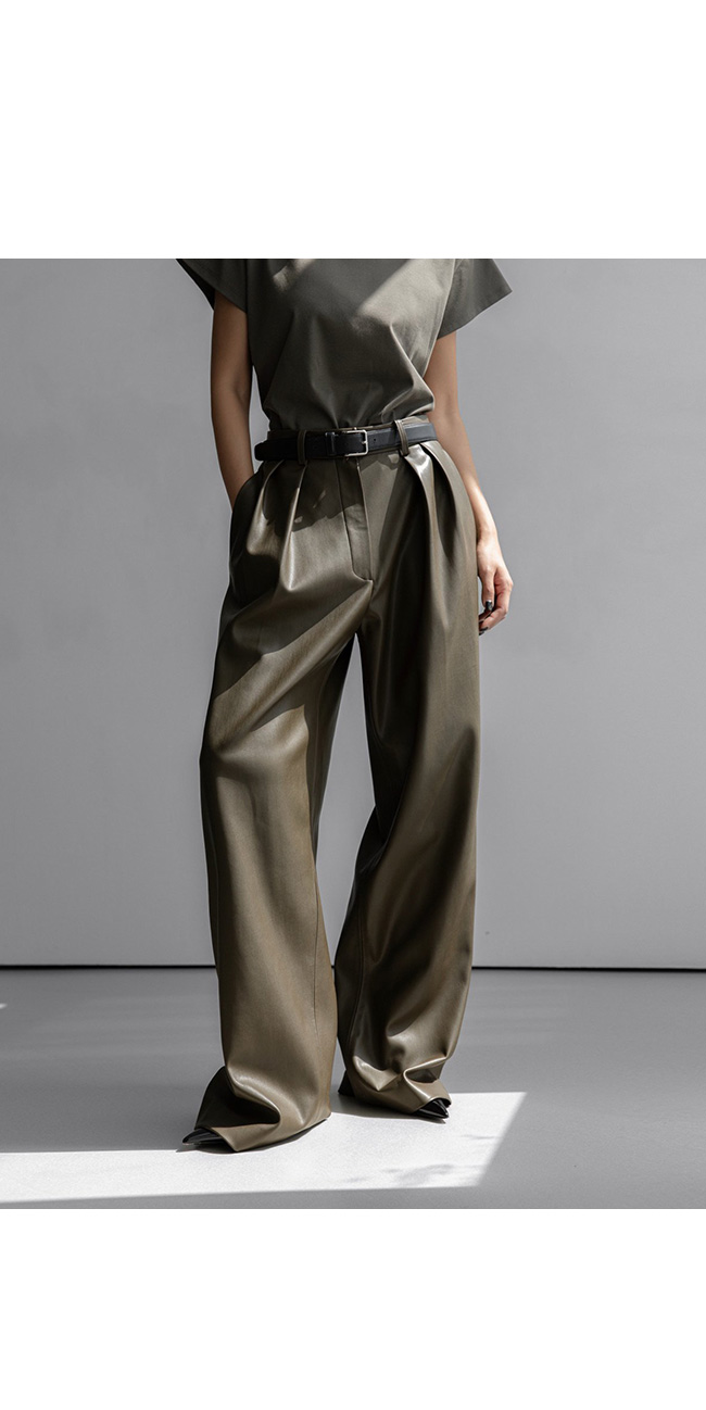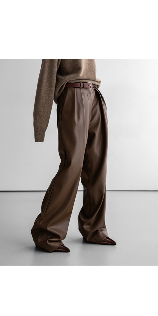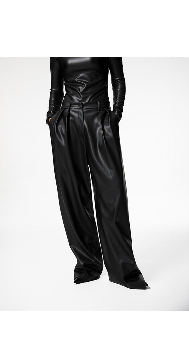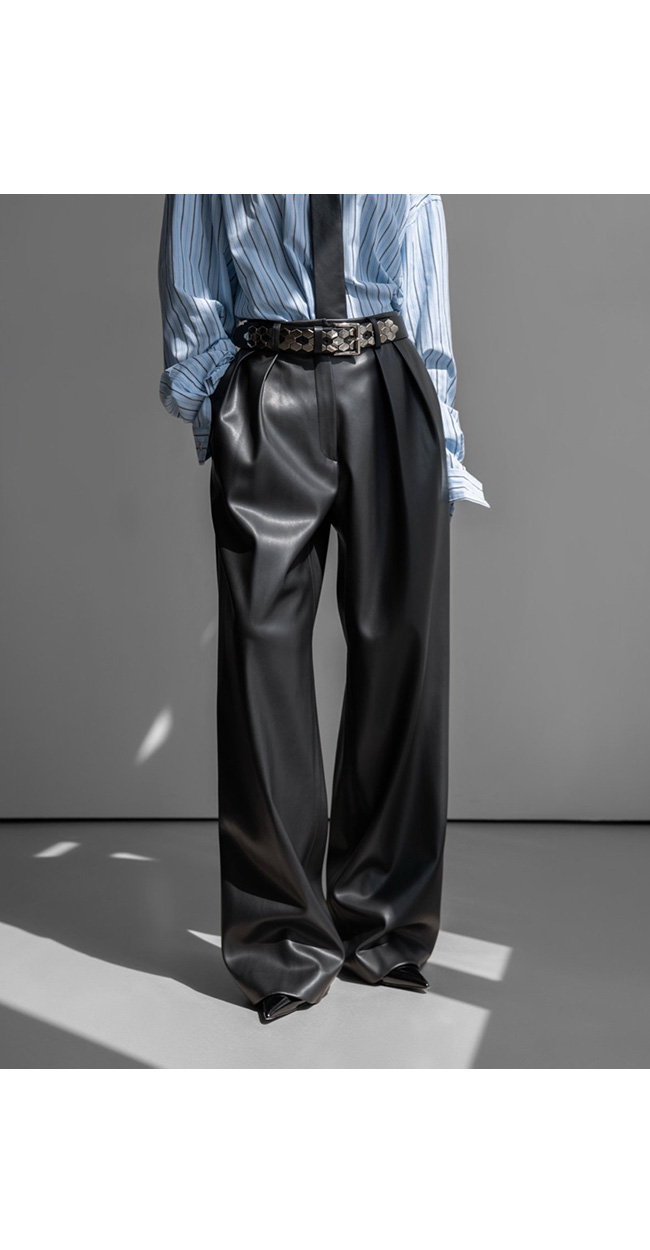 포멀한 테일러링 디테일의 트라우져를 레더 텍스쳐로 제작하여