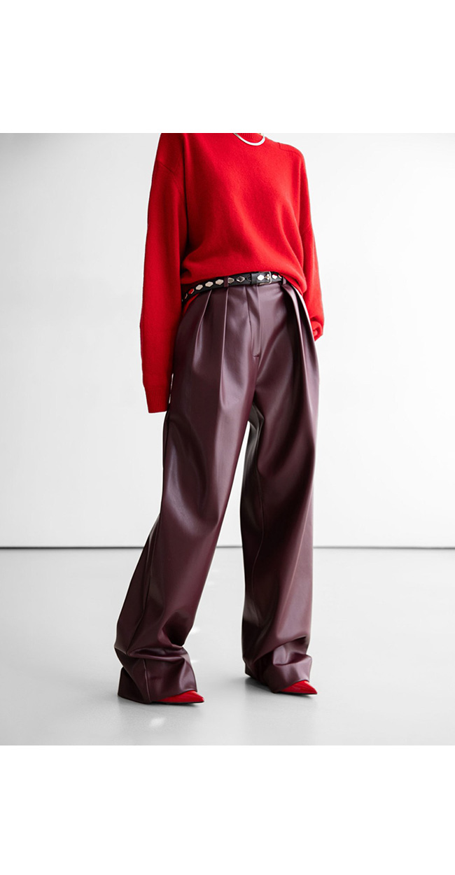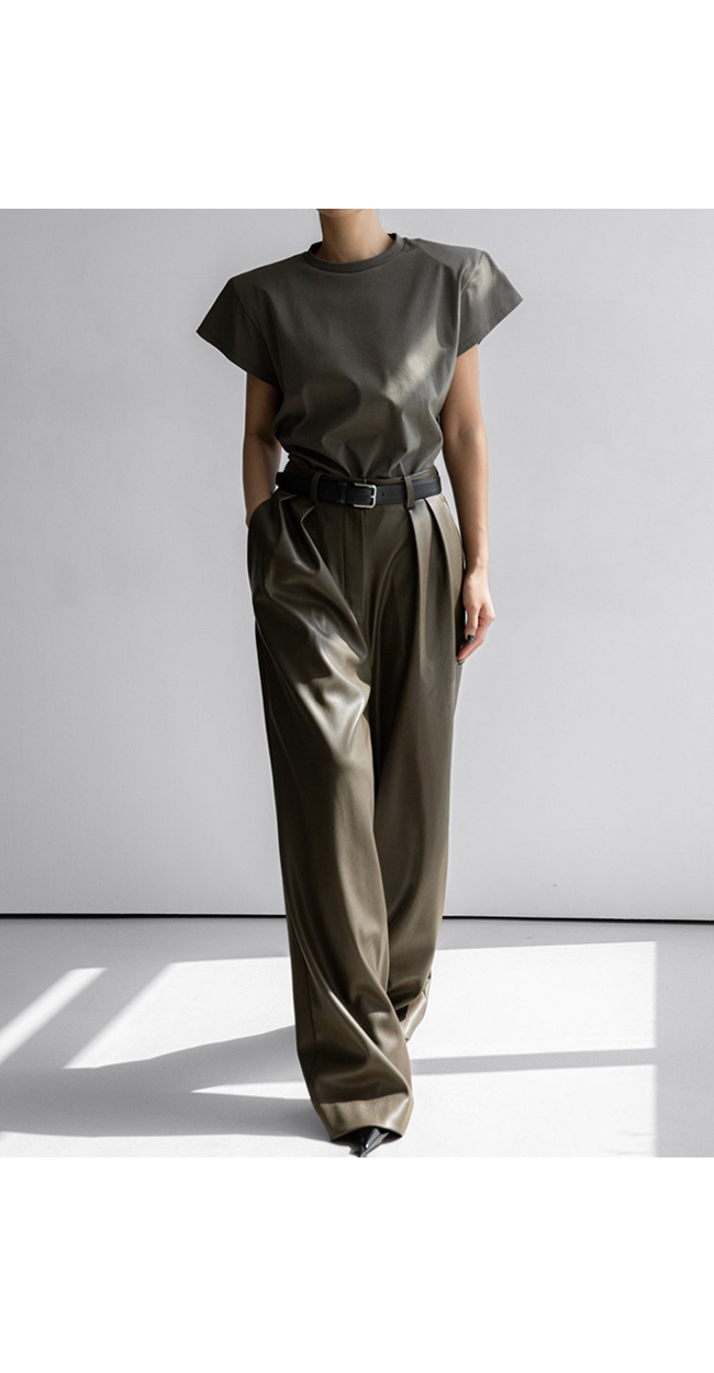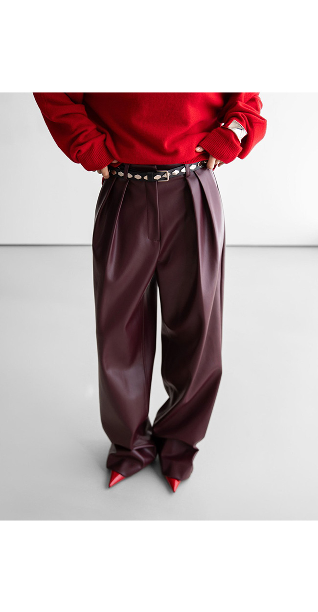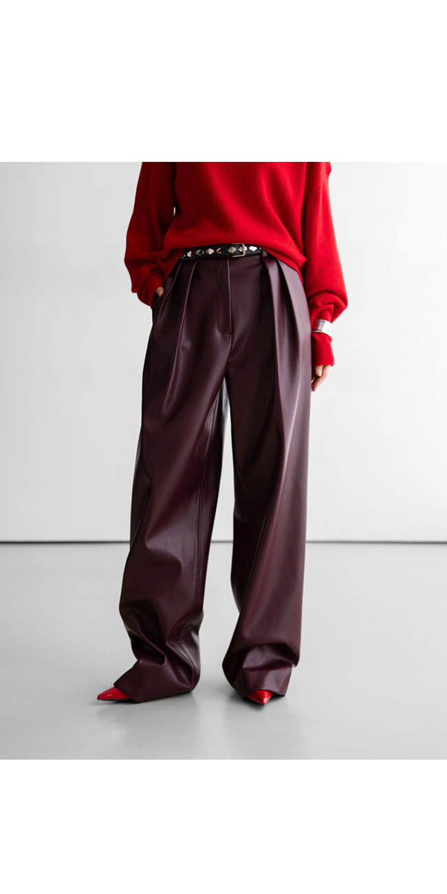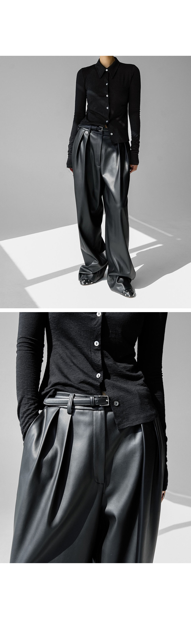 포멀한 테일러링 디테일의 트라우져를 레더 텍스쳐로 제작하여