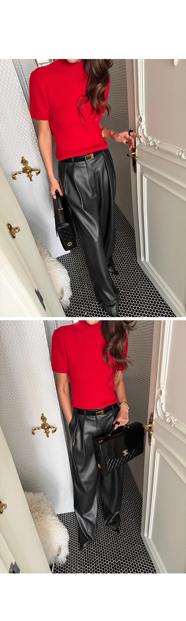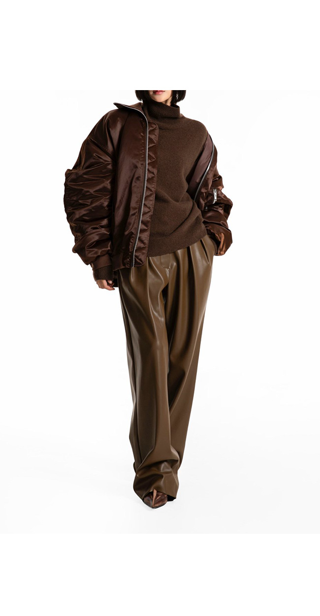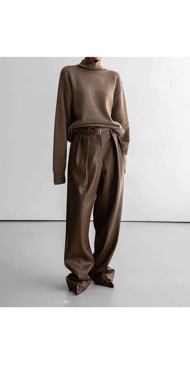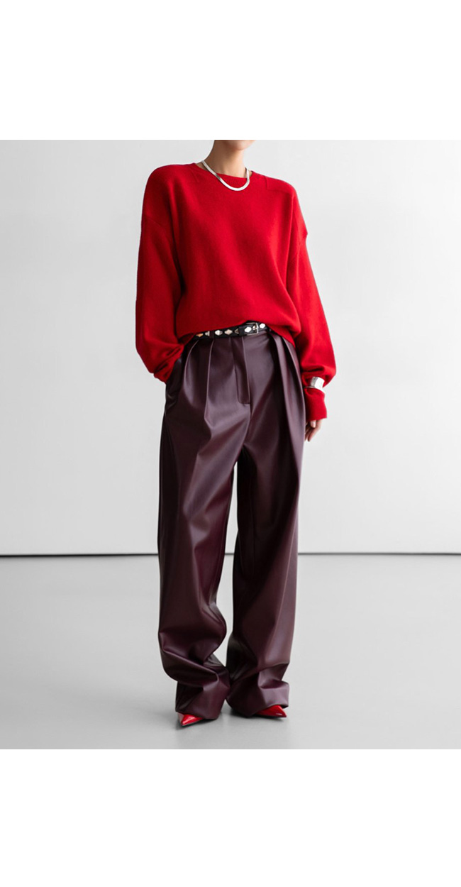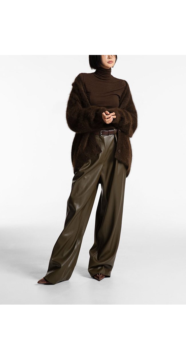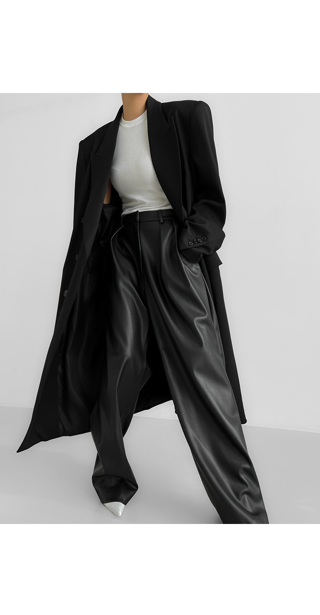 포멀한 테일러링 디테일의 트라우져를 레더 텍스쳐로 제작하여