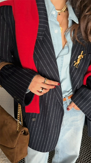 넓은 라펠과 구조적인 어깨 라인이 더해져