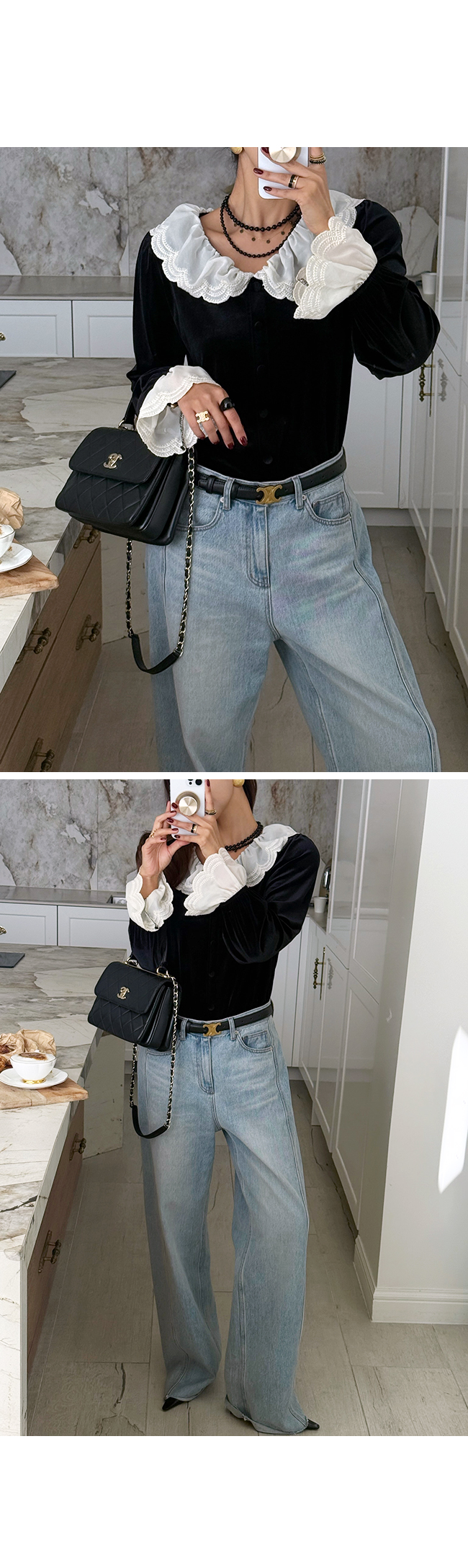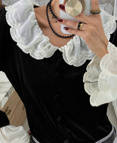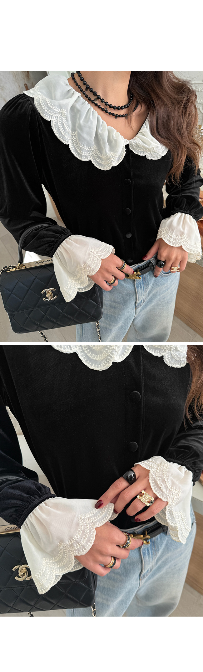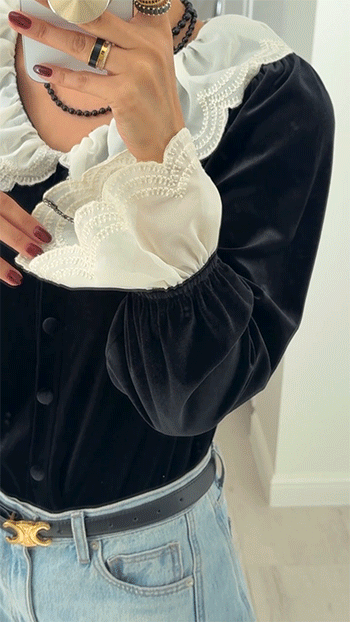 소장 가치 높은 벨벳 프릴 블라우스입니다.