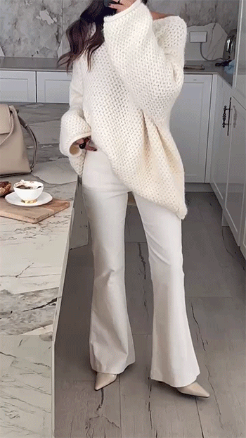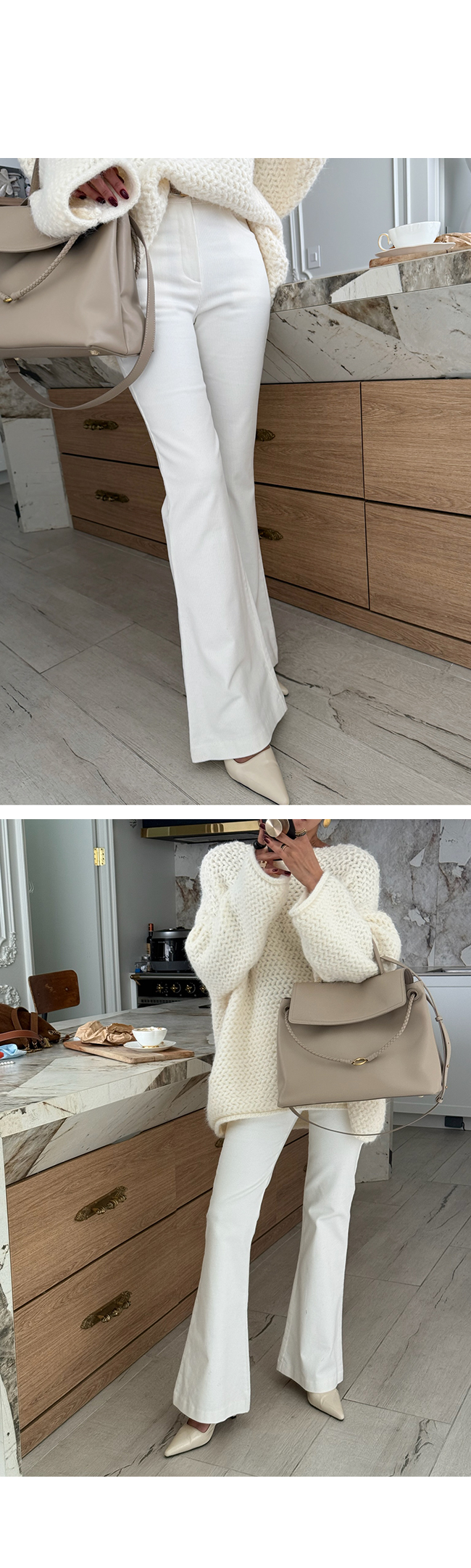 무릎 아래로 자연스럽게 퍼지는 부츠컷 라인이