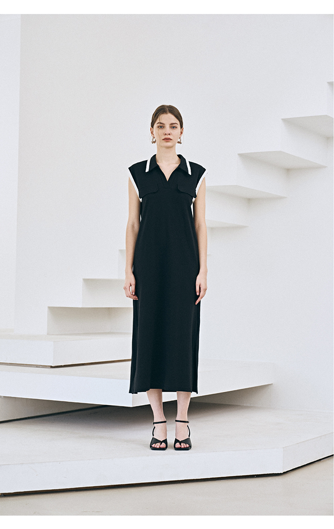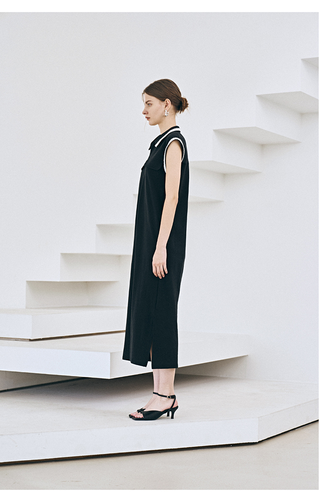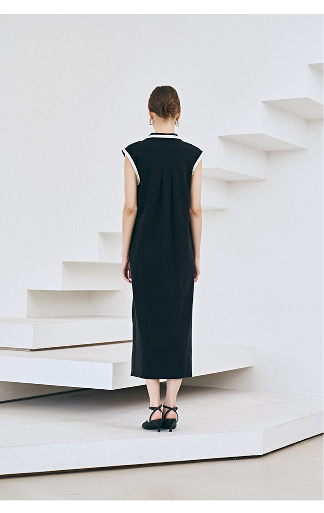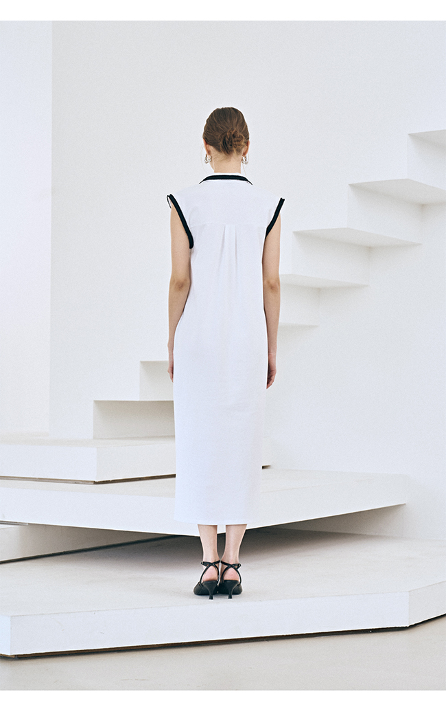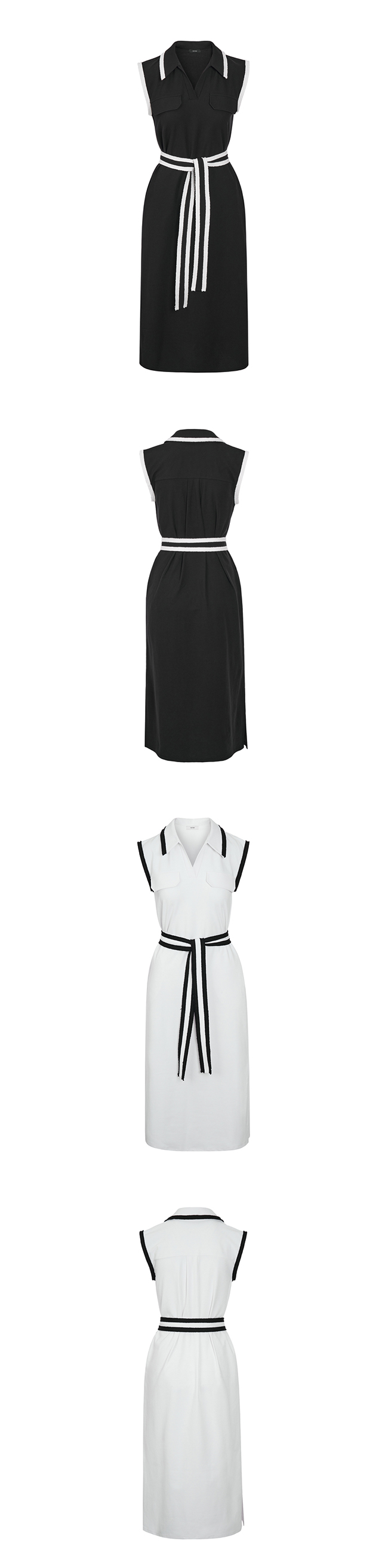 - 오픈형 카라 디자인에 배색 포인트를 준 슬리브리스 원피스