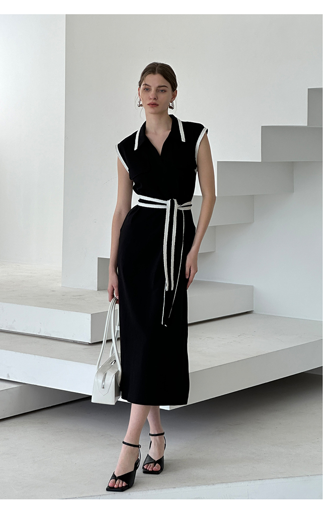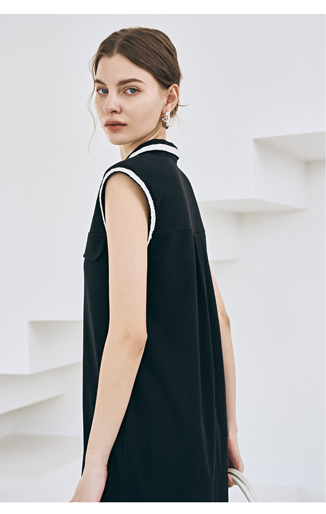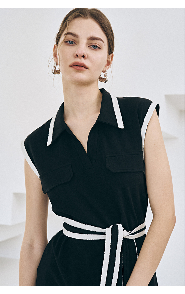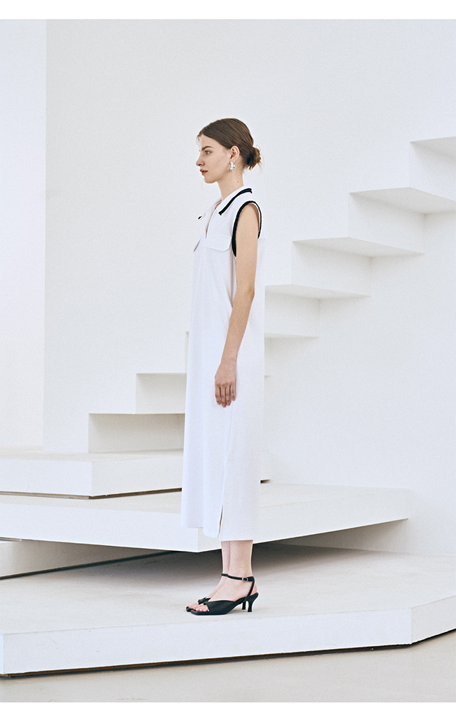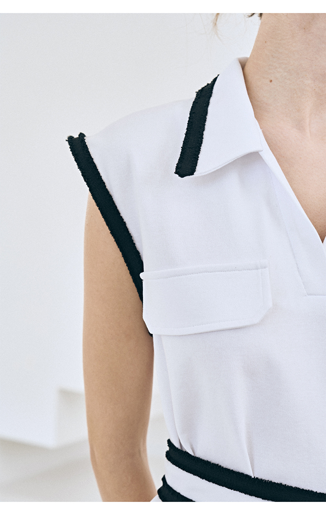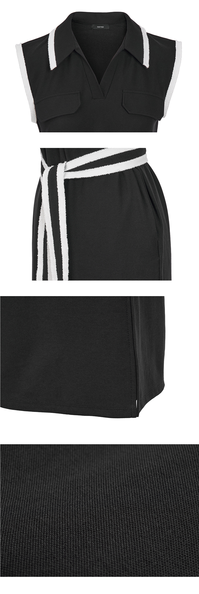 - 오픈형 카라 디자인에 배색 포인트를 준 슬리브리스 원피스