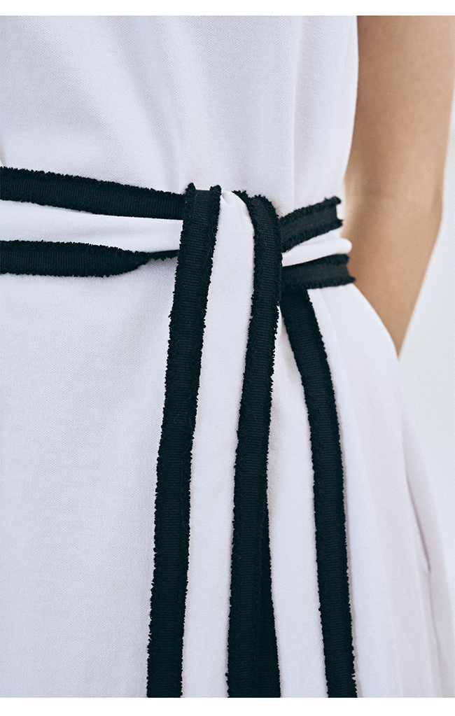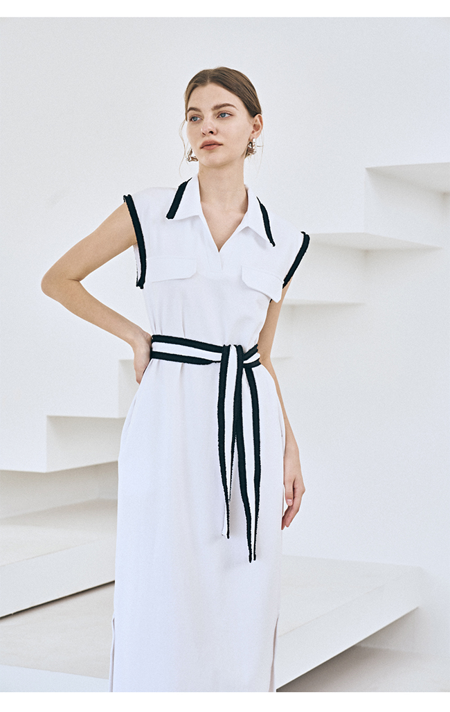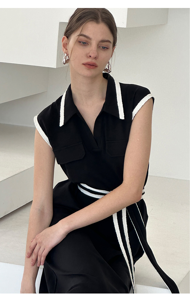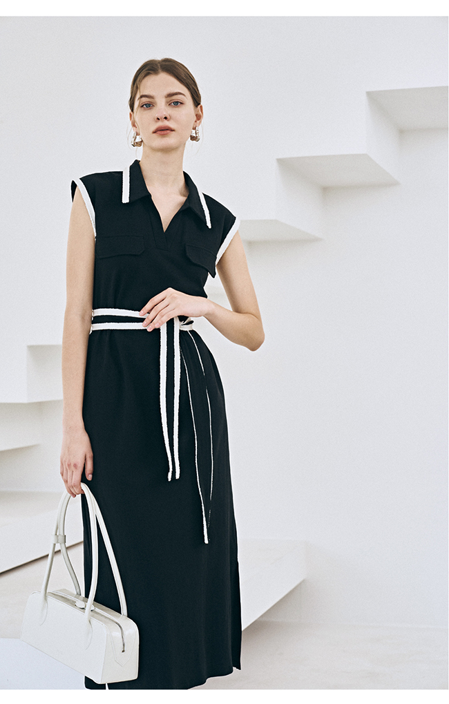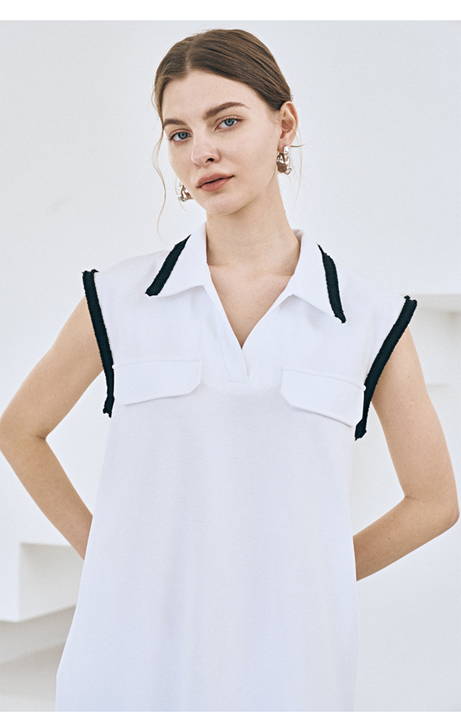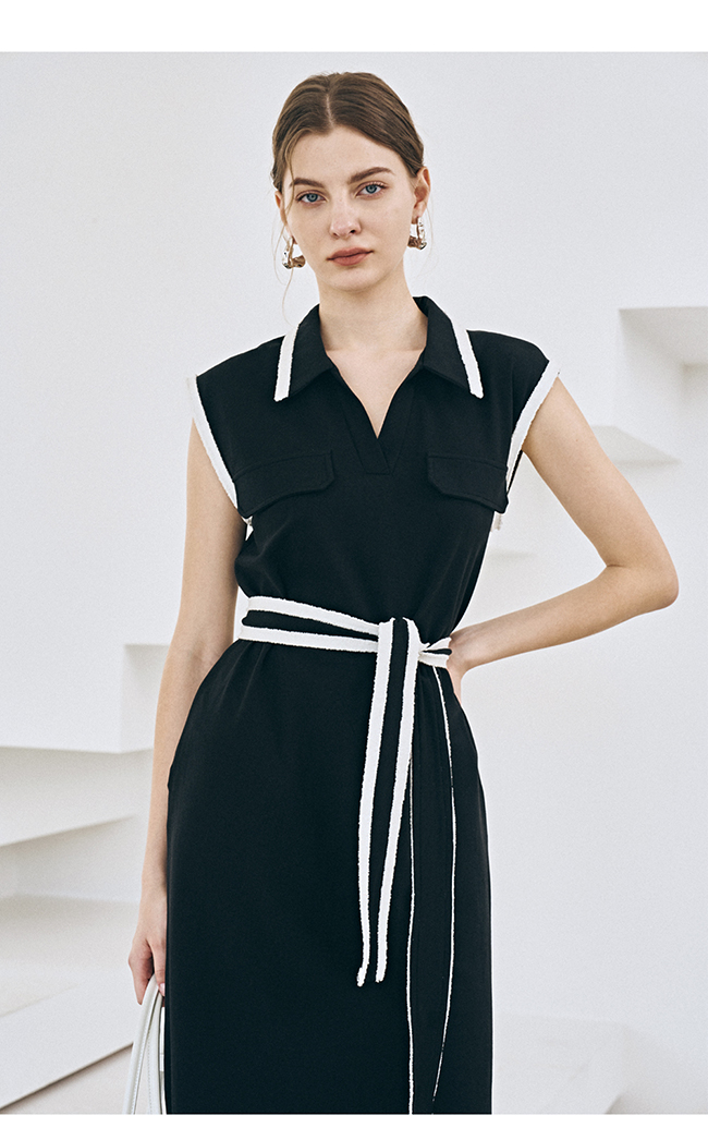 - 오픈형 카라 디자인에 배색 포인트를 준 슬리브리스 원피스
