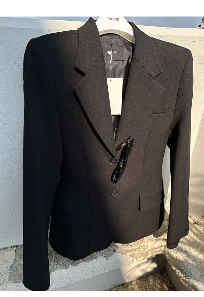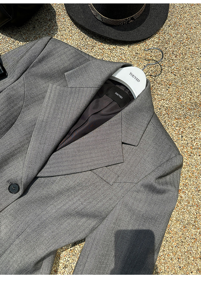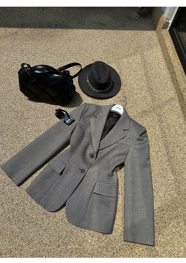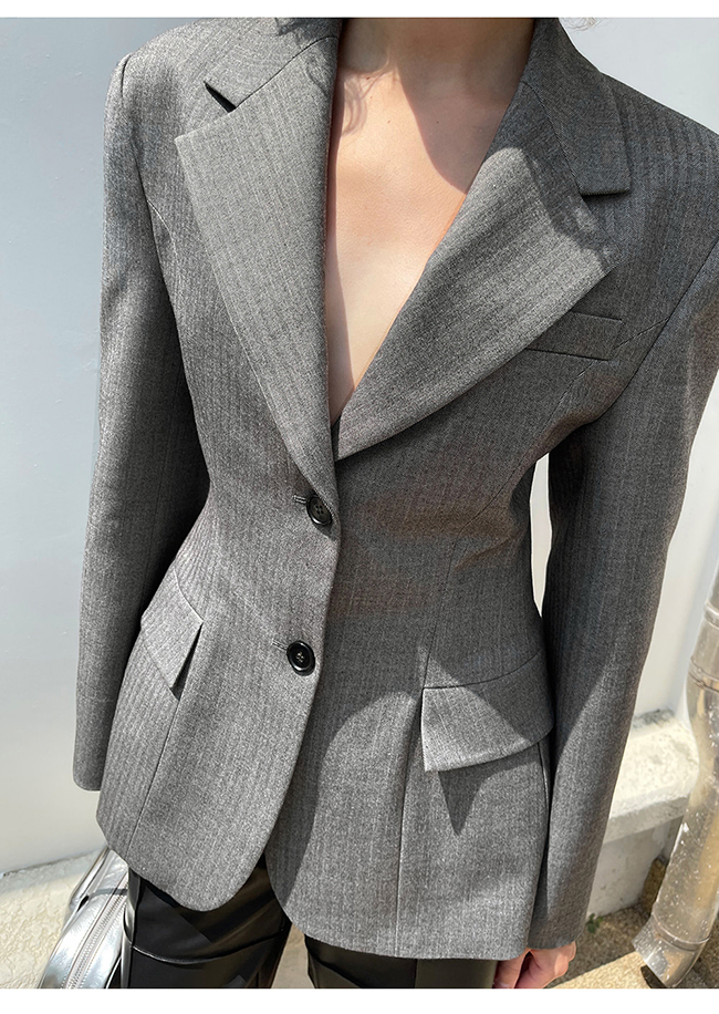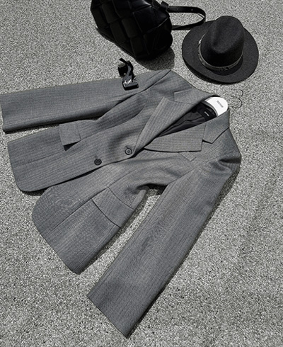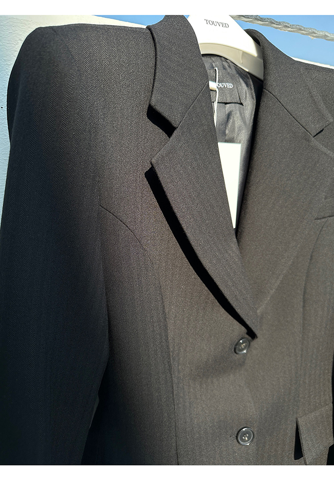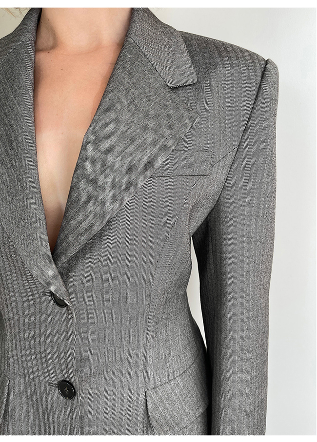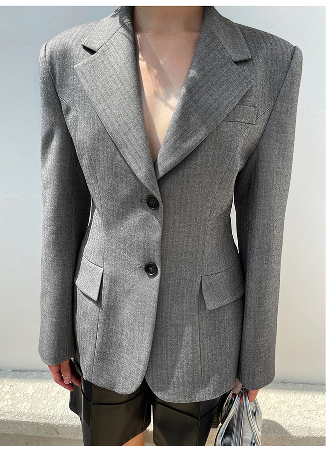 - 헤링본 소재를 사용한 아워글래스 라인의 투버튼 자켓