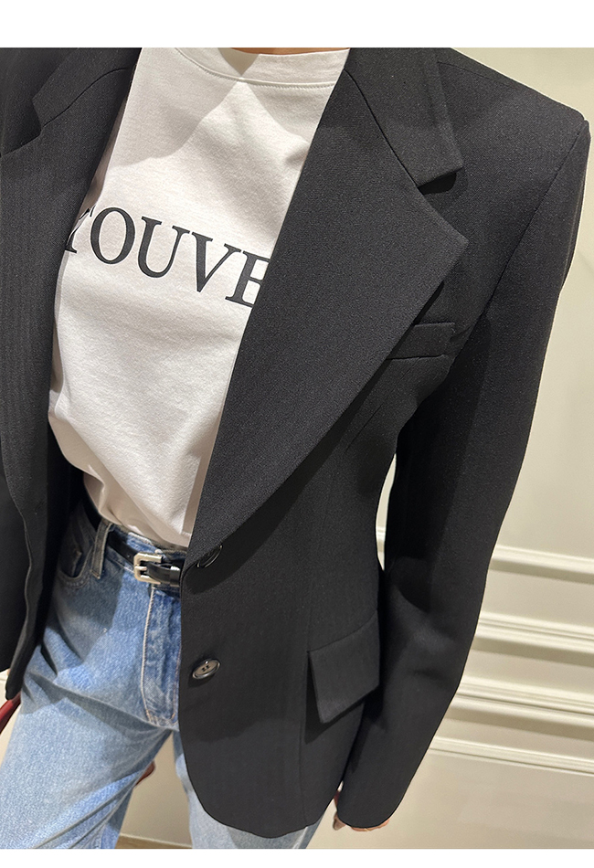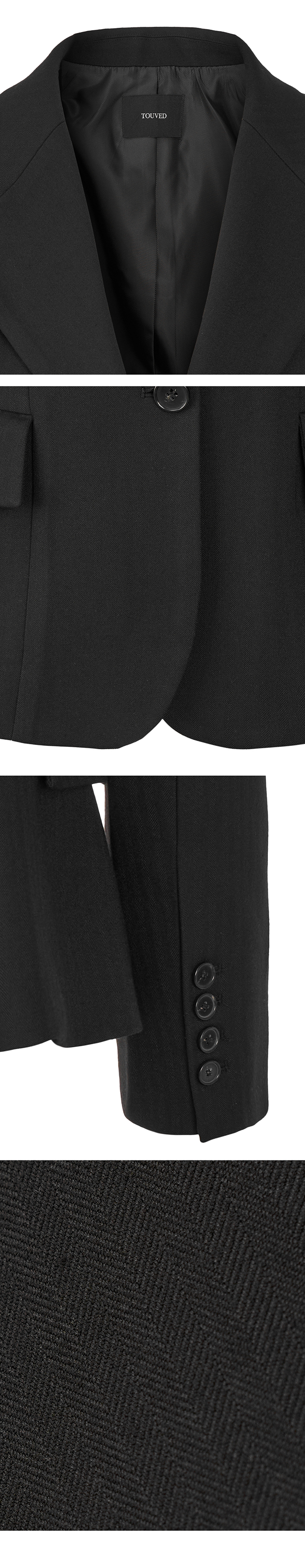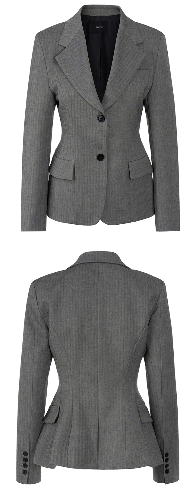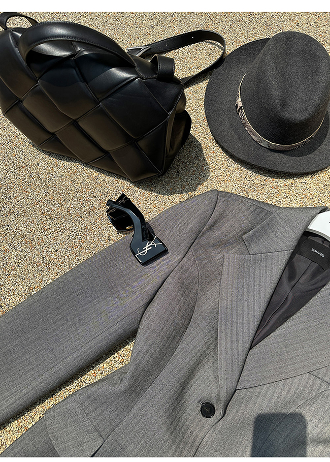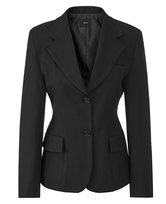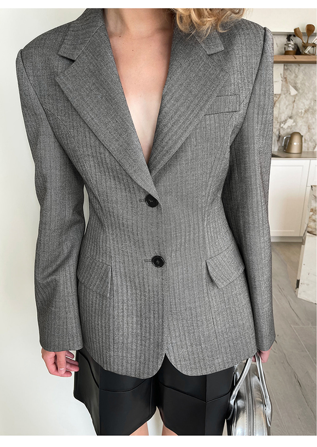 - 헤링본 소재를 사용한 아워글래스 라인의 투버튼 자켓