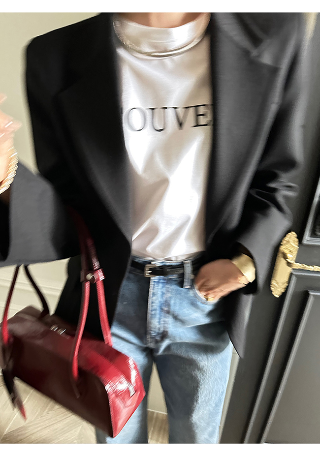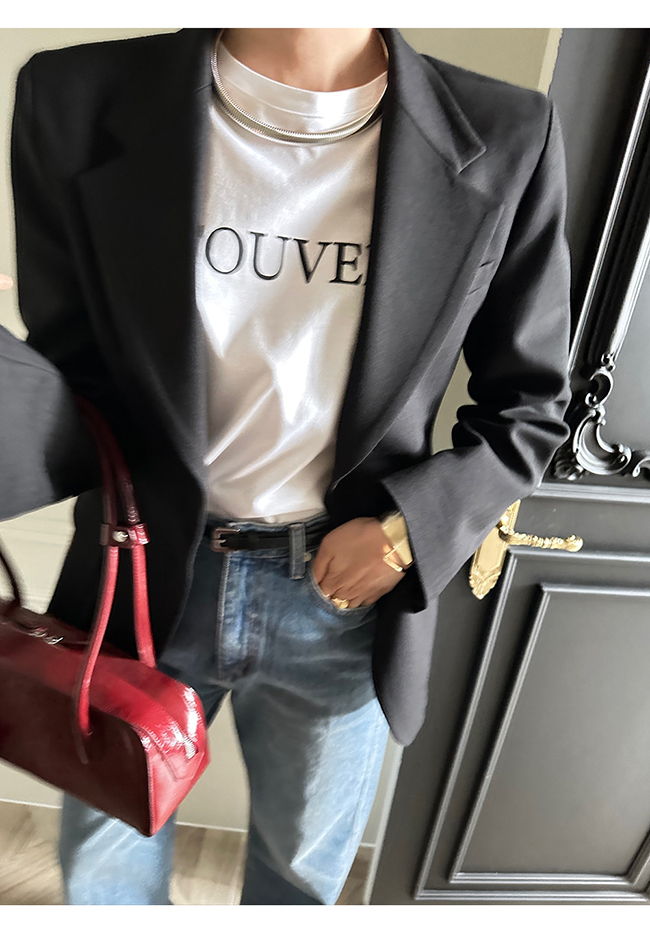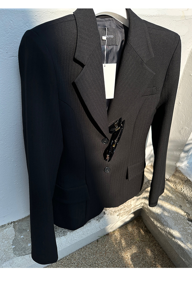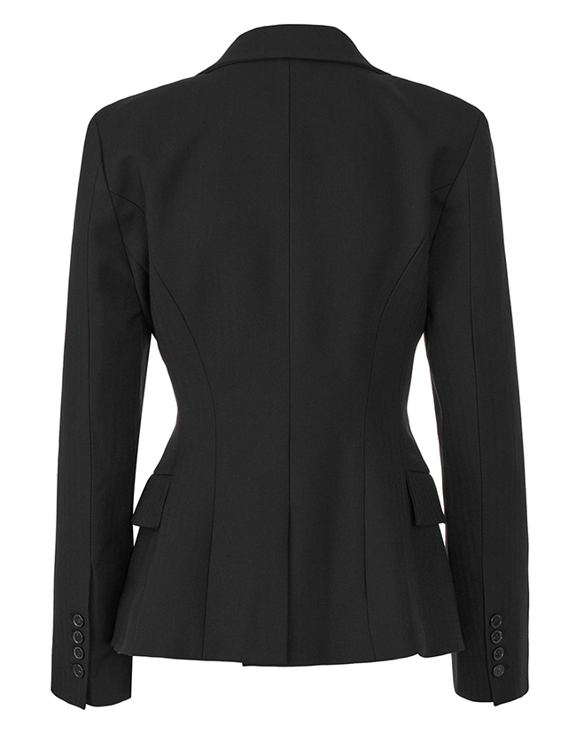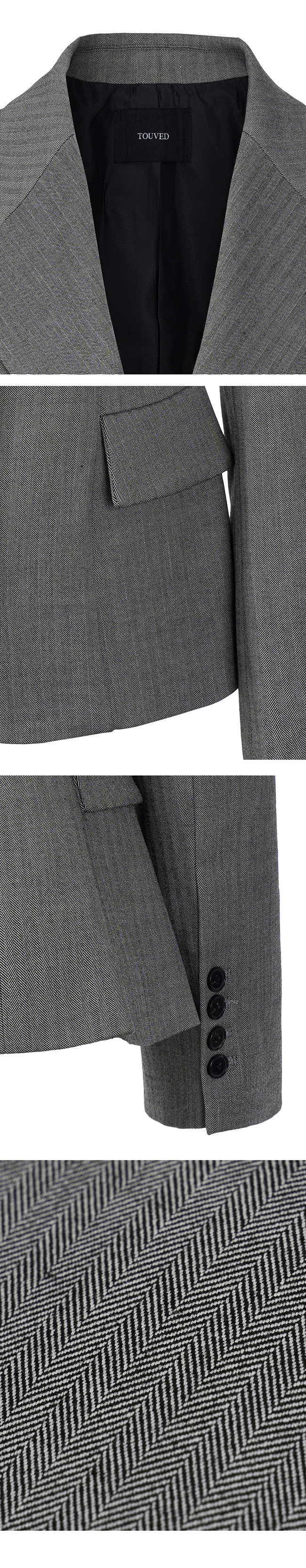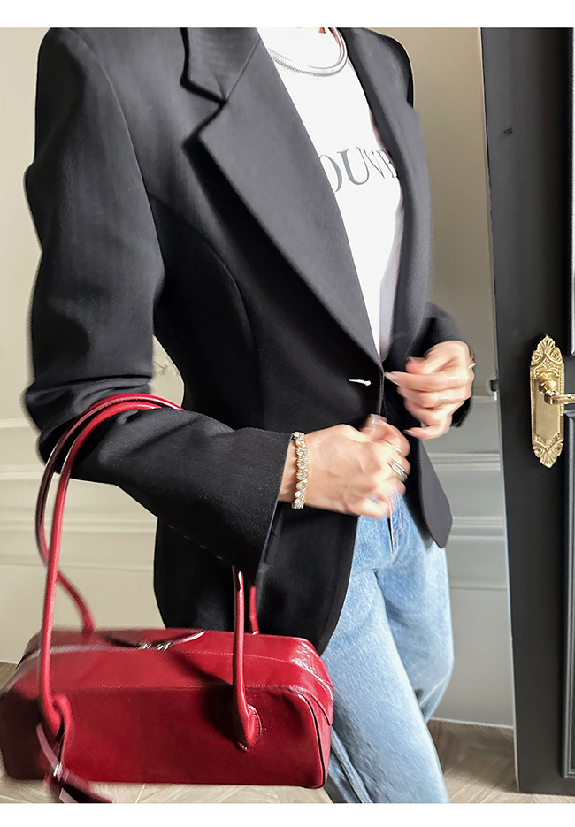 - 헤링본 소재를 사용한 아워글래스 라인의 투버튼 자켓
