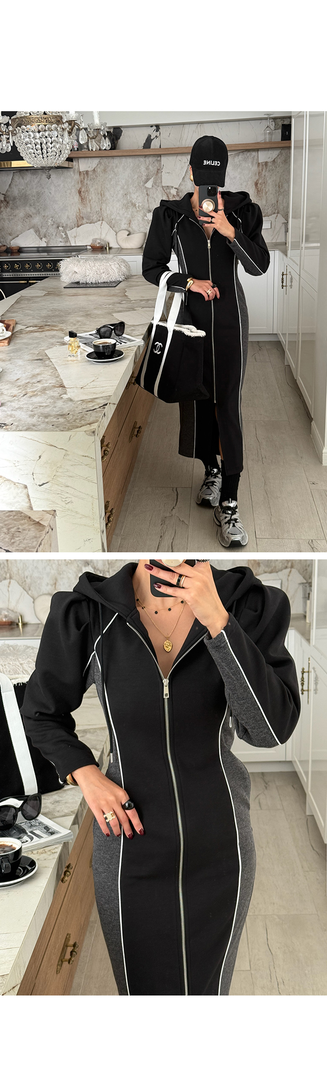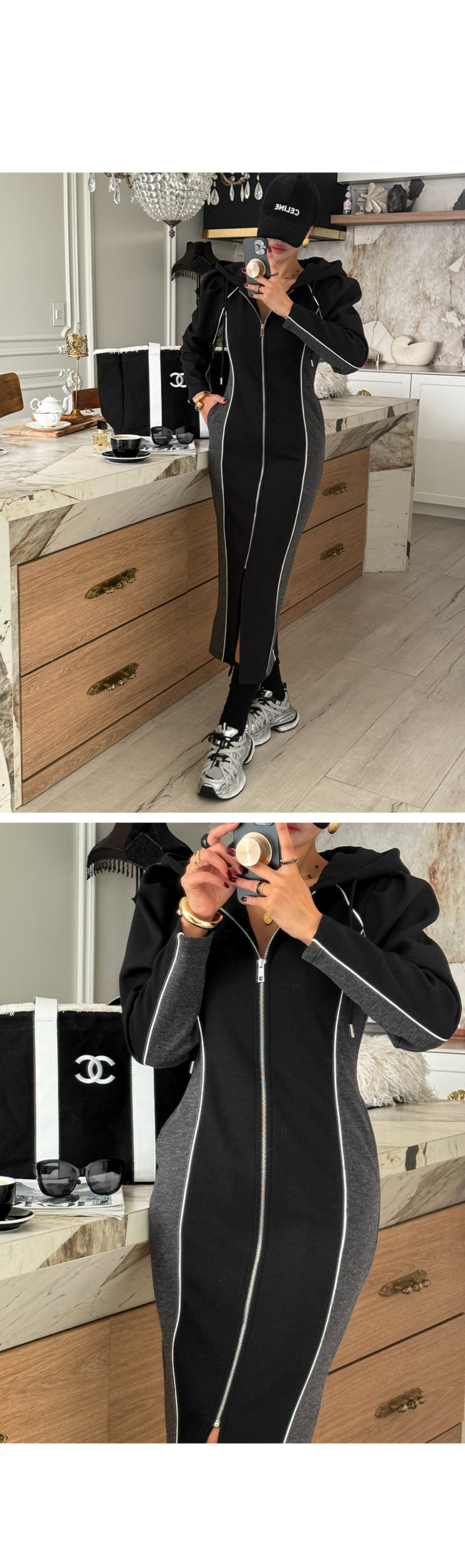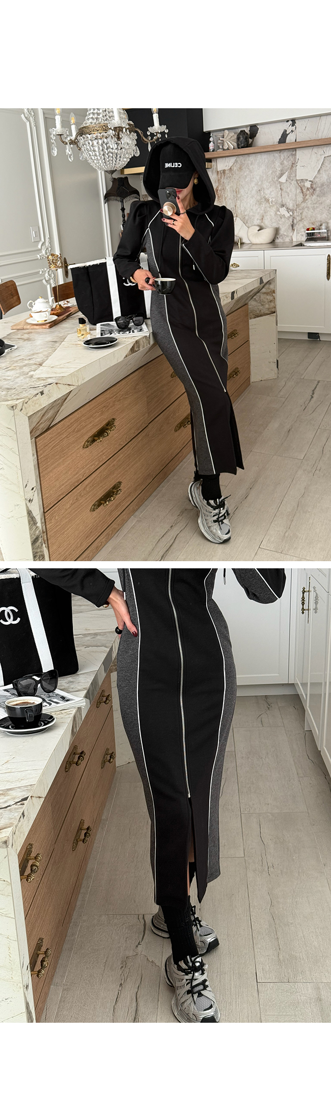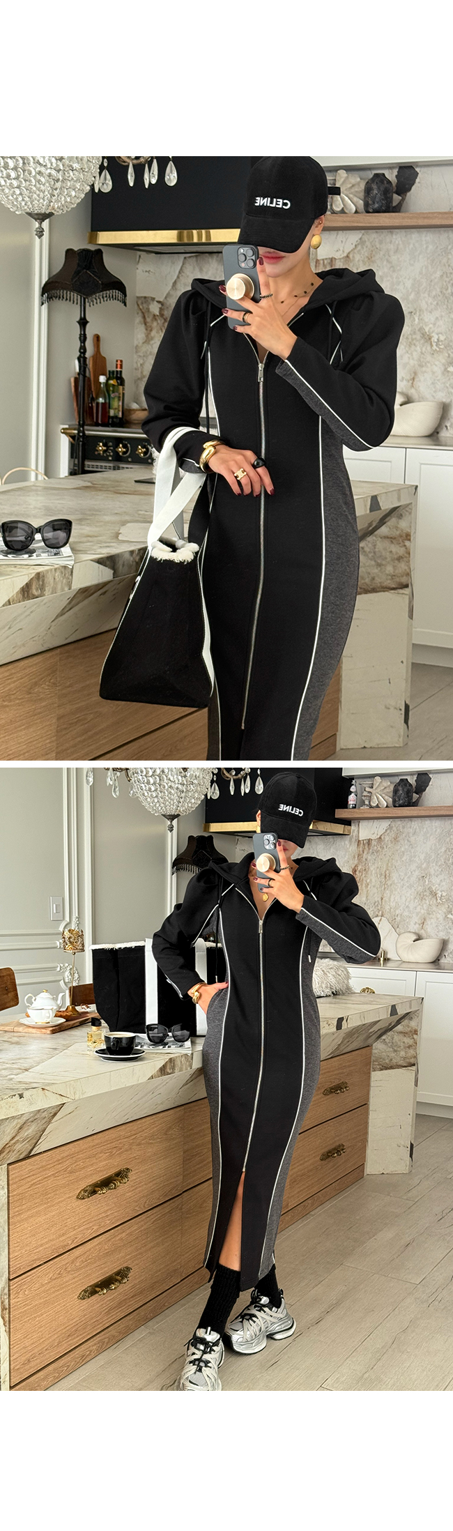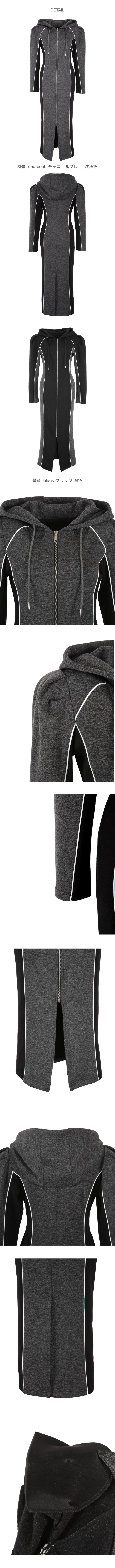 하이엔드 무드의 후드 배색 롱집업 원피스 소개해드릴게요.