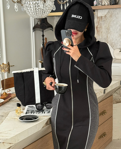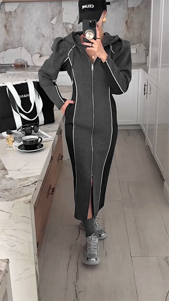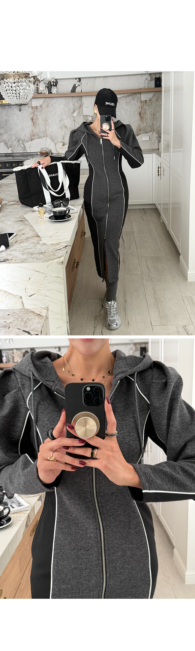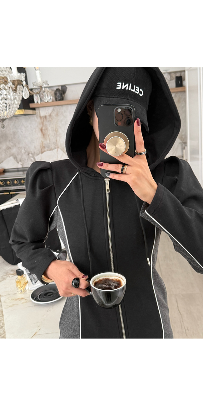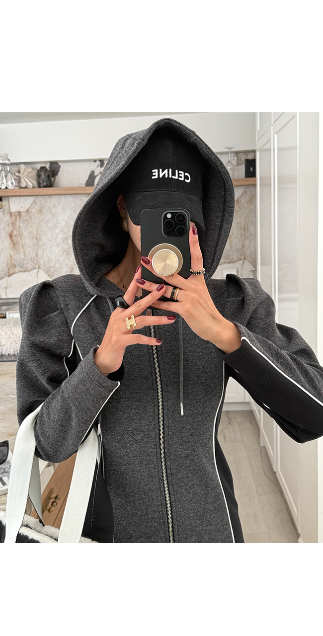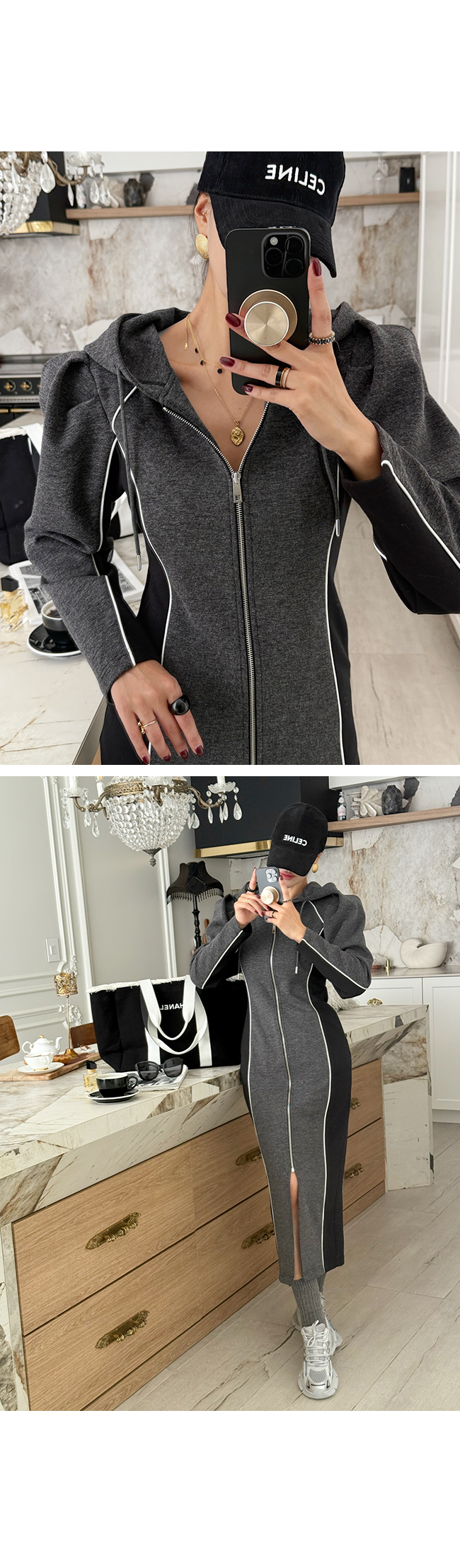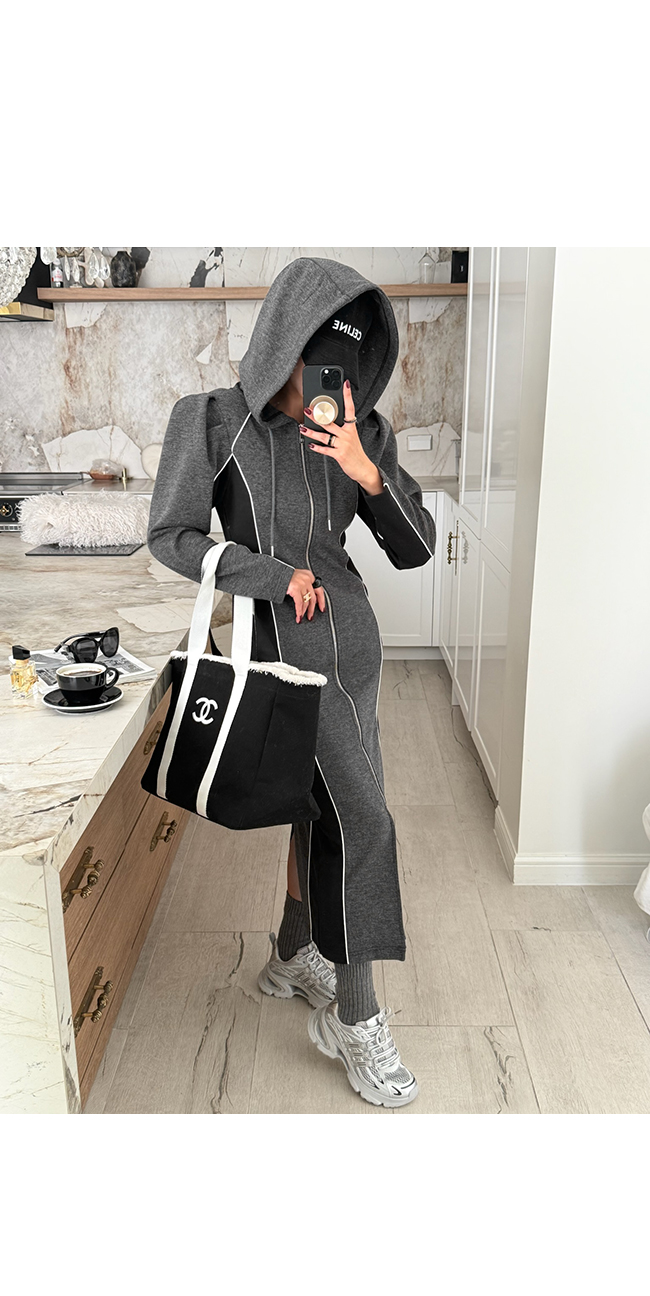 하이엔드 무드의 후드 배색 롱집업 원피스 소개해드릴게요.