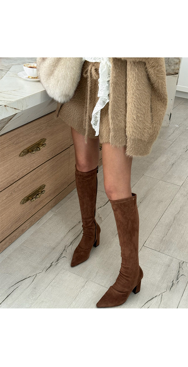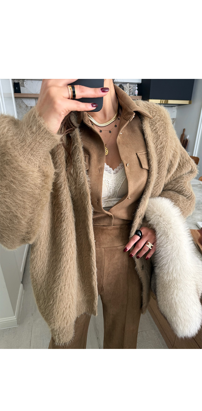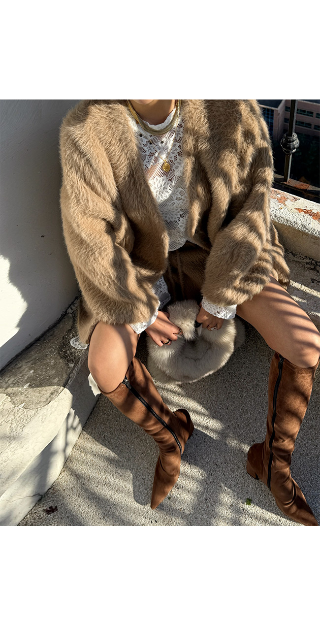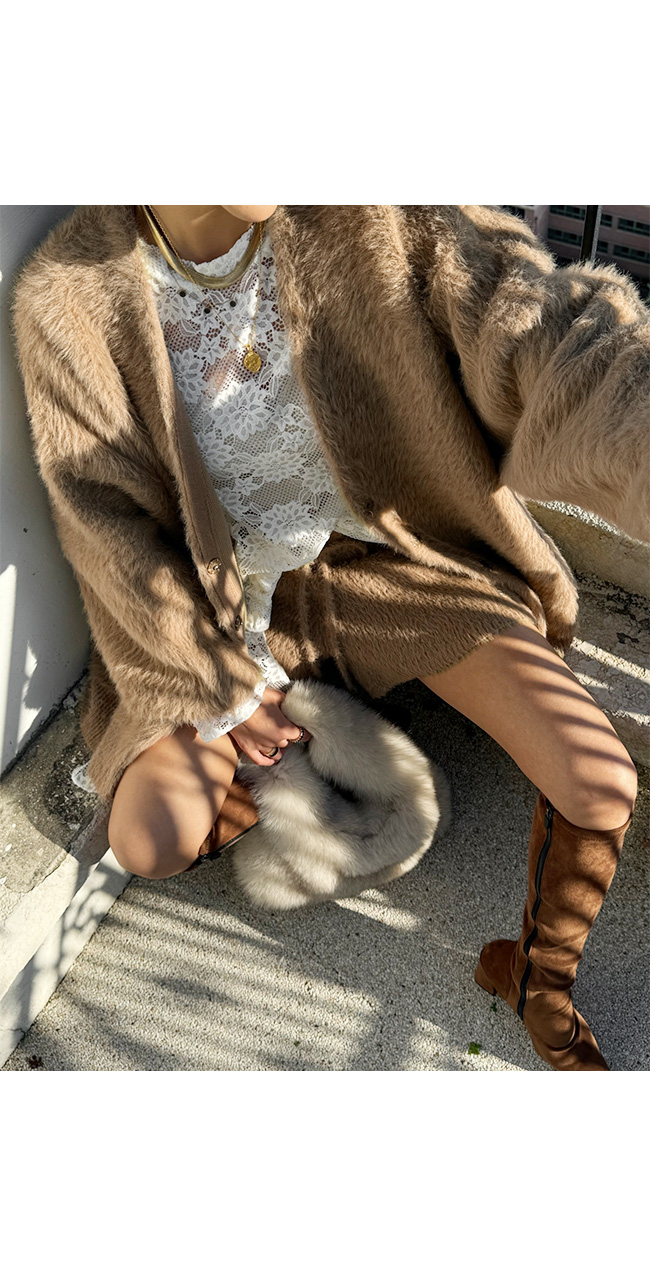같은 소재의 퍼 숏 팬츠와 함께 세련된 셋업룩으로