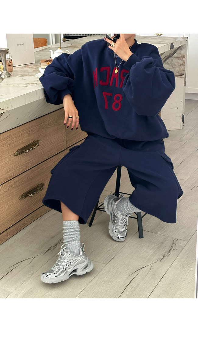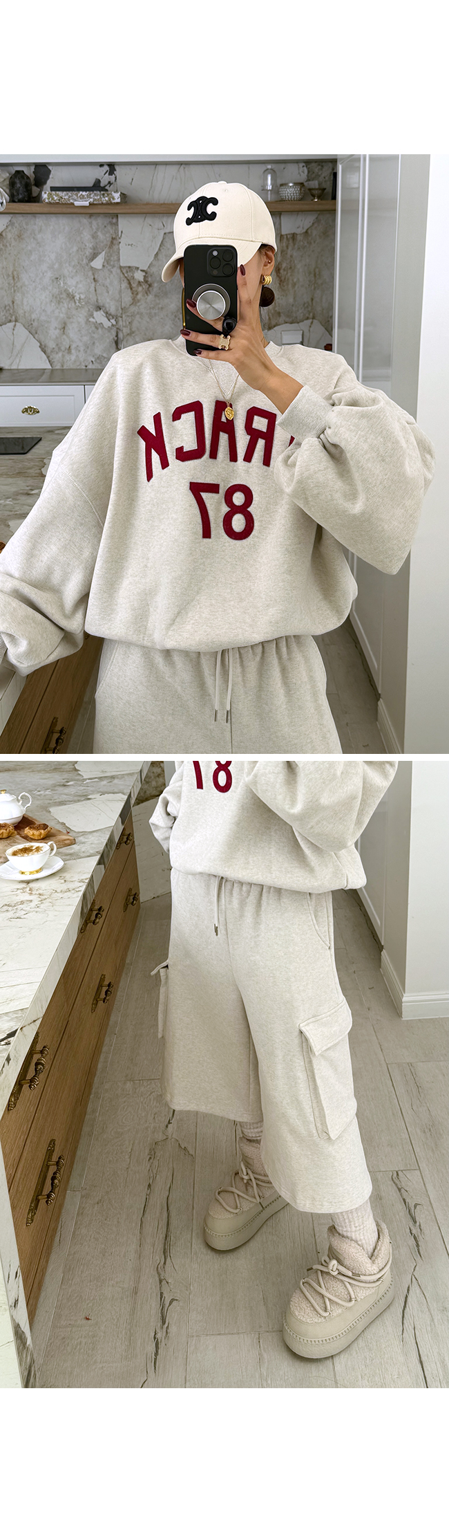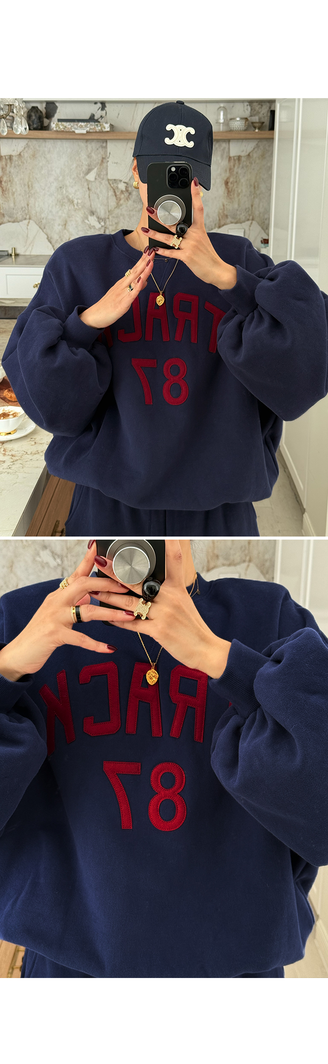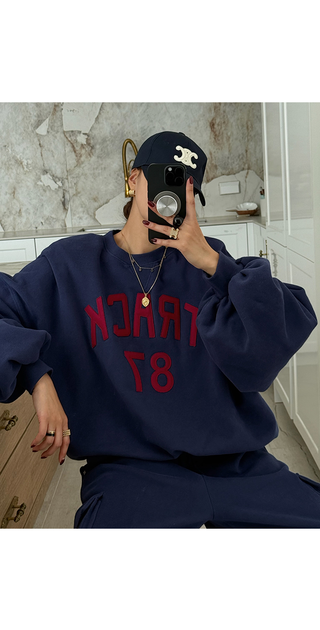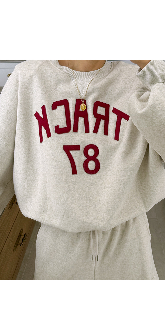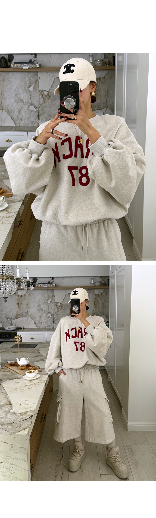 가장 큰 포인트는 전면의 입체 자수 레터링 디테일이에요.