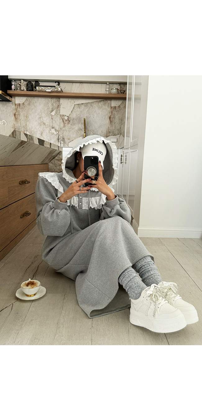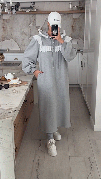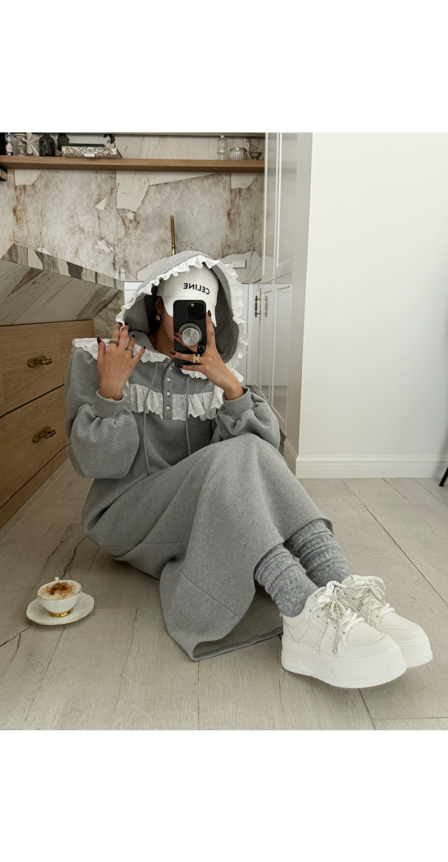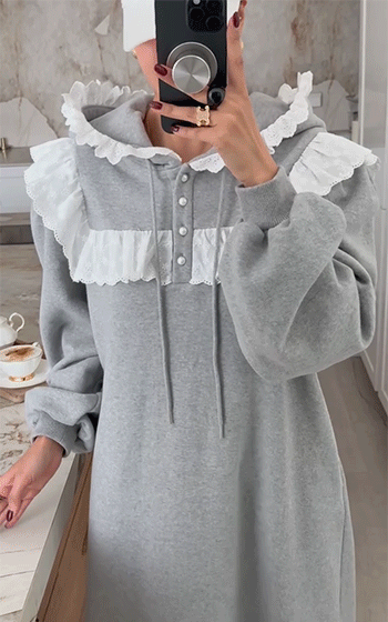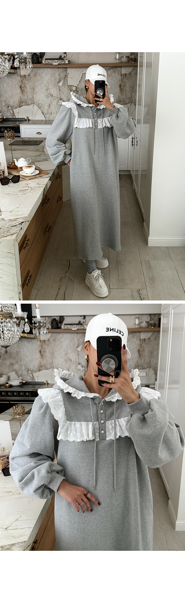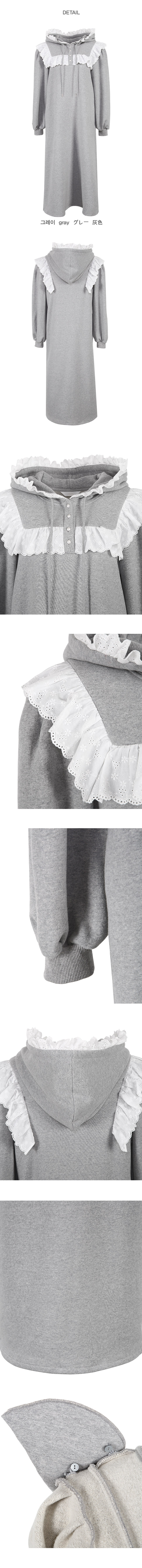 줄로그 자체제작만의 감각이 돋보이는 프릴 후드 원피스로