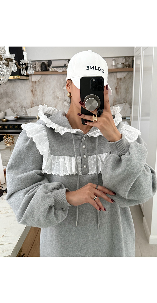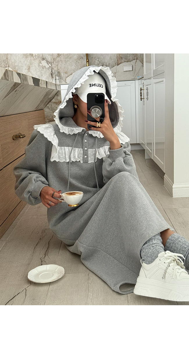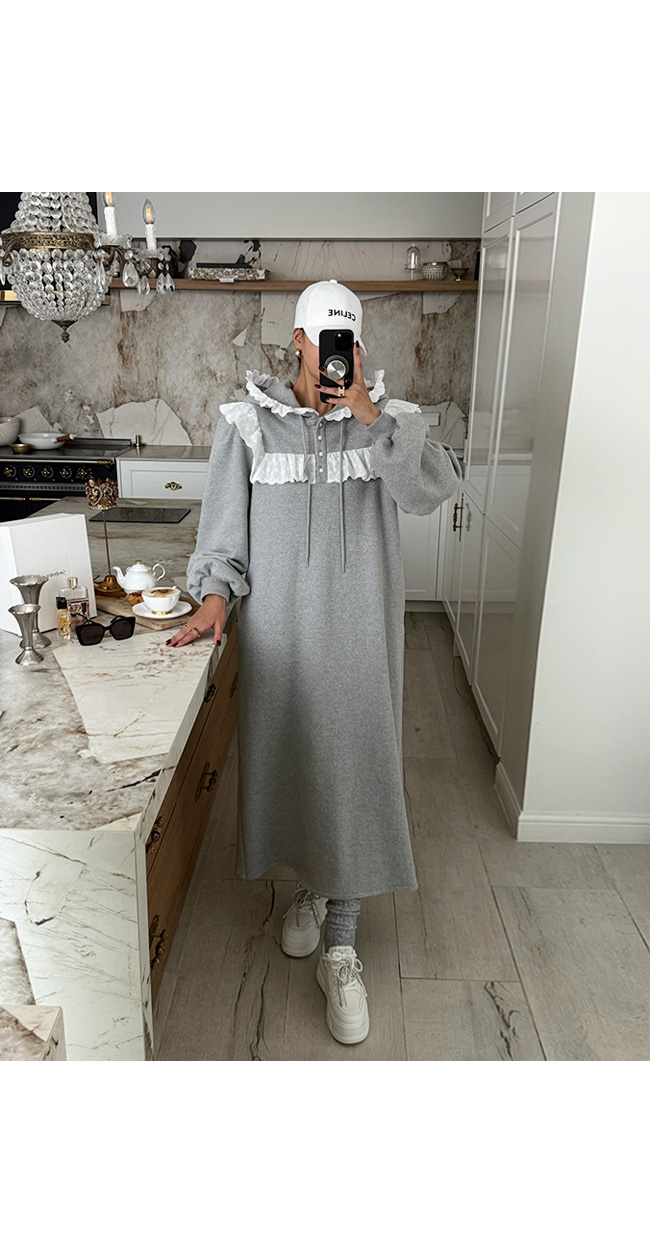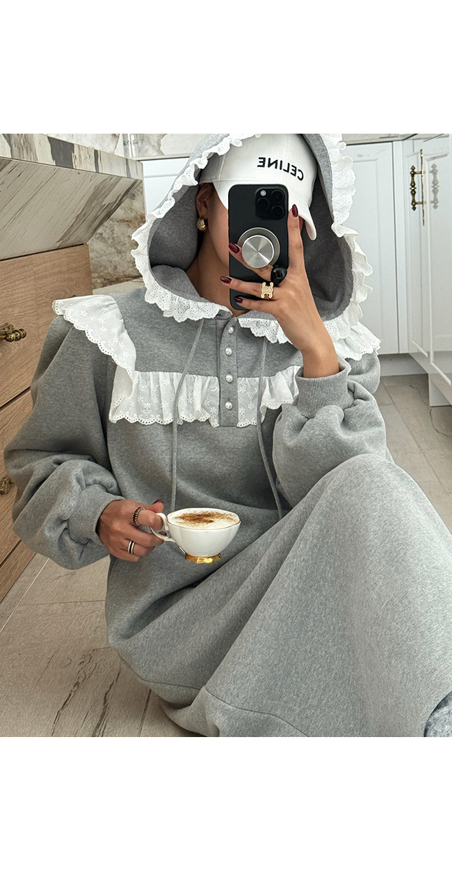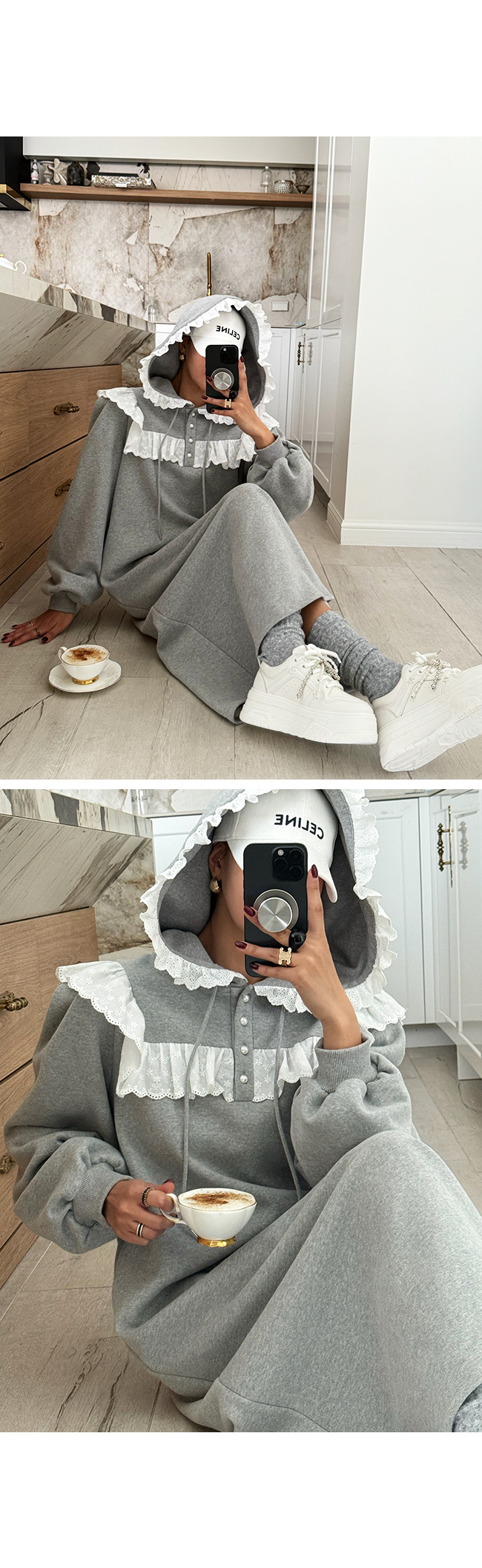 줄로그 자체제작만의 감각이 돋보이는 프릴 후드 원피스로