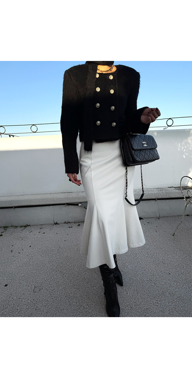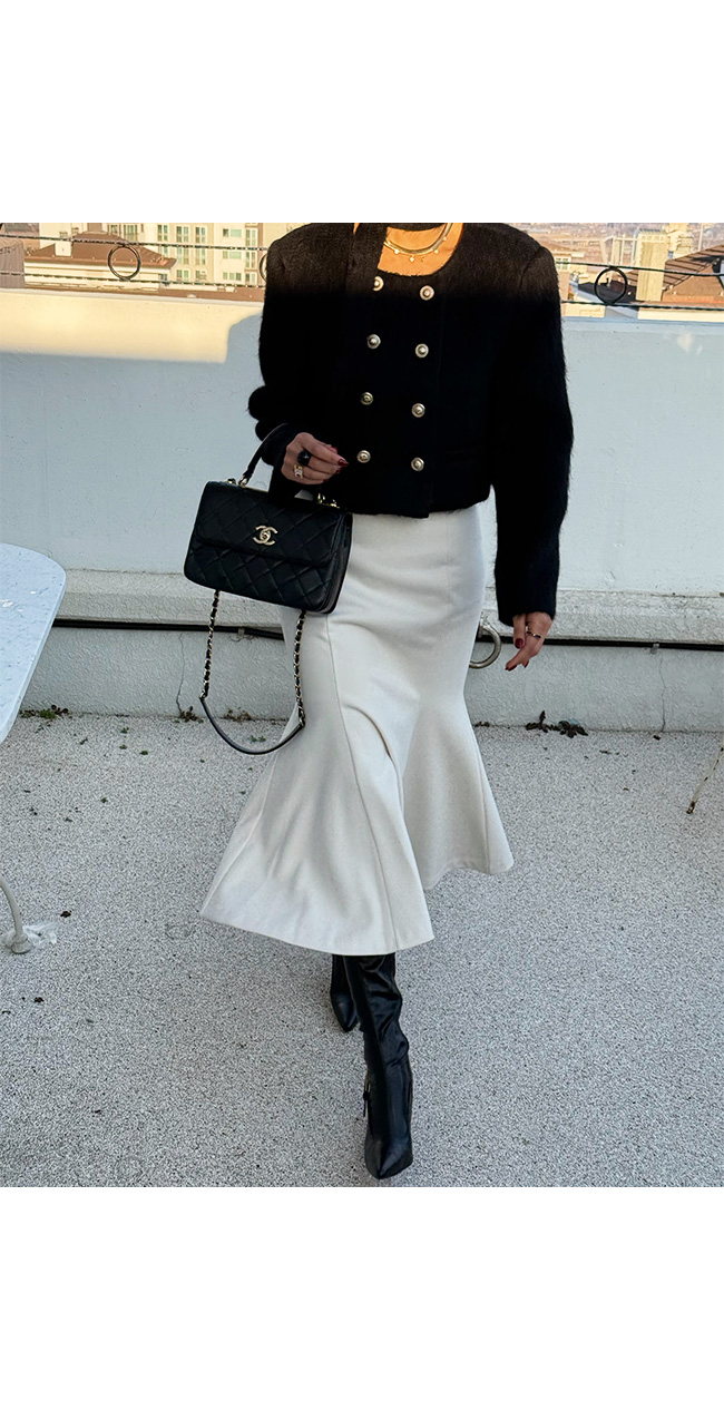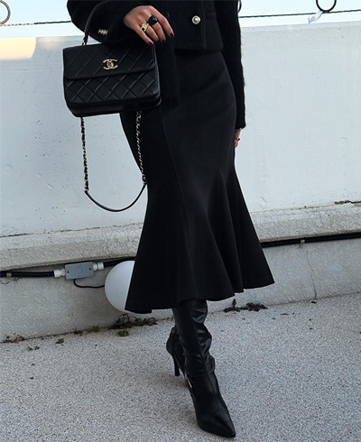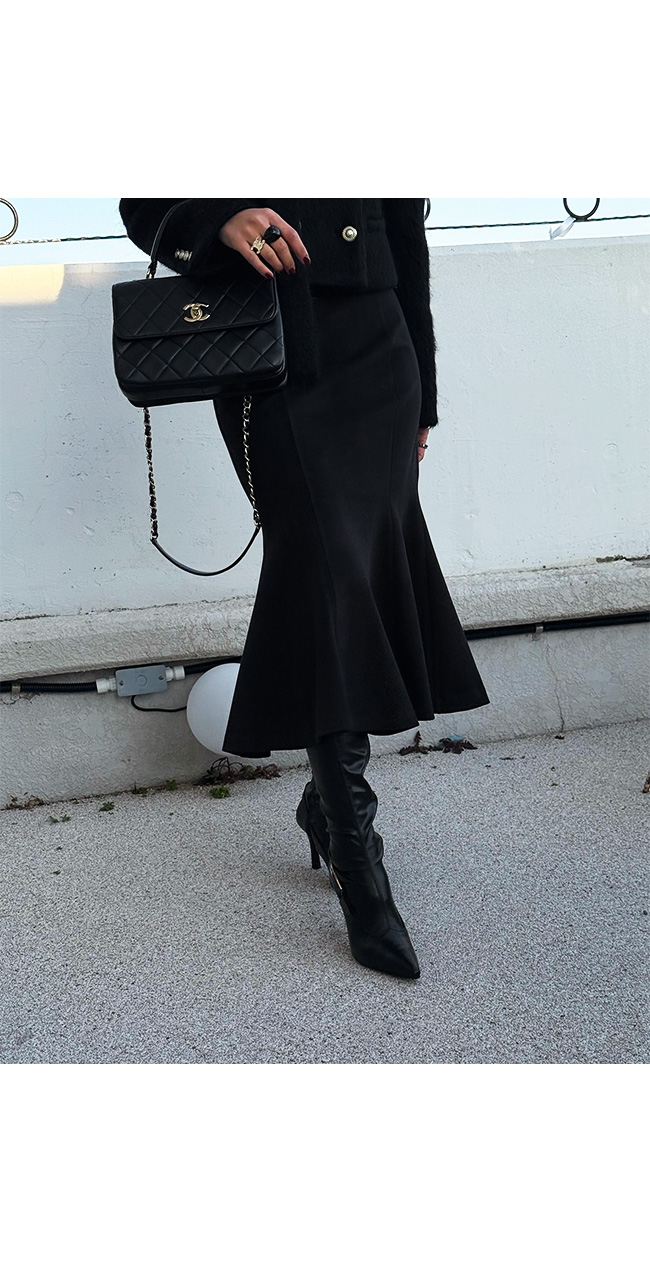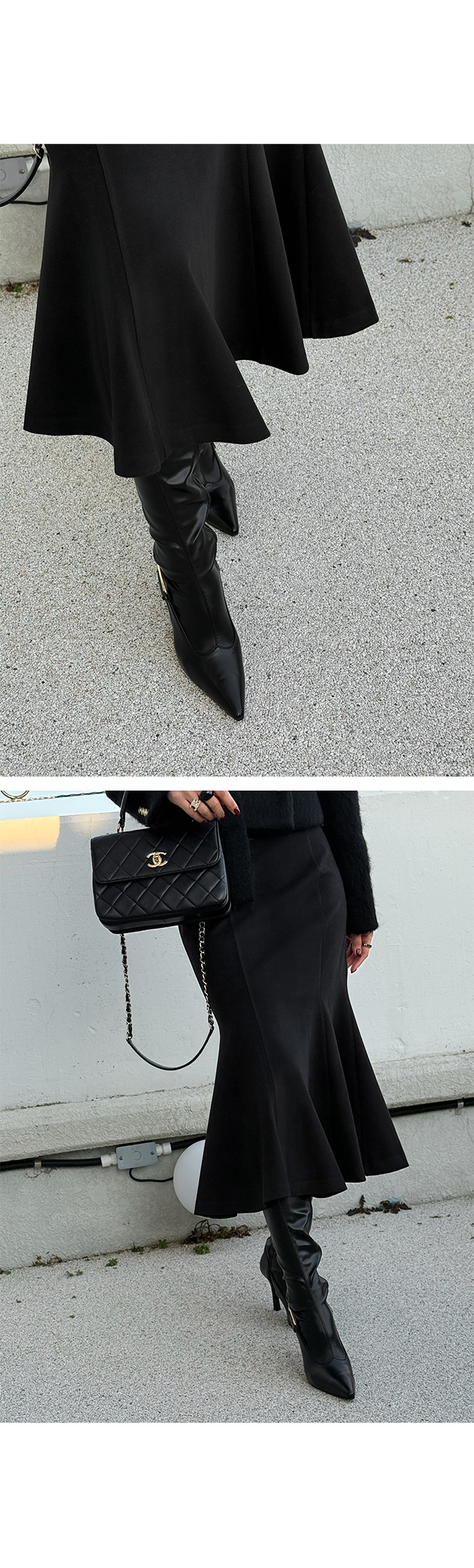 무릎 아래로 자연스럽게 퍼지는 플레어 라인이