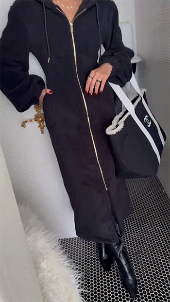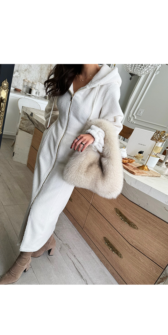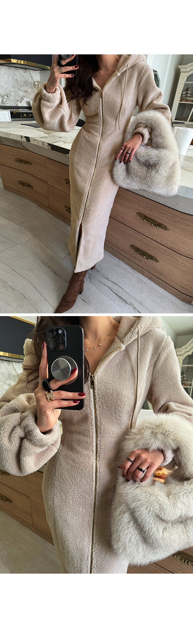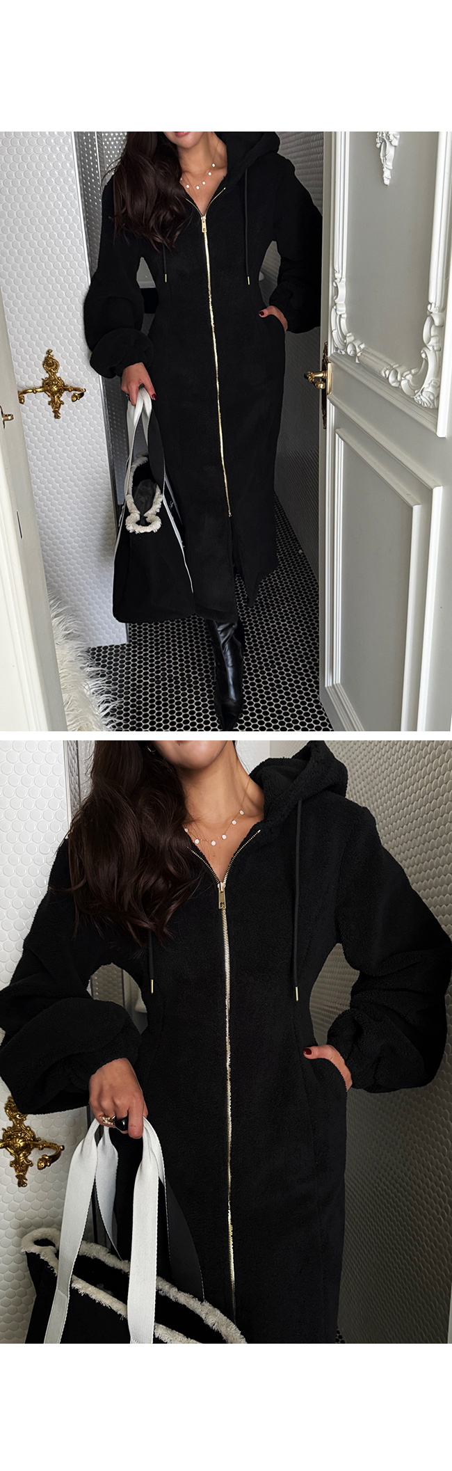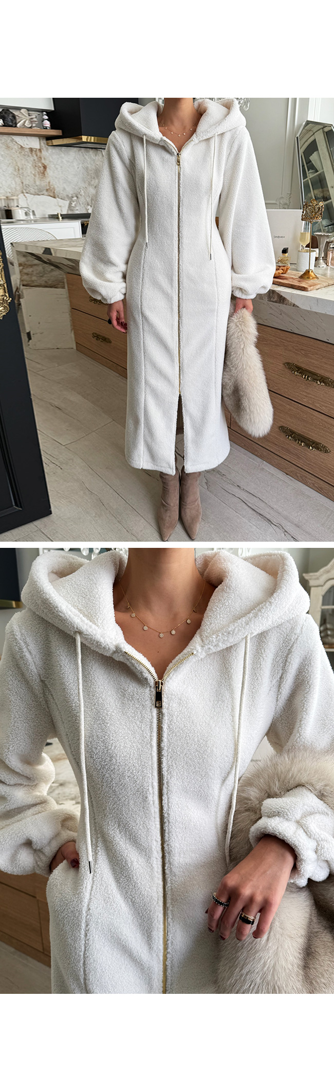 고급스럽게 즐기기 좋은 뽀글이 후드 원피스입니다.