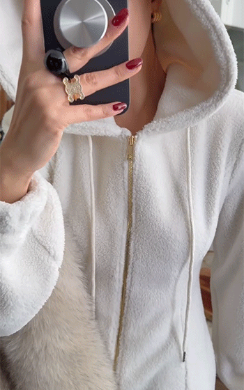 후드 디테일이 얼굴선을 부드럽게 감싸