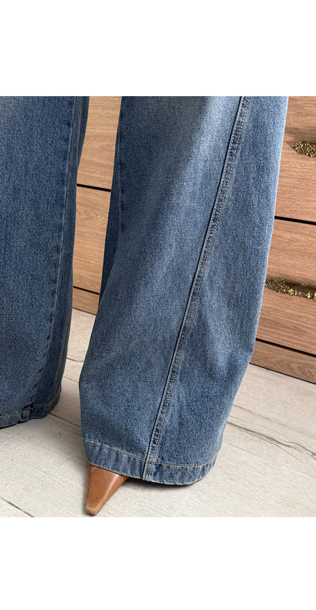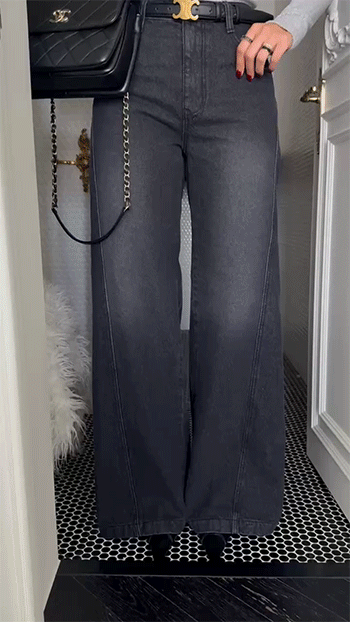 세로 절개 라인과 스트레이트에 가까운 와이드 핏이 더해져