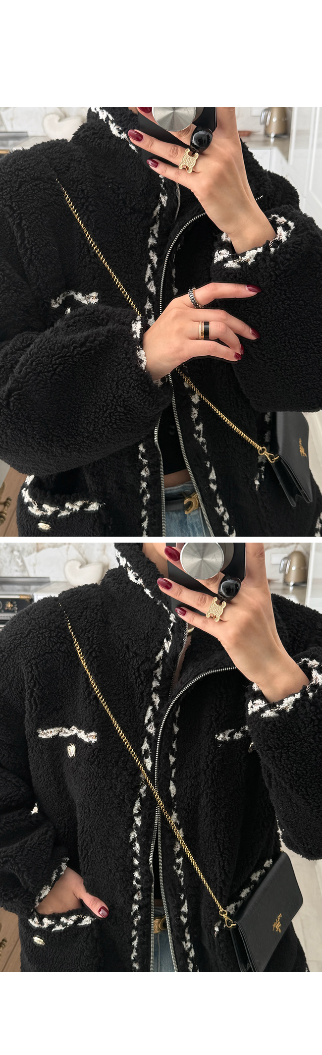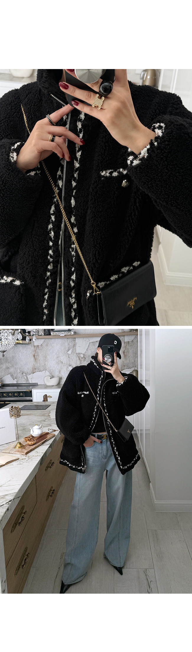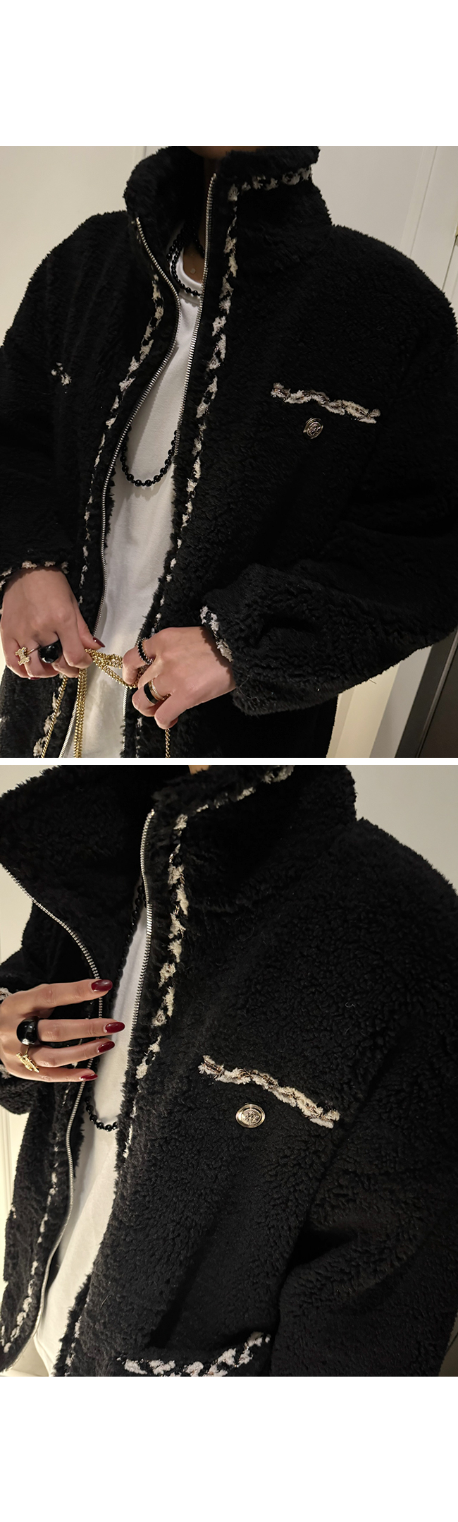 - 안쪽면이 쮸리나 기모가 가공이된 소재감들은 가공 과정에 의해 약간의 먼지가 발생할 수 있으니, 세탁후 입어주세요.