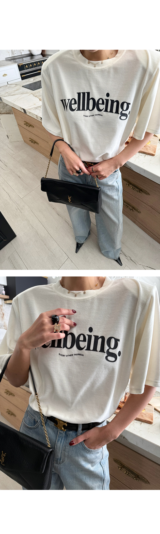 캐주얼한 티셔츠 디자인에도 자연스럽게 고급스러운 무드를 더해주는 아이템이에요.